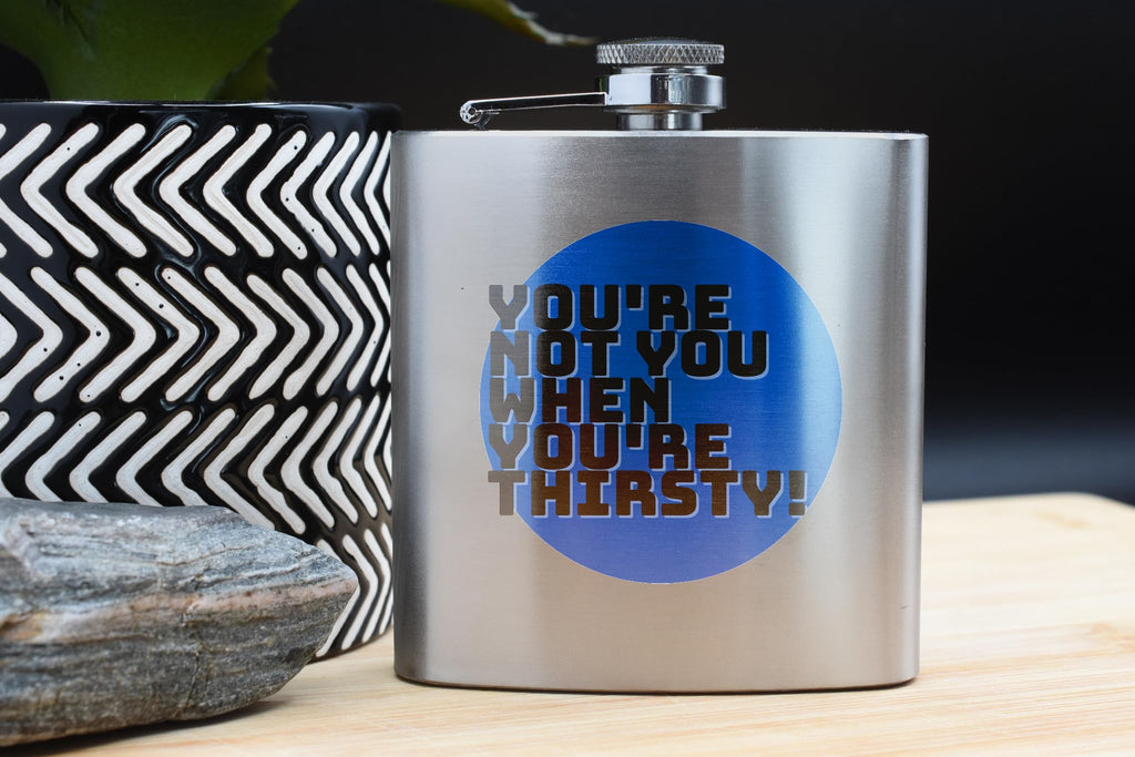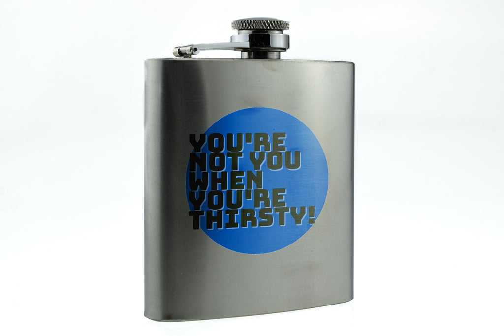 - Stainless steel flask with a funny phrase that reads 'You're not you when you're thirsty'