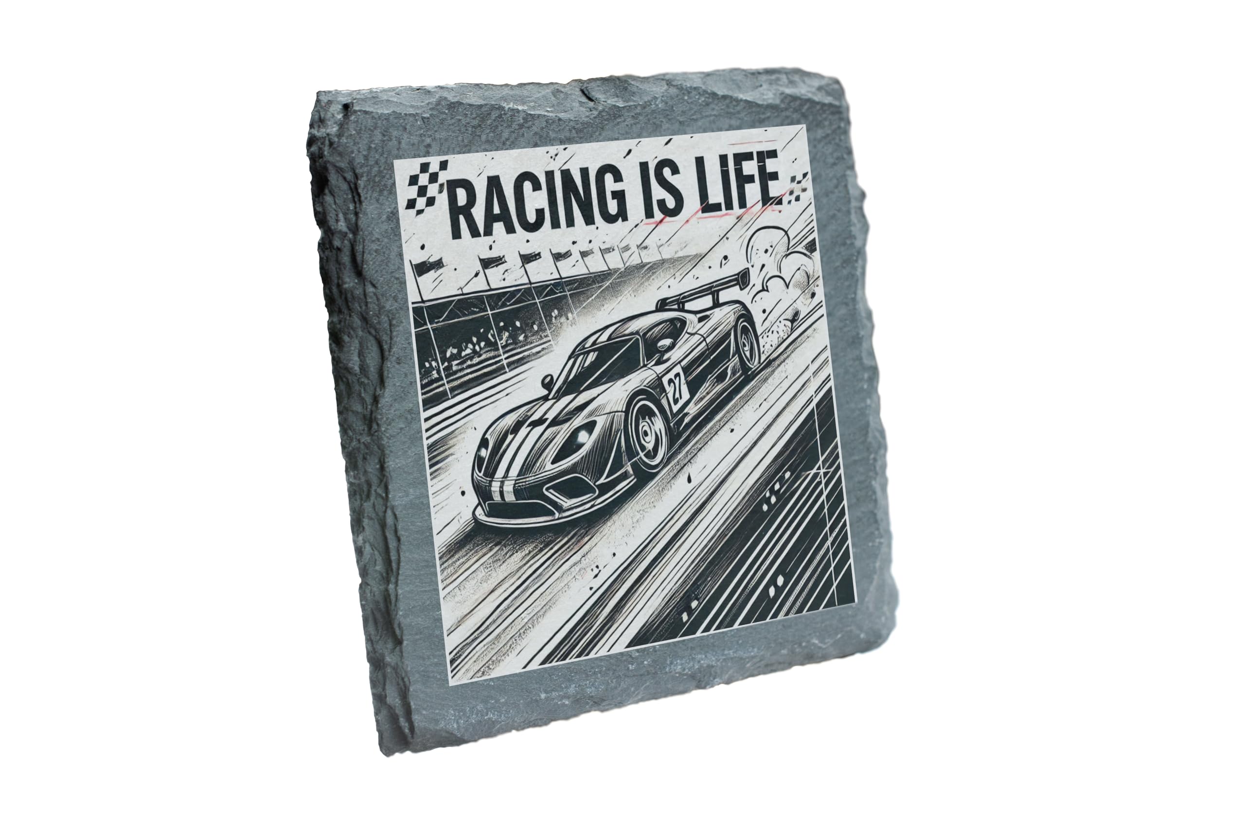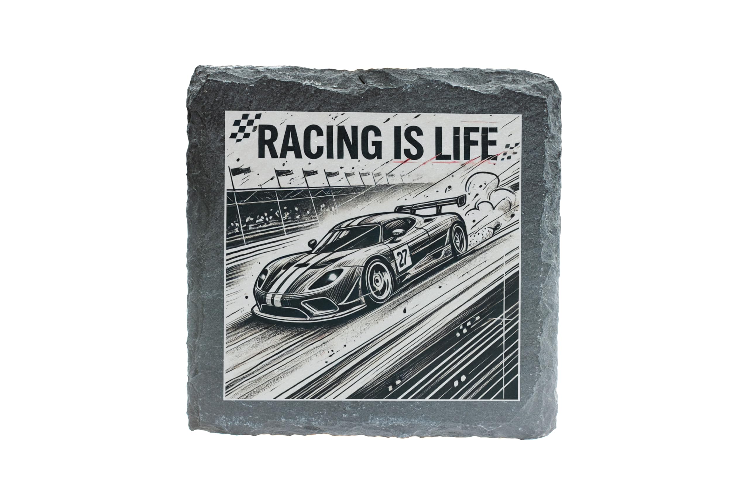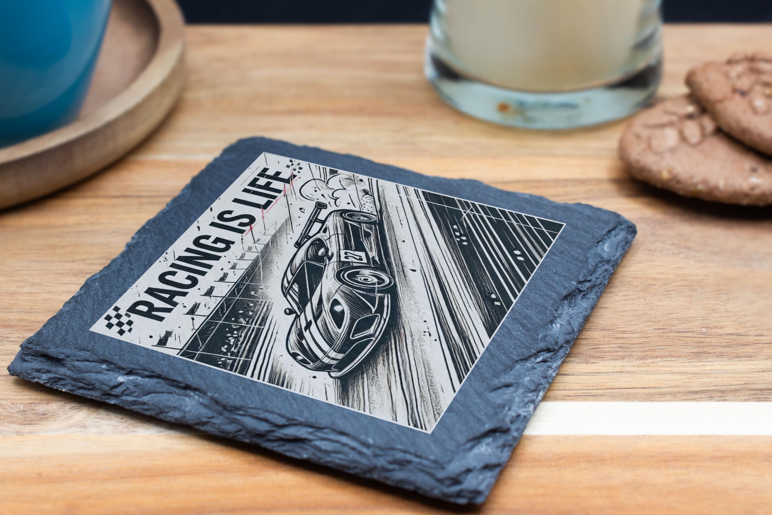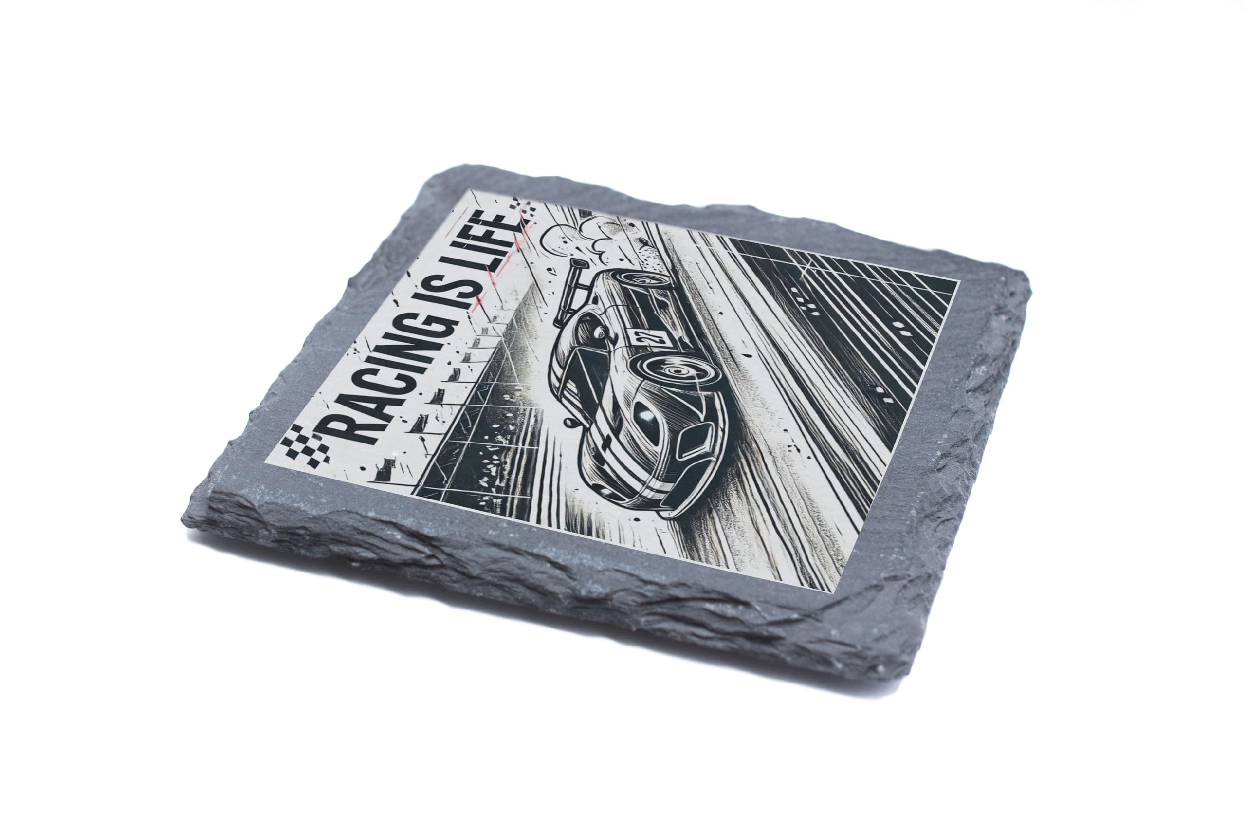 Celebrate the thrill of speed with the "Racing is Life" Slate Coaster, a perfect blend of style and functionality. This coaster showcases a captivating black-and-white illustration of a racing car, accompanied by the bold mantra "Racing is Life." Its striking design makes it a standout accessory for any car enthusiast?s home or workspace. Crafted from premium natural slate, the coaster's rugged edges add a unique charm while effectively protecting your furniture from heat, moisture, and scratches. Whether you're sipping your favorite drink or decorating your coffee table, this piece is designed to impress. It also makes an exceptional gift for motorsport lovers, combining practicality with a statement of passion. Durable, easy to maintain, and undeniably cool, this coaster is a must-have for those who live life in the fast lane.