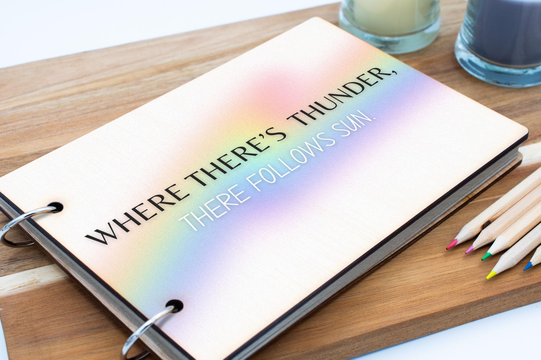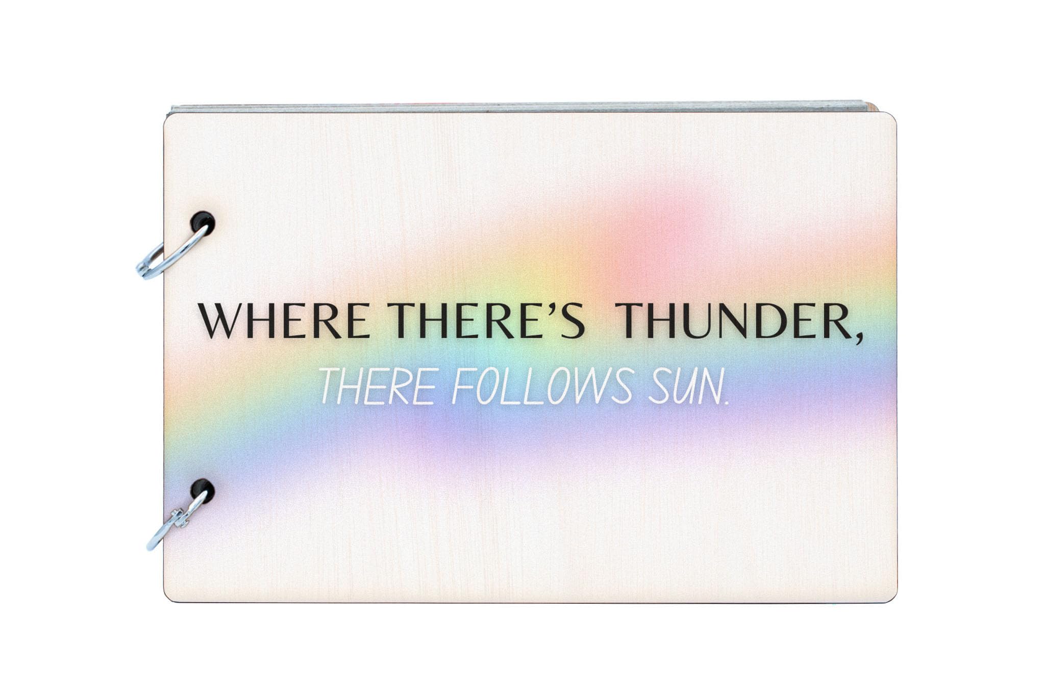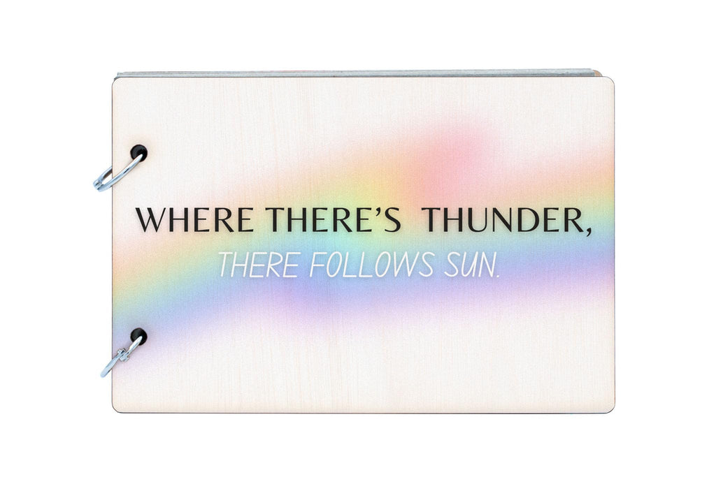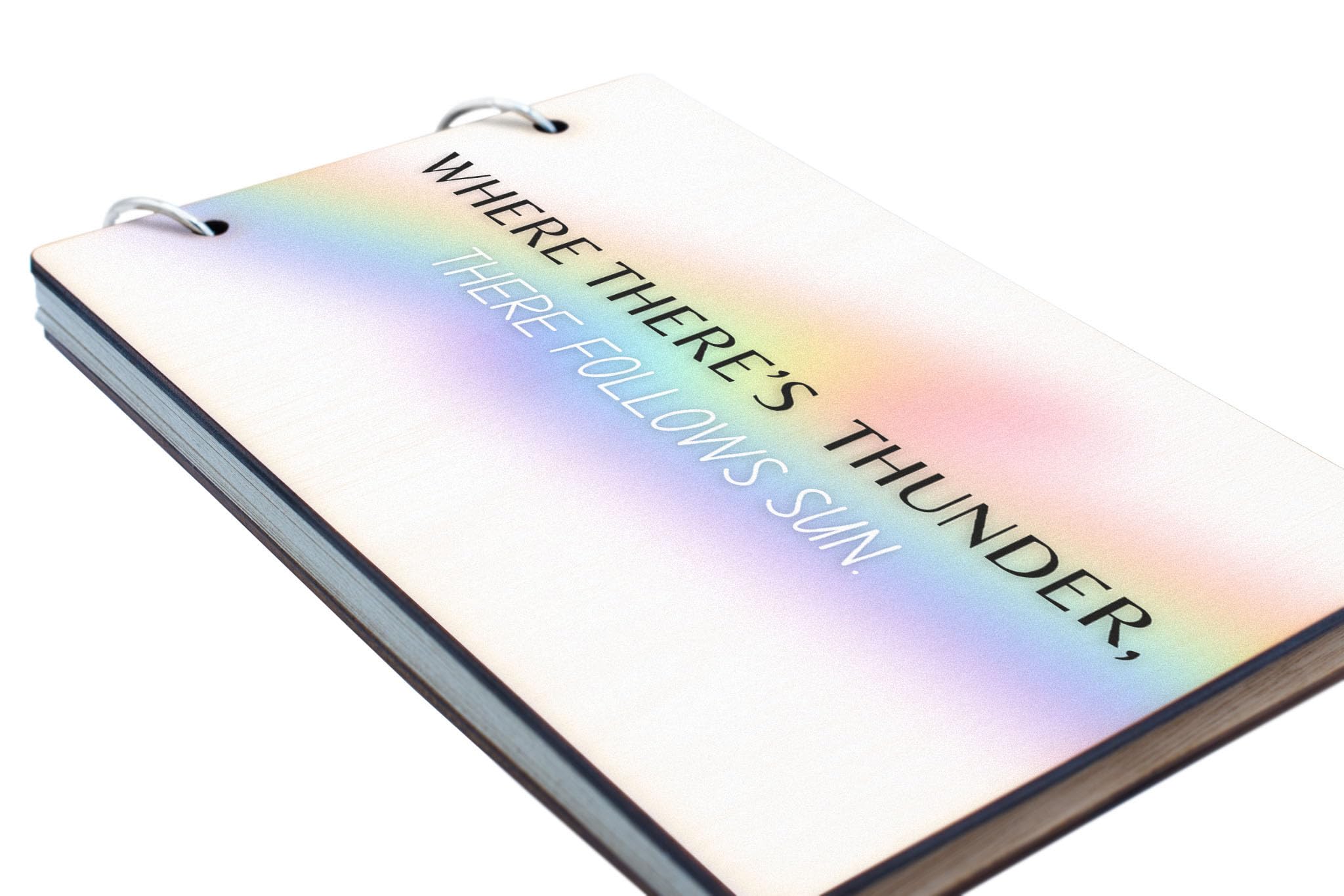 - Made from 25 recycled pages with a wooden cover that reads 'where there's thunder there follows sun'