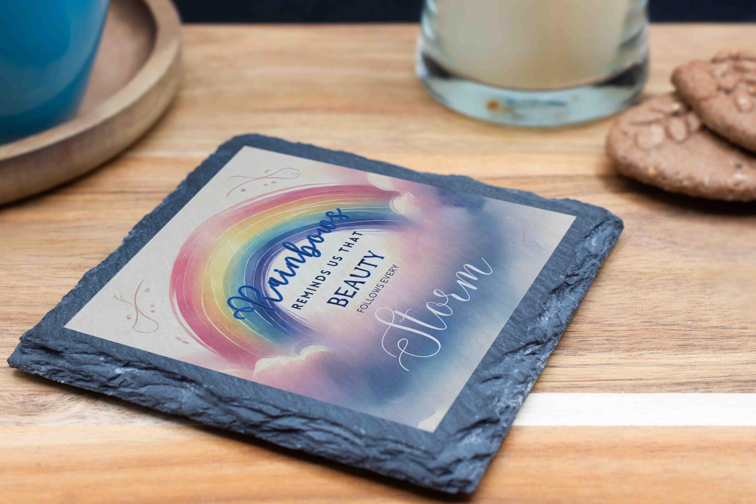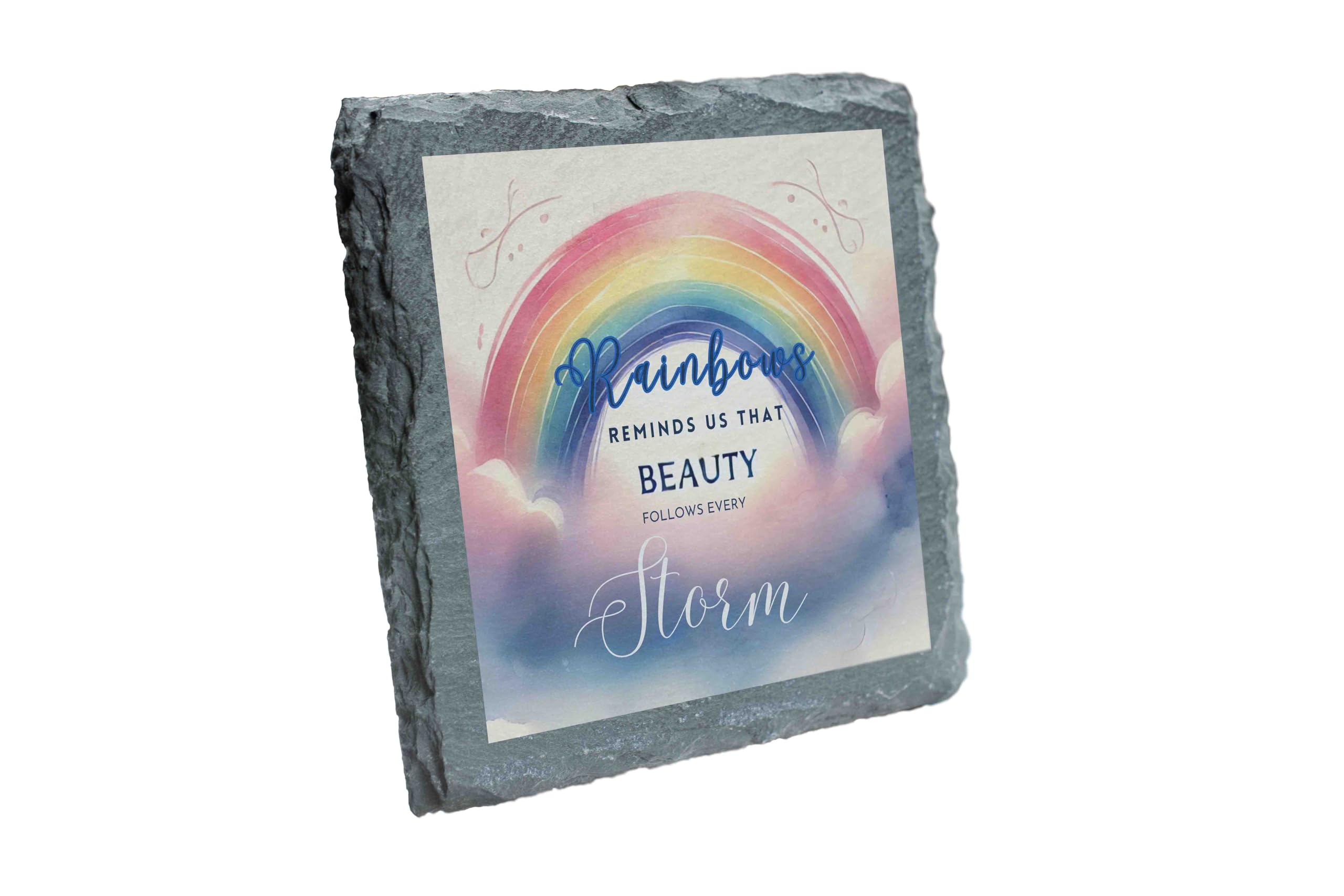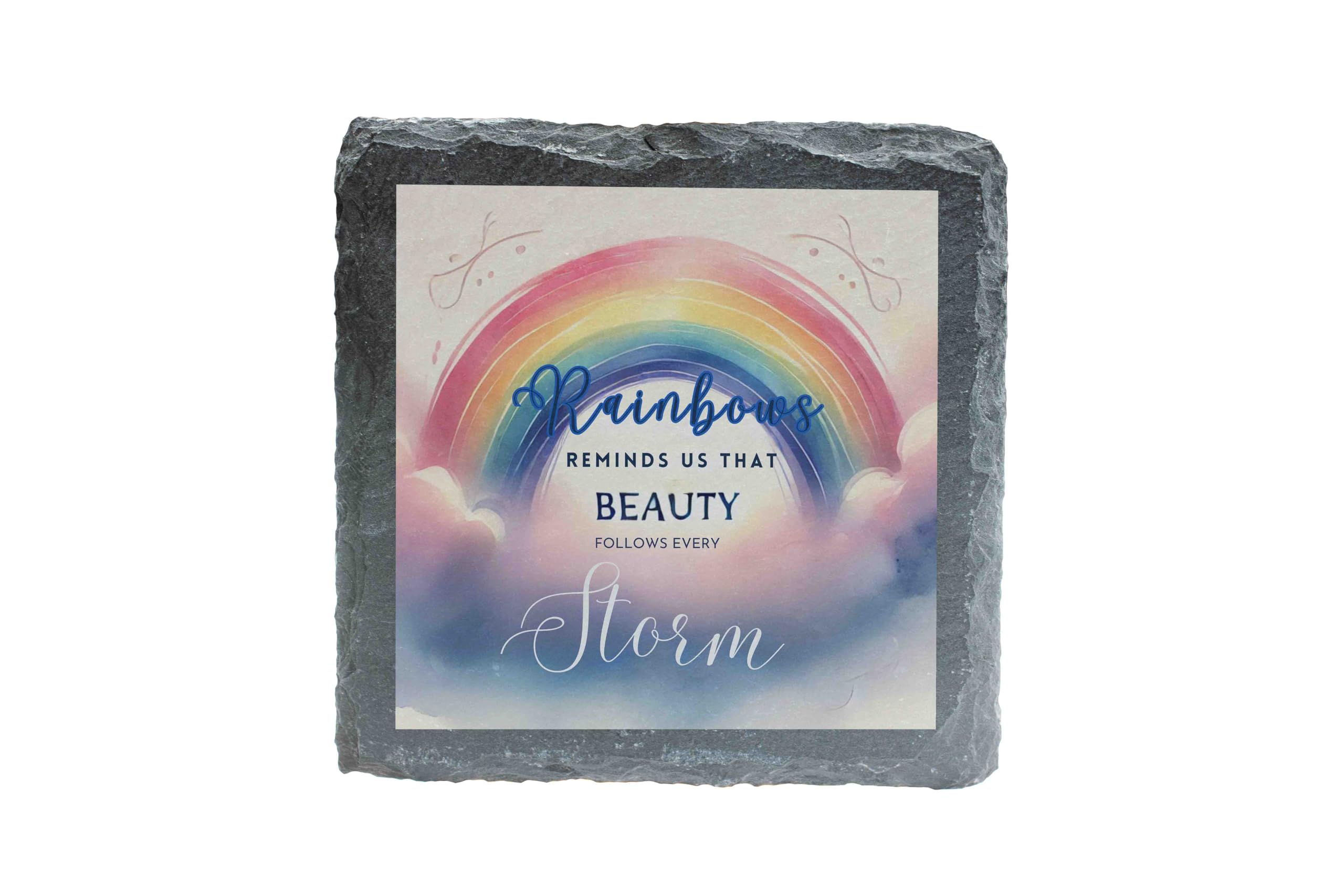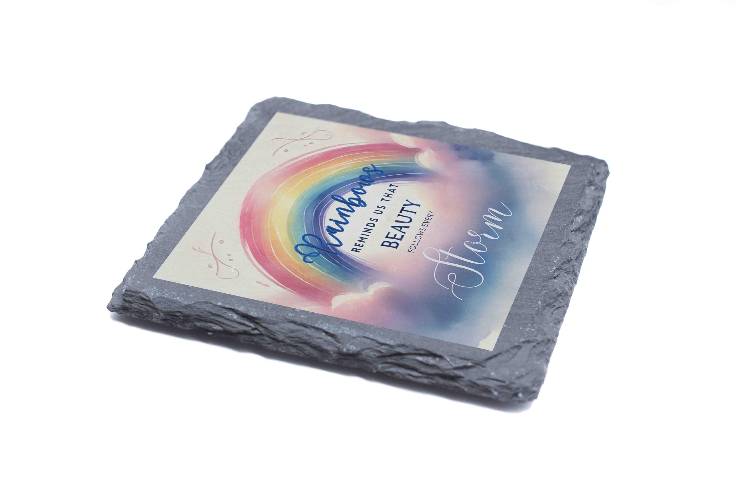 Celebrate hope and resilience with this elegant slate coaster, adorned with a colorful rainbow and an inspiring quote: "Rainbows remind us that beauty follows every storm." This beautifully designed coaster not only serves a functional purpose by protecting surfaces but also delivers a meaningful message of positivity and strength. Made from natural slate, it features a textured, rustic edge and a smooth finish that enhances its aesthetic appeal. Perfect as a gift or a personal keepsake, this coaster brings a touch of elegance and inspiration to any space. Whether for your home, office, or a special occasion, it?s a timeless reminder of life?s brighter moments after the storms.