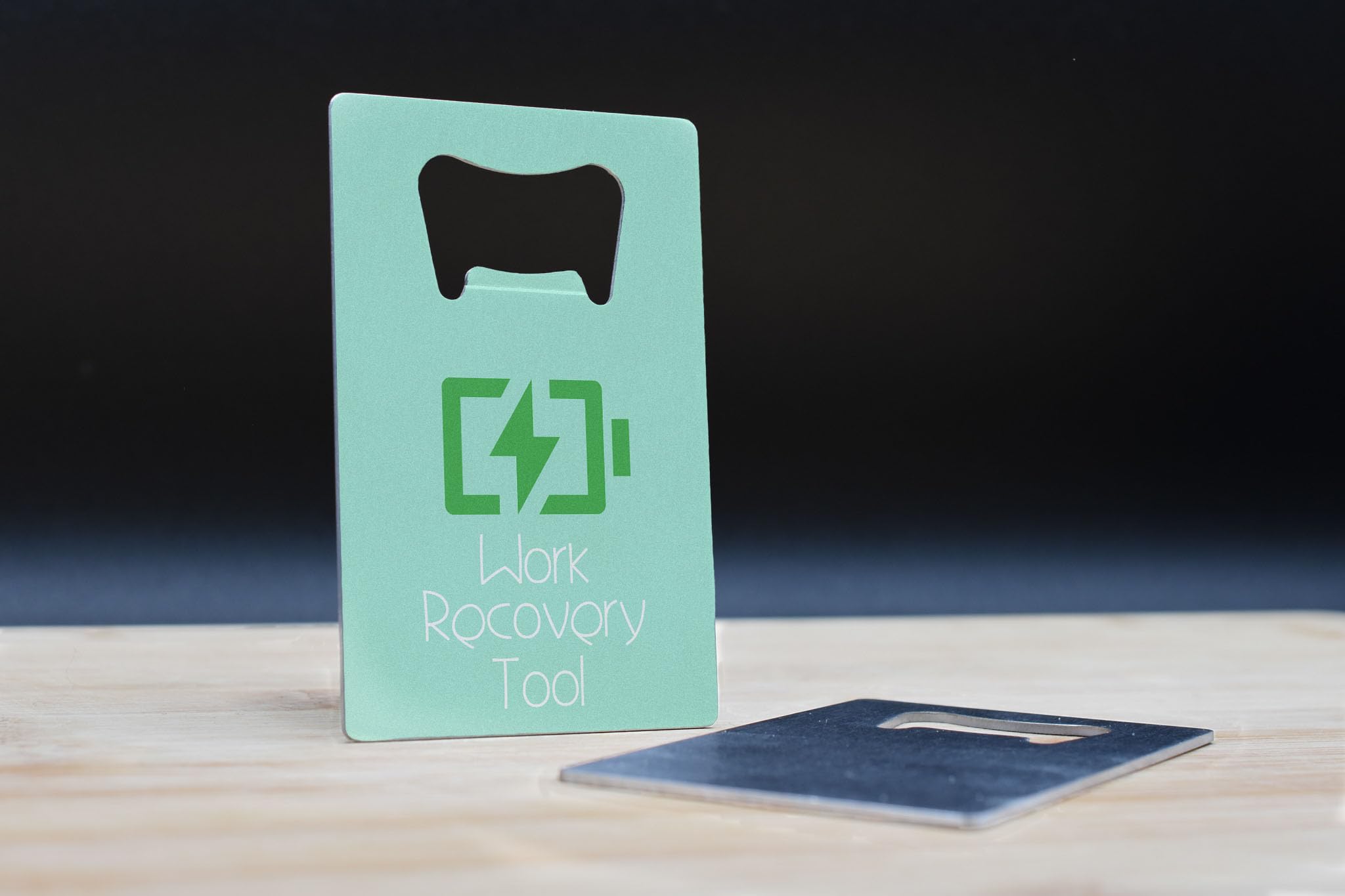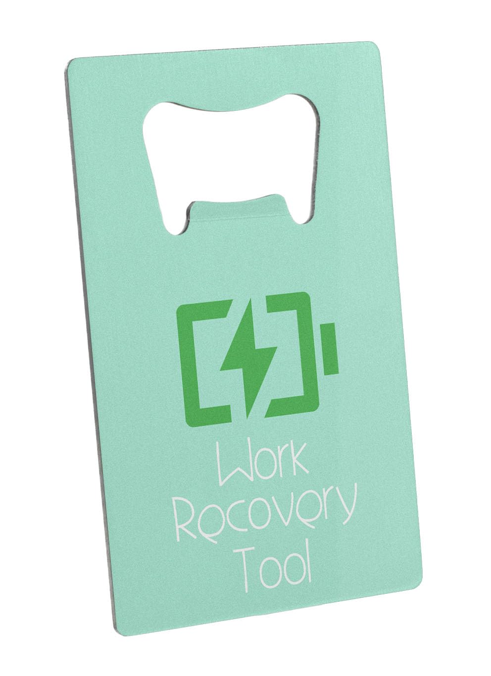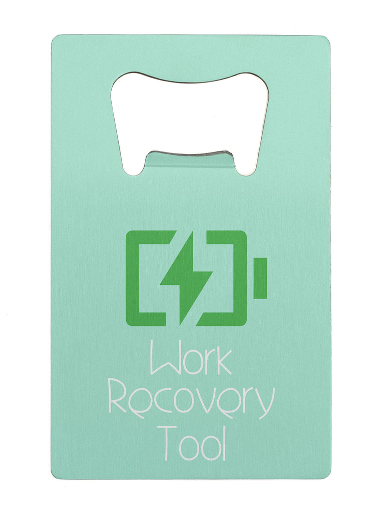 Introducing our Recharge-themed Work Recovery Tool Bottle Opener, a fun and unique accessory for professionals looking to unwind after a long day at the office. This stainless steel bottle opener features a playful green and white design with a battery icon, making it the perfect relaxation gadget to have on hand. Whether you're enjoying a cold beer at home or at the bar, this end-of-day drink tool is sure to bring a smile to your face. Treat yourself or a coworker to this cool work gift that doubles as a stress relief bottle opener. The uv printed design reads 'work recovery tool' in vibrant colours, making it a standout piece for any desk to bar transition.