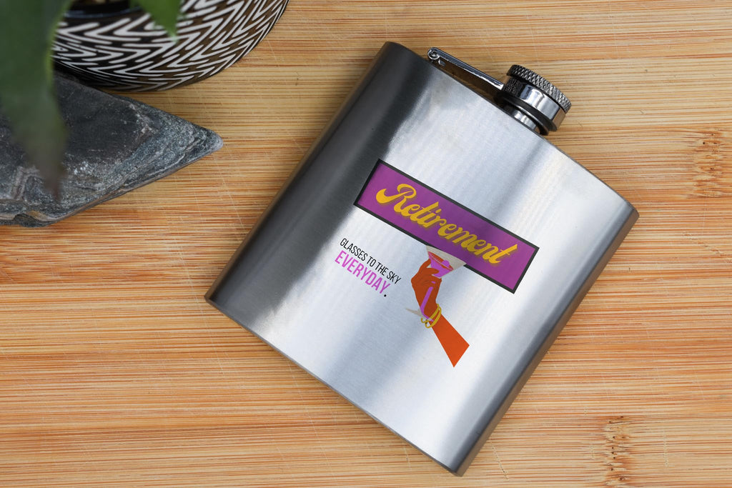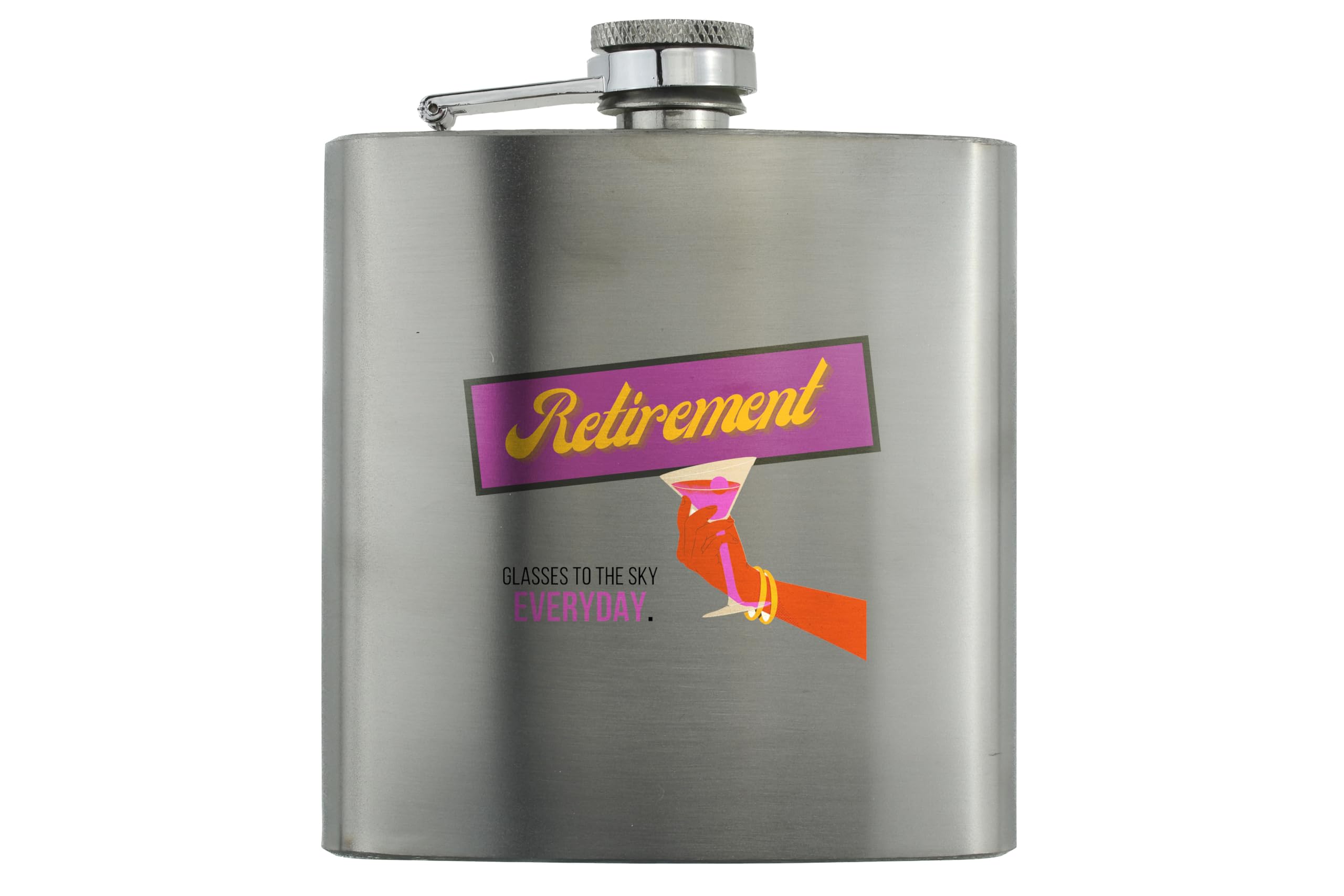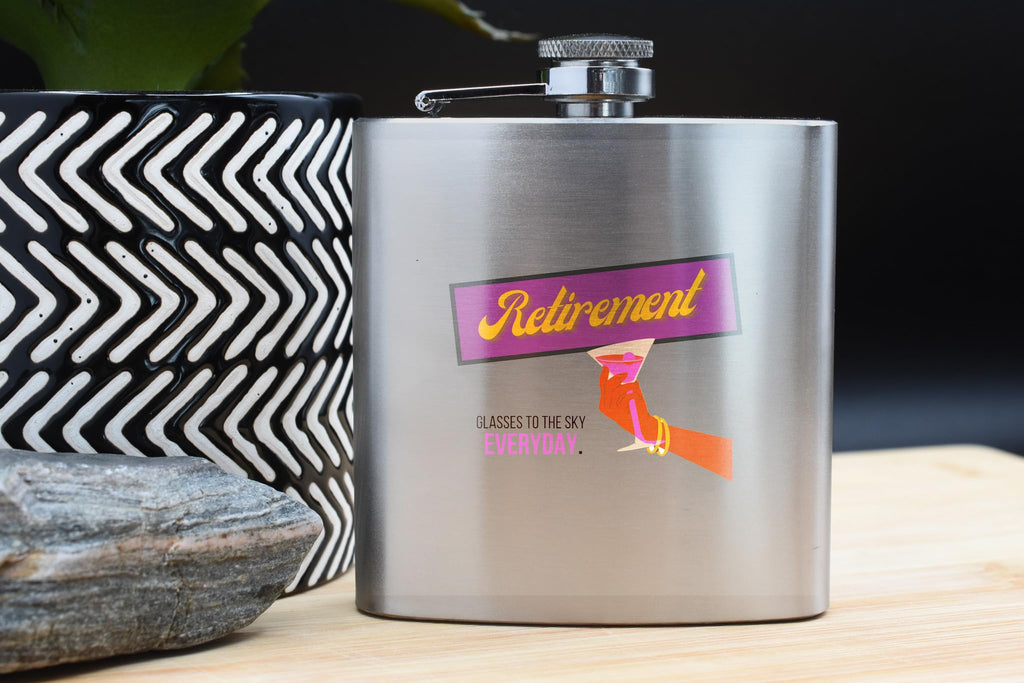- Reads Retirement Glasses to the Sky Everyday: This flask captures the spirit of retirement with its unique message. The colourful design features the text 'Retirement Glasses to the Sky Everyday,' reminding the recipient to embrace their newfound freedom and enjoy life to the fullest.