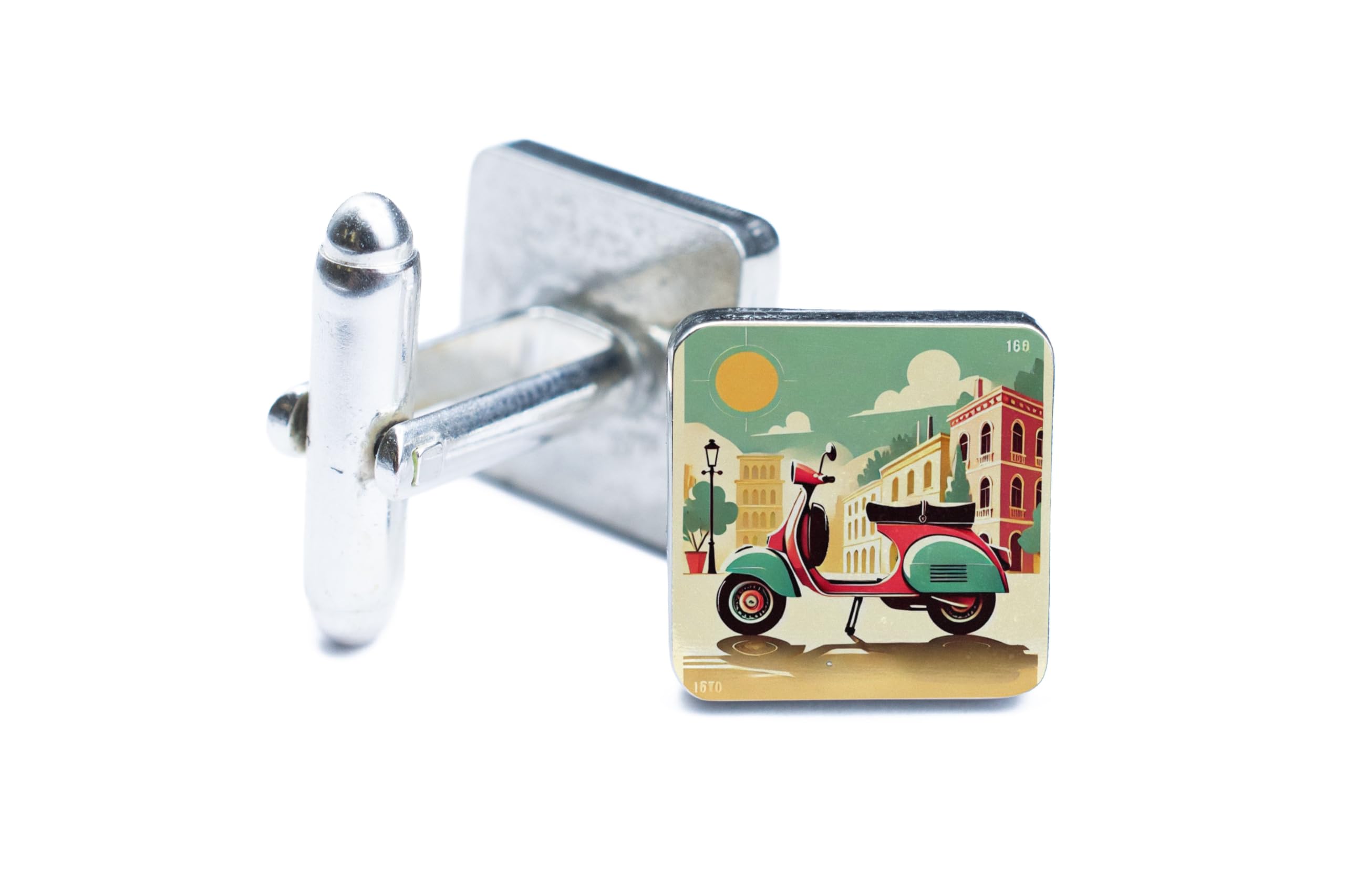 Bring a touch of Italian flair to your outfit with these Retro Vespa Scooter cufflinks. Featuring a colorful and detailed illustration of a classic Vespa set against a picturesque cityscape, these cufflinks exude vintage elegance and timeless charm. Crafted from high-quality materials with a vibrant enamel finish, these cufflinks are built to last while adding a pop of personality to your wardrobe. Whether you're attending a wedding, a business meeting, or a casual gathering, they make a stylish statement for any occasion. These cufflinks make a thoughtful gift for Vespa enthusiasts, travelers, or anyone who loves retro designs. The secure toggle closure ensures they stay in place, providing all-day comfort and confidence. Celebrate the spirit of travel and style with these one-of-a-kind cufflinks!