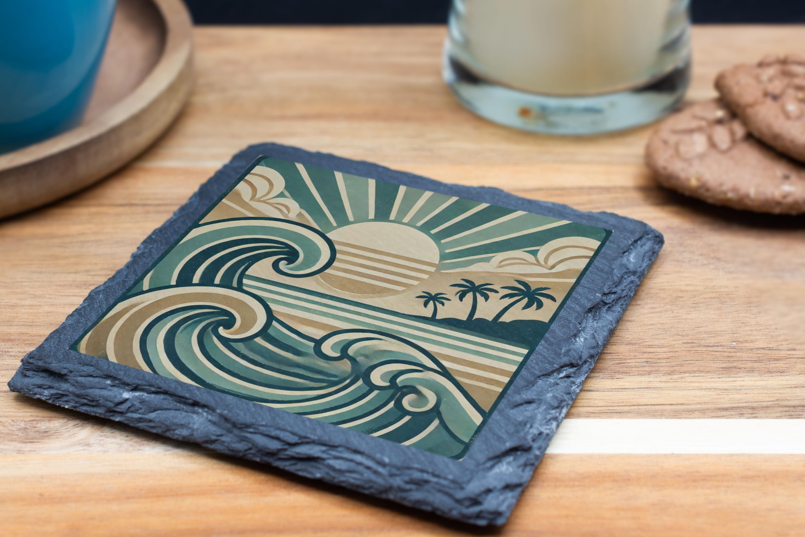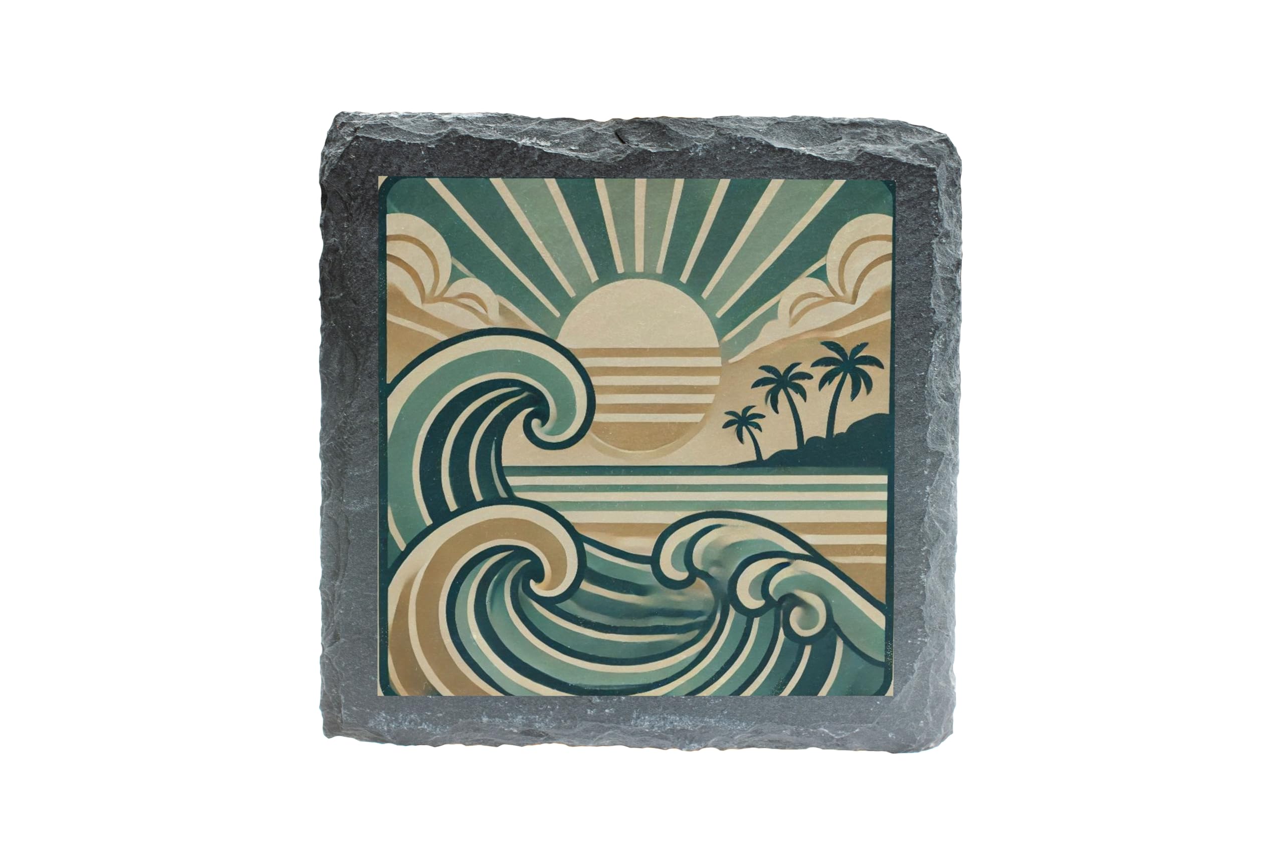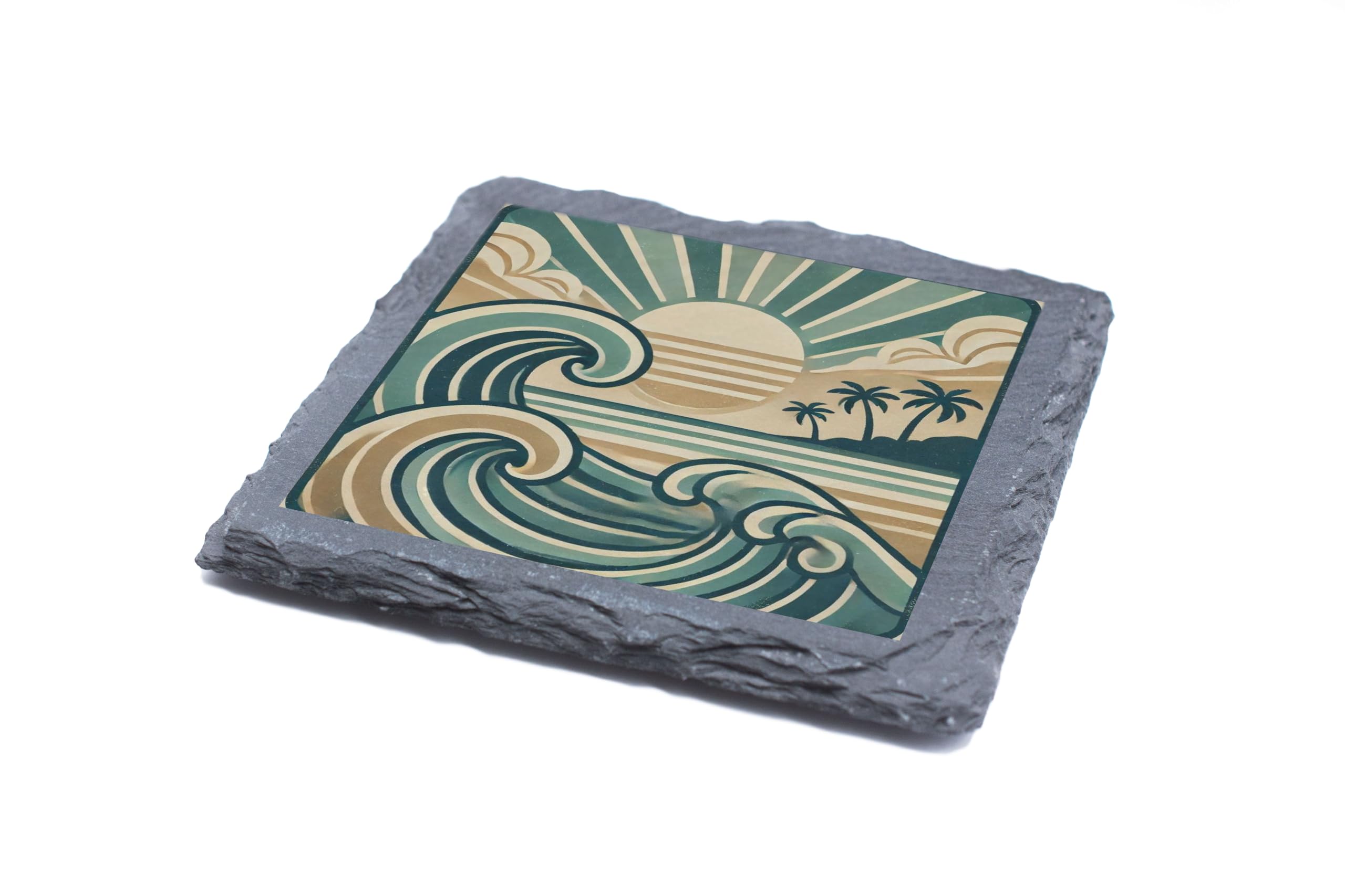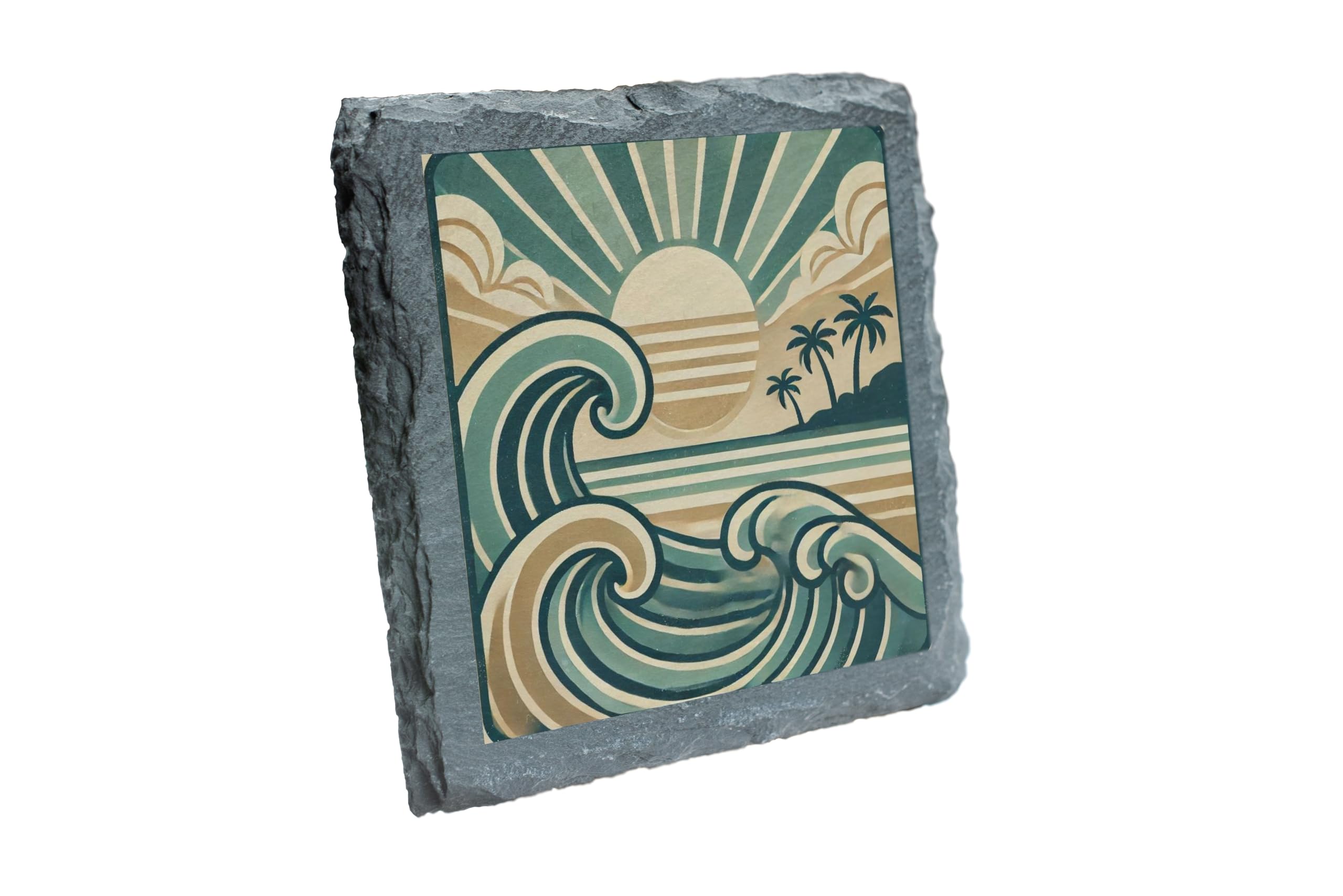 Bring the calming beauty of the beach to your home with this Retro Waves Slate Coaster. Showcasing an elegant vintage-style illustration of curling ocean waves, a glowing sunset, and iconic palm trees, this coaster exudes a timeless coastal charm that perfectly complements any decor style. Crafted from durable, natural slate, it is designed to protect your tables and surfaces from drink rings and spills while adding a touch of rustic sophistication. The coaster?s smooth finish and bold design make it ideal for both functional use and decorative display. Whether you're enjoying a cool drink on a warm summer day or searching for a unique gift for a beach enthusiast, this Retro Waves Slate Coaster is the perfect blend of practicality and aesthetic appeal. Let it transport you to the seaside with every sip!