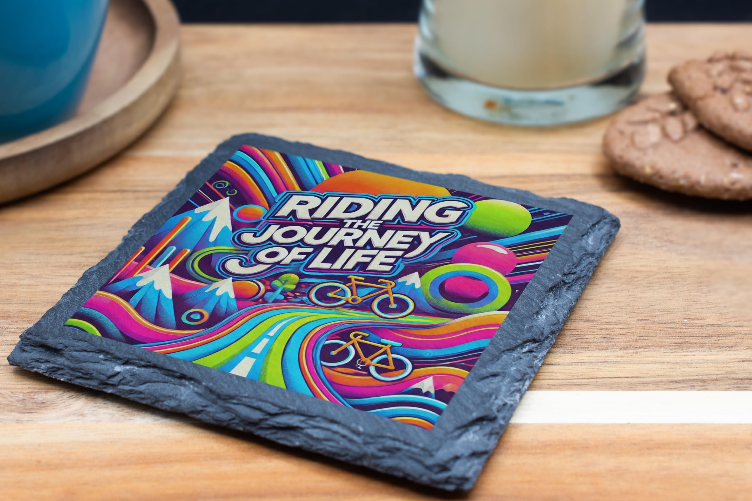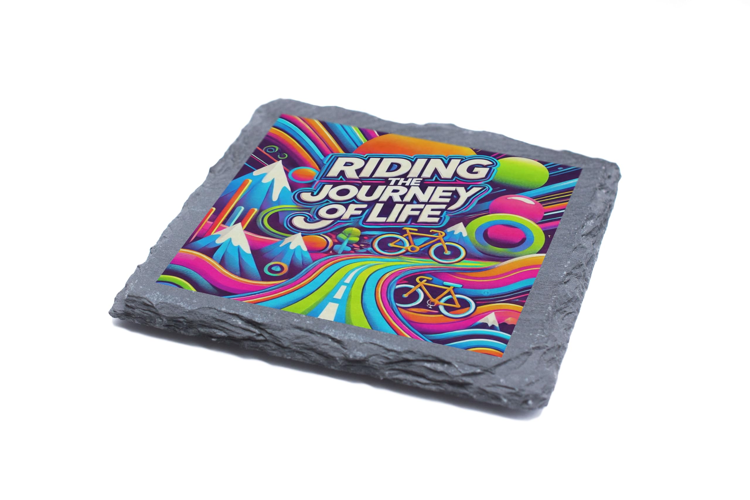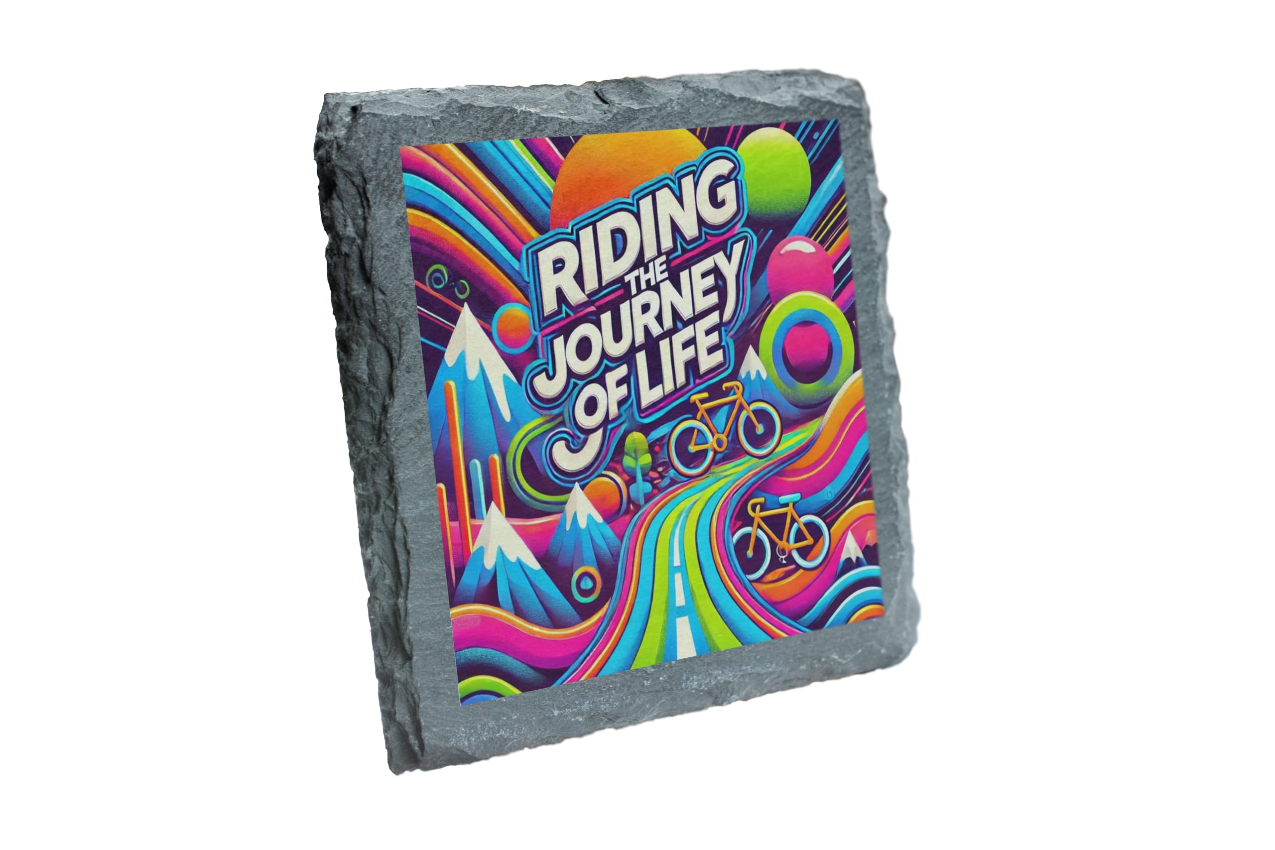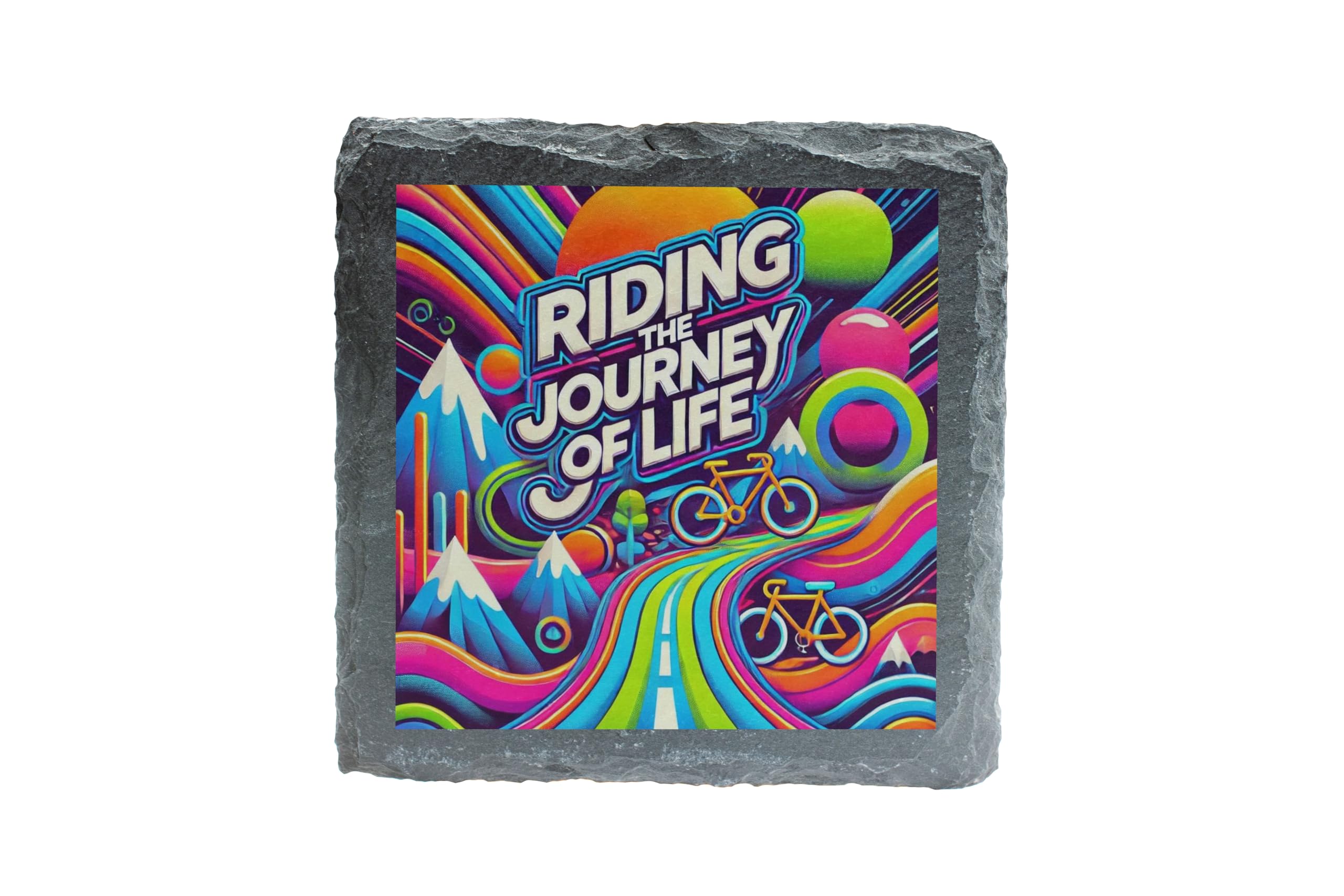 - Dynamic Bicycle Design: Showcase your love for cycling with this bold and colorful "Riding the Journey of Life" slate coaster, perfect for bikers and adventurers.