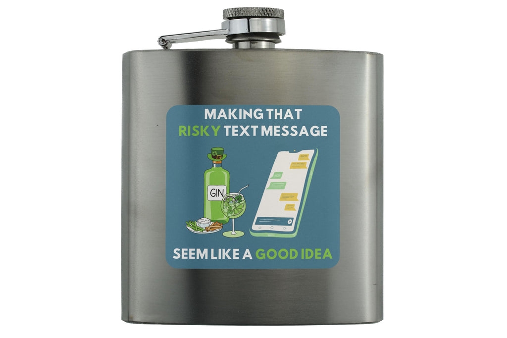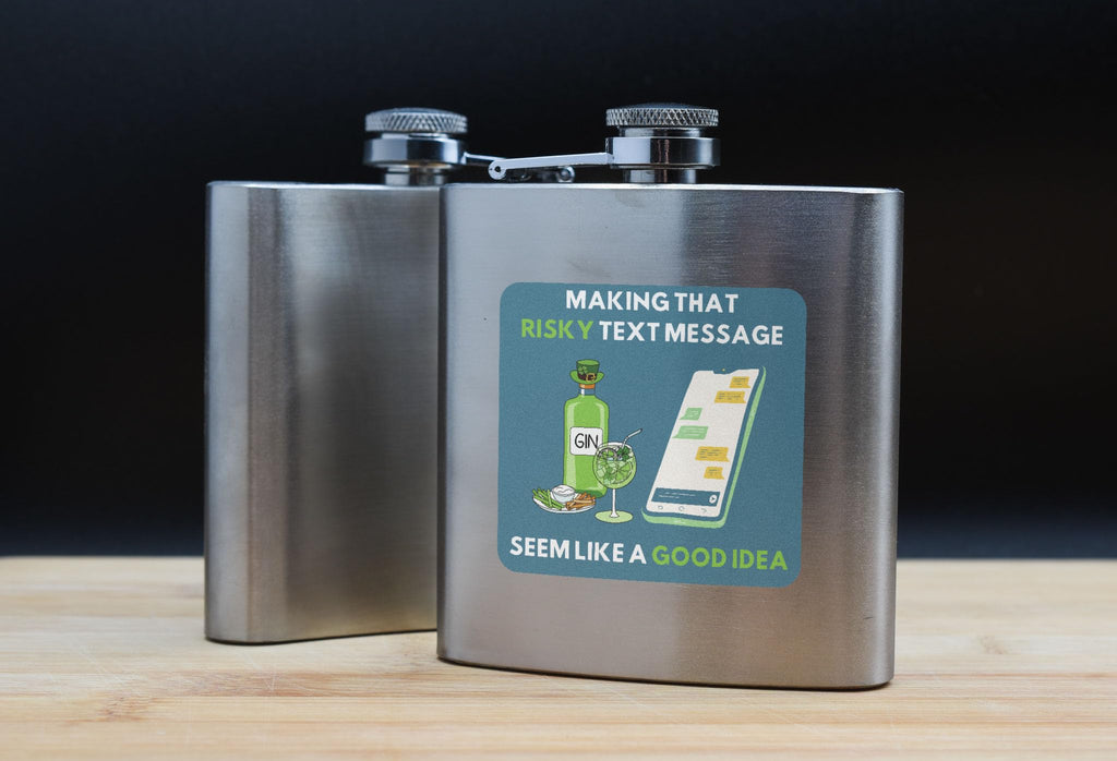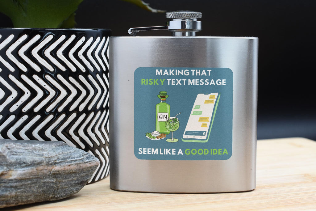 Introducing our Risky Text Message Gin Humour Flask, the perfect accessory for any gin lover with a sense of humour! This stainless steel flask features a UV printed design that reads 'making that risky text message seem like a good idea'. The full colour printed flask showcases a funny text message themed design that is sure to bring a smile to your face. Whether you're out at a party or just enjoying a night in, this flask is a great conversation starter and a fantastic gift for anyone who enjoys a good laugh. Don't let drinking mishaps get the best of you - embrace the alcohol and texting humour with our Risky Text Message Gin Humour Flask.