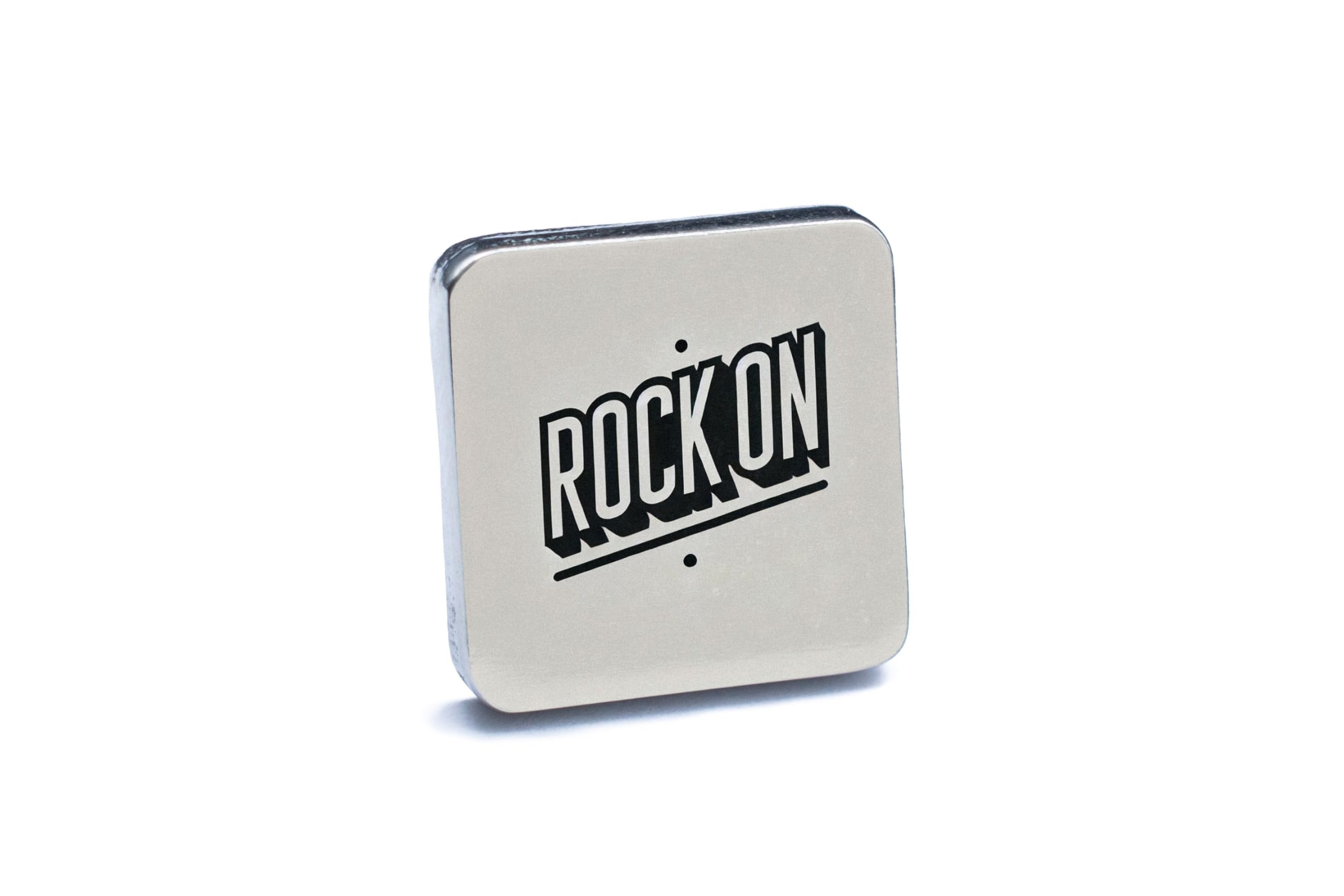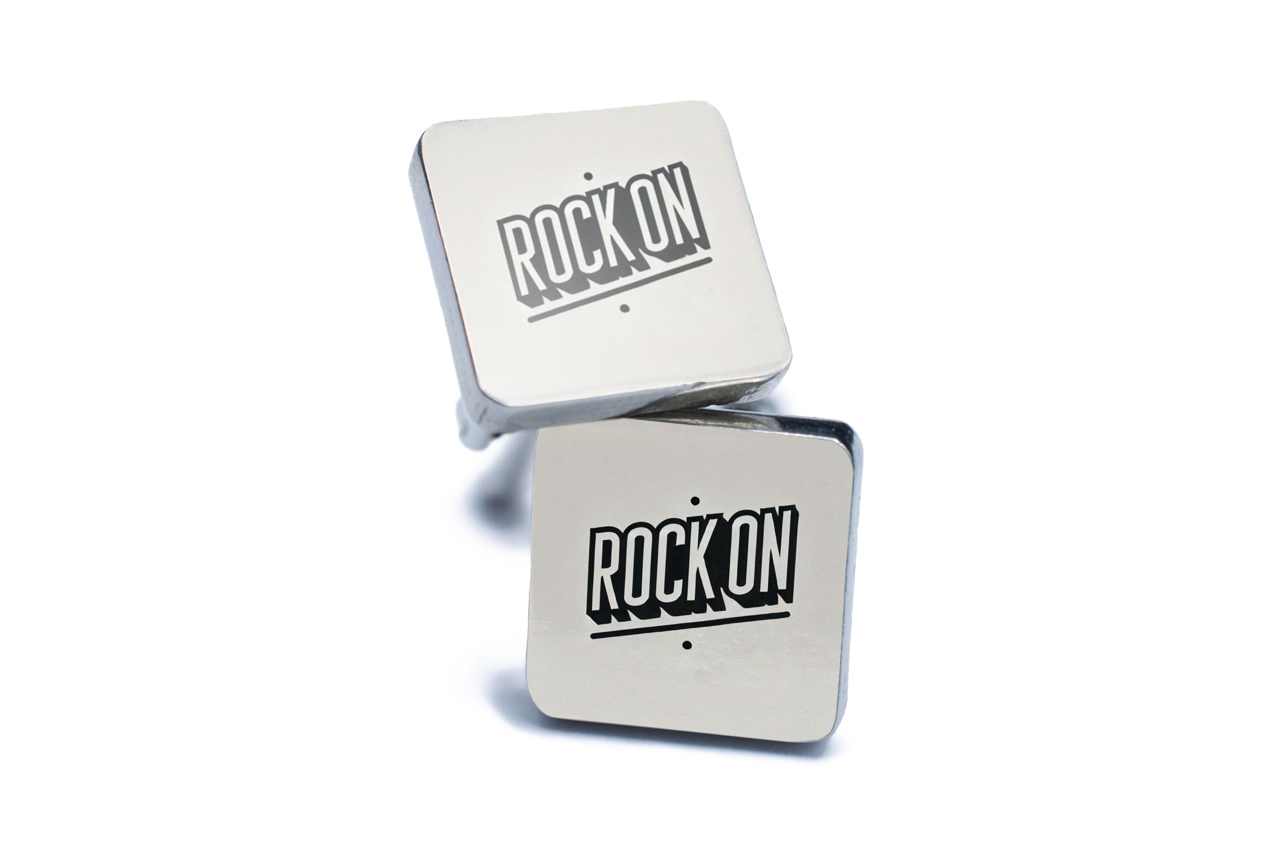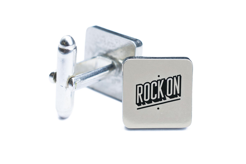 • Handcrafted tin and pewter cufflinks with a UV-printed design featuring the 'rock on' slogan
