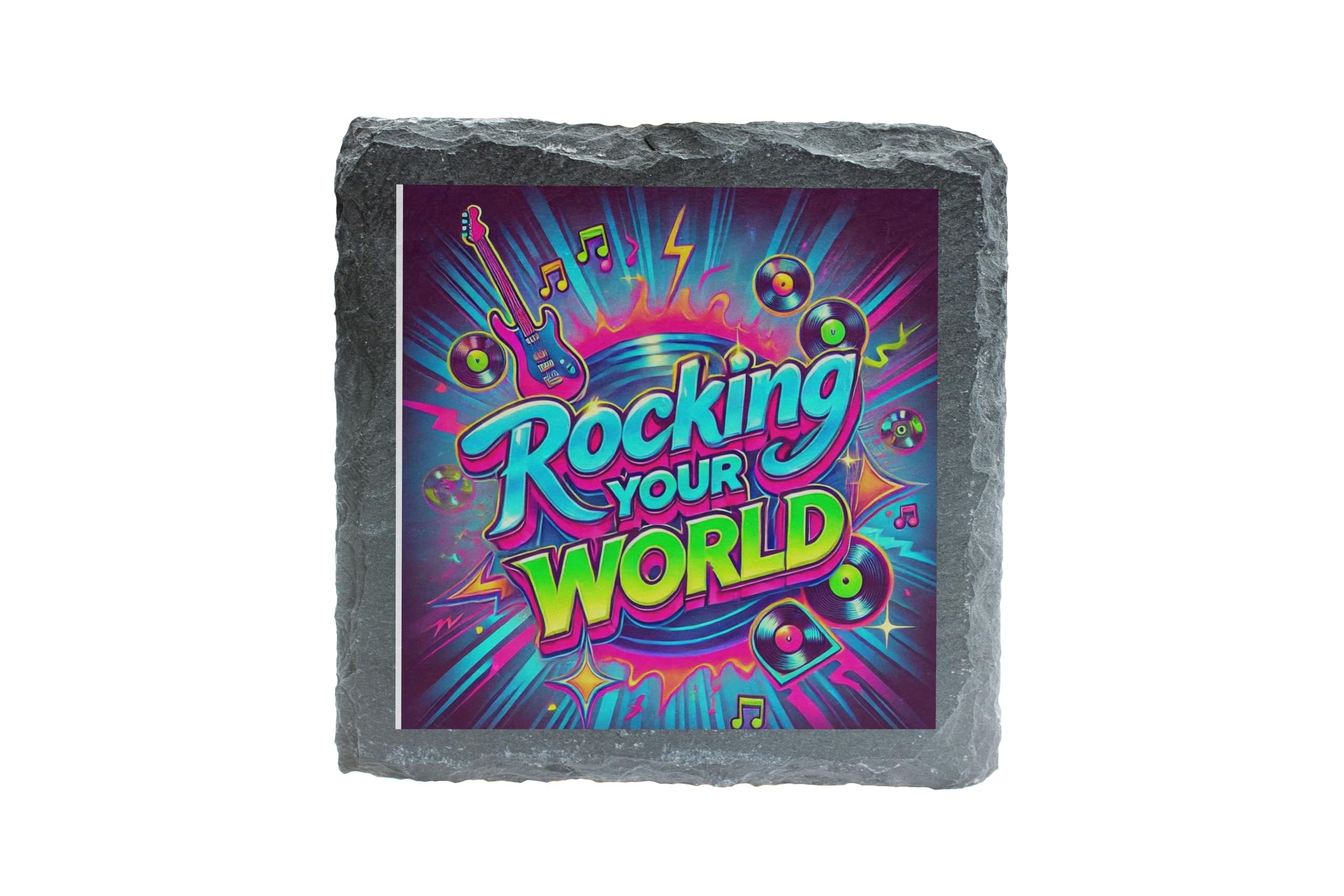 Let the rhythm of life inspire you with the "Rocking Your World" Slate Coaster. This eye-catching coaster boasts a neon-style music design featuring bold typography, guitars, records, and vibrant colors, bringing energy and excitement to your home d?cor. Whether you're a music lover, a retro aesthetic enthusiast, or someone who loves bold accents, this coaster is the perfect pick. Crafted from premium natural slate, this coaster is both stylish and practical. Its sturdy material ensures protection for your surfaces from spills, heat, and scratches, while its 10x10 cm size accommodates most drinkware. It's an ideal accessory for music-themed rooms, entertainment spaces, or just to showcase your love for great tunes. Whether as a housewarming gift, birthday present, or personal treat, the "Rocking Your World" Slate Coaster strikes the perfect chord with its lively and unique design. Rock on!