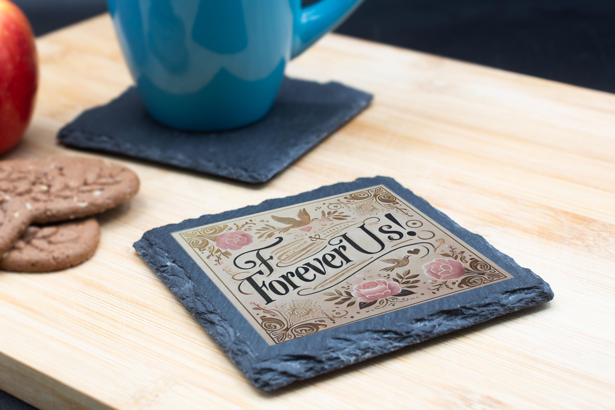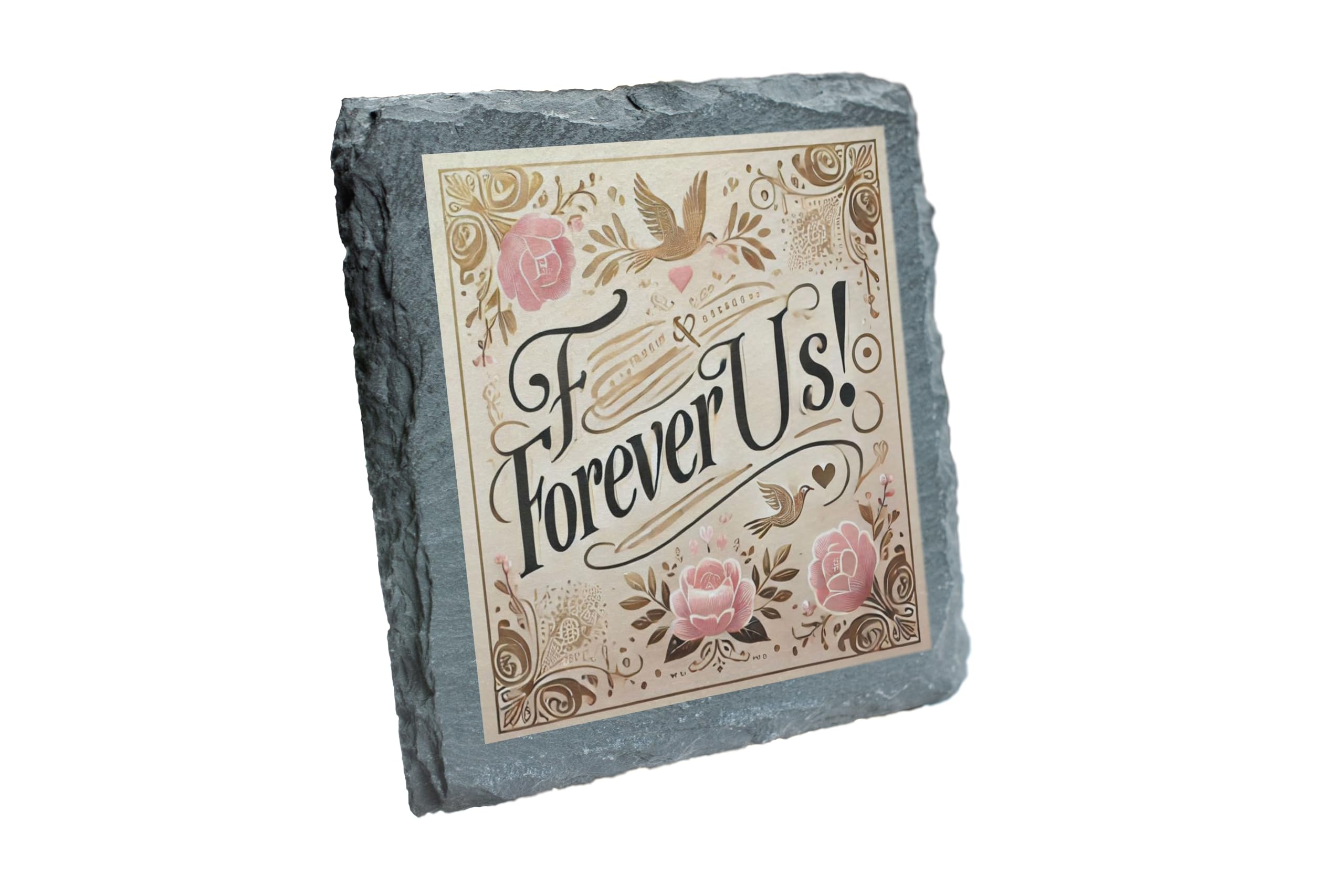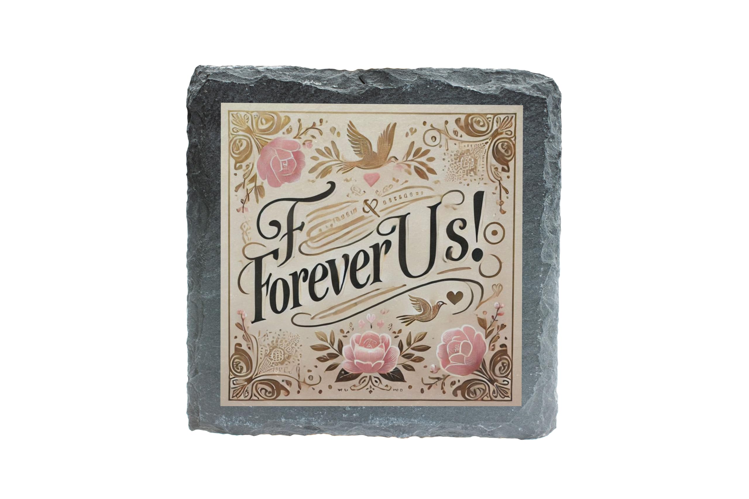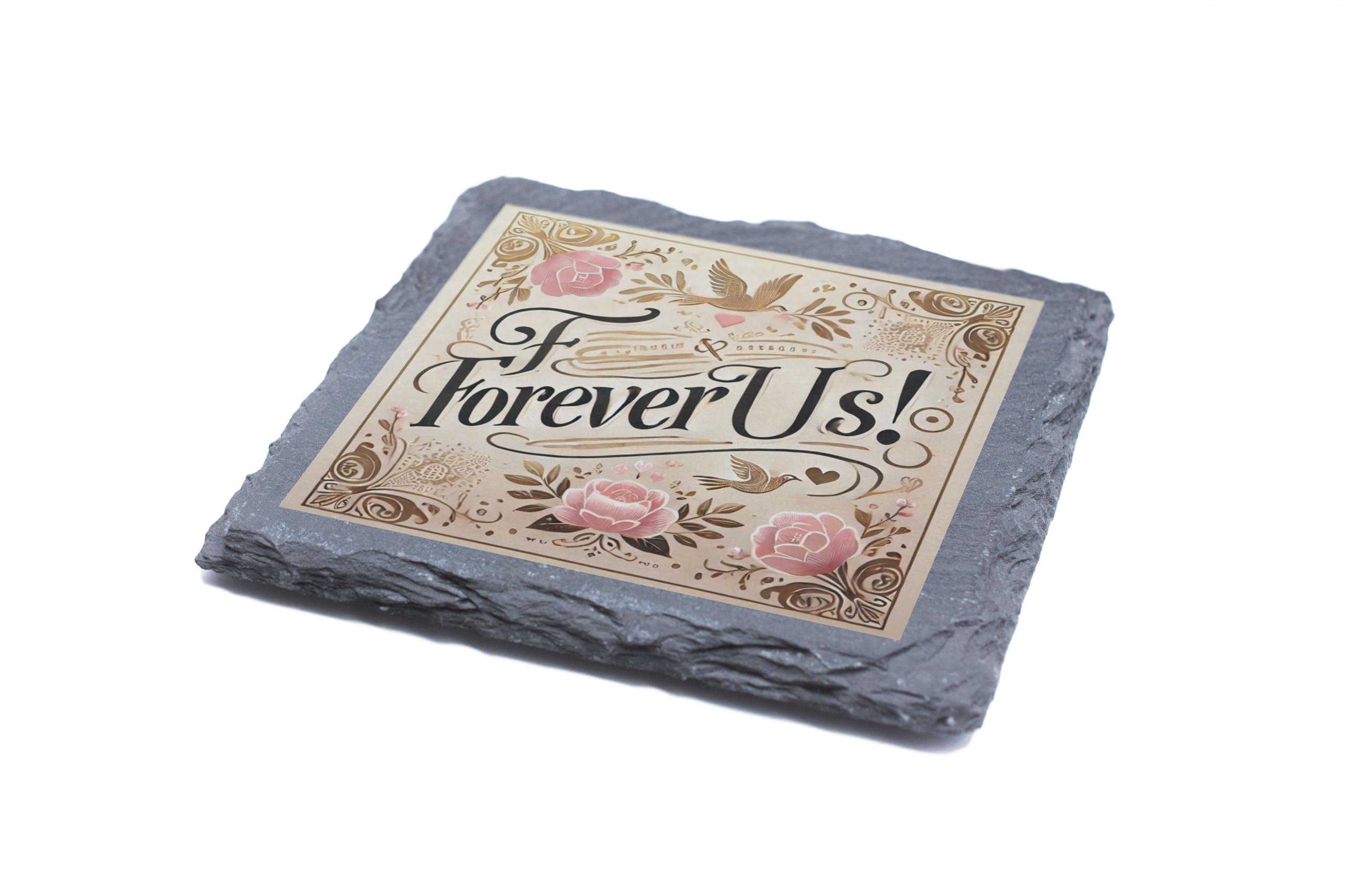 Celebrate love and togetherness with this elegant "Forever Us" slate coaster. Featuring an intricate floral design and soft, romantic colors, this coaster is the perfect blend of style and sentiment. Its high-quality slate construction ensures durability and a timeless rustic charm that enhances any home decor. This coaster is not just a practical accessory for protecting surfaces from spills and heat; it?s a heartfelt gift for couples and loved ones. Whether you?re celebrating an anniversary, wedding, or simply expressing your love, this coaster is a meaningful way to say ?Forever Us.? Easy to clean and beautifully designed, it?s perfect for everyday use or as a decorative keepsake. Add a touch of romance to your home or gift it to someone special to cherish forever.