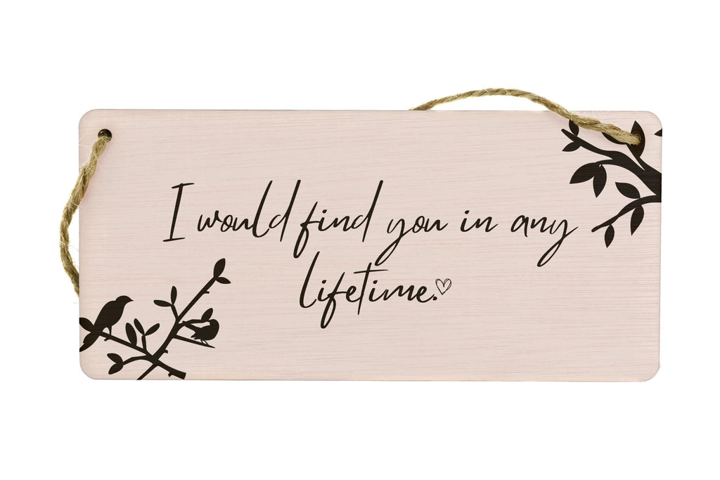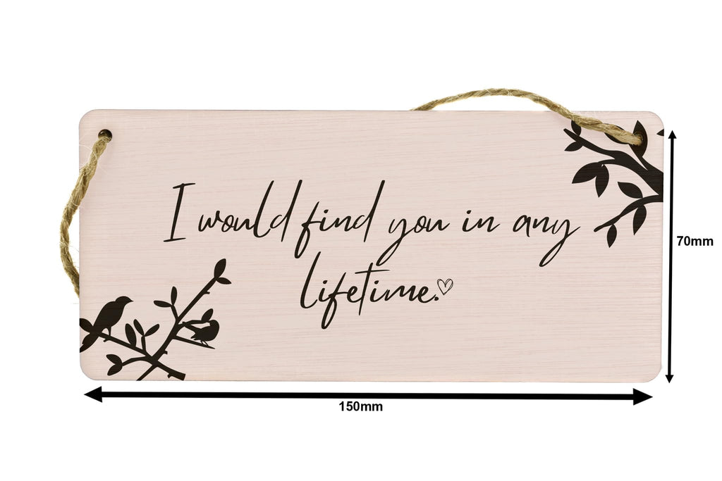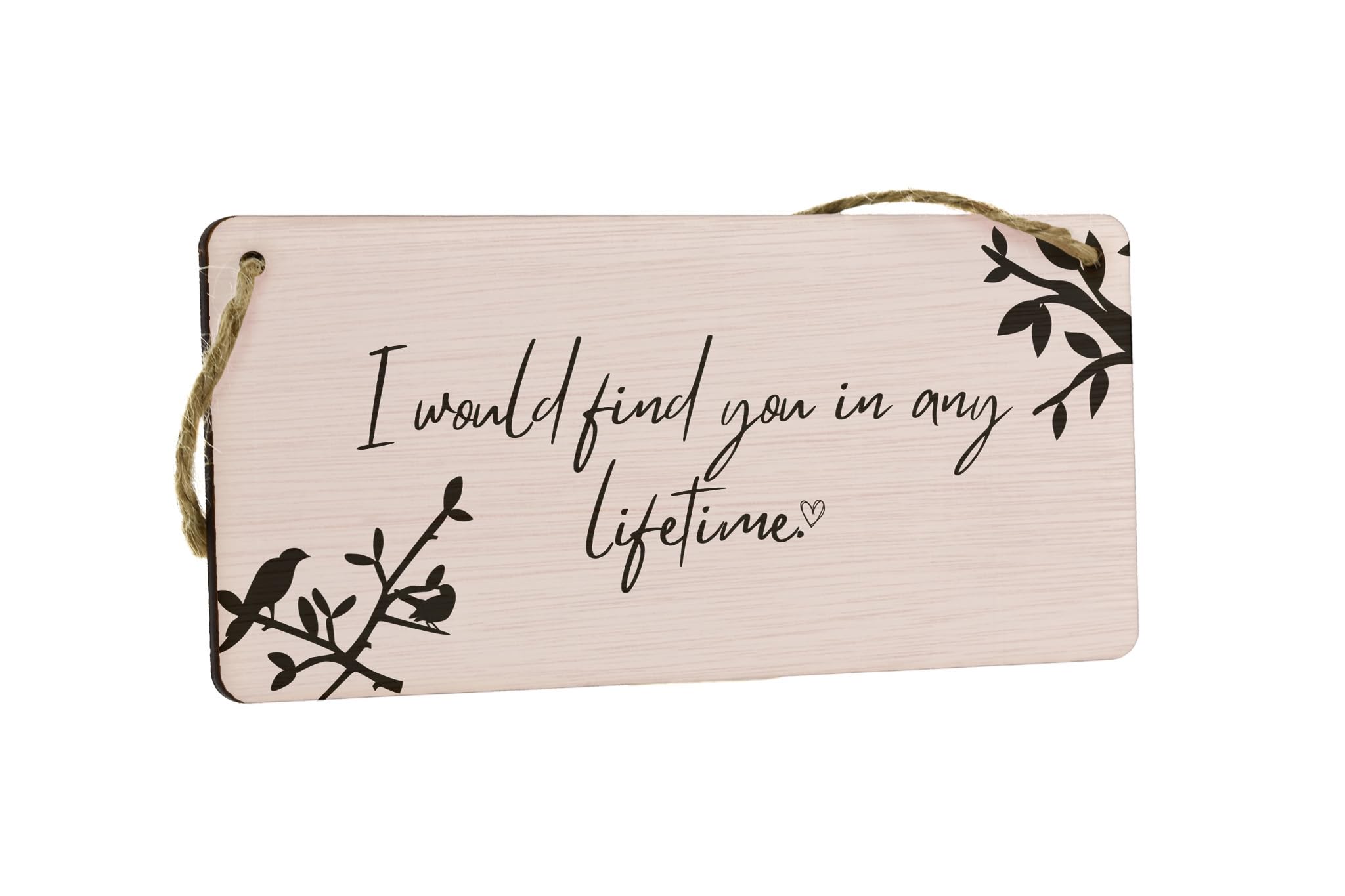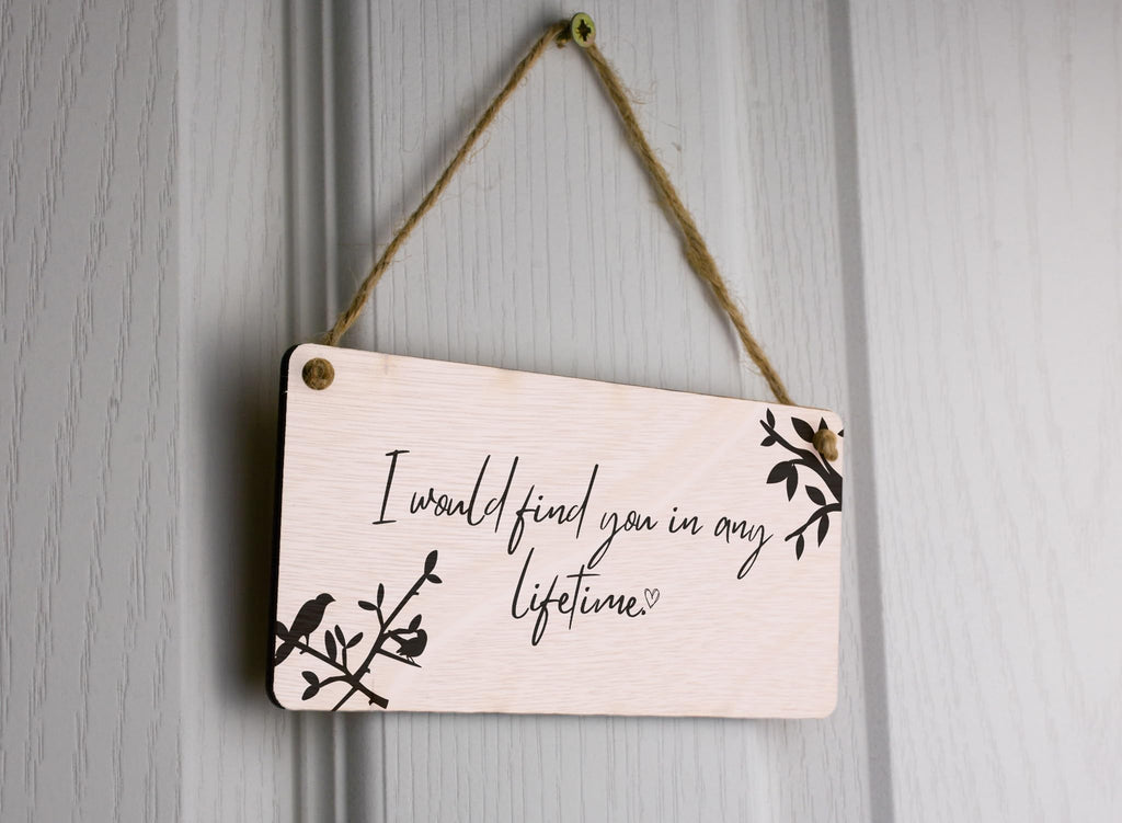 • Romantic full colour plywood hanging sign that reads 'I Would Find You in Any Lifetime'.