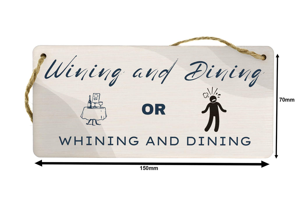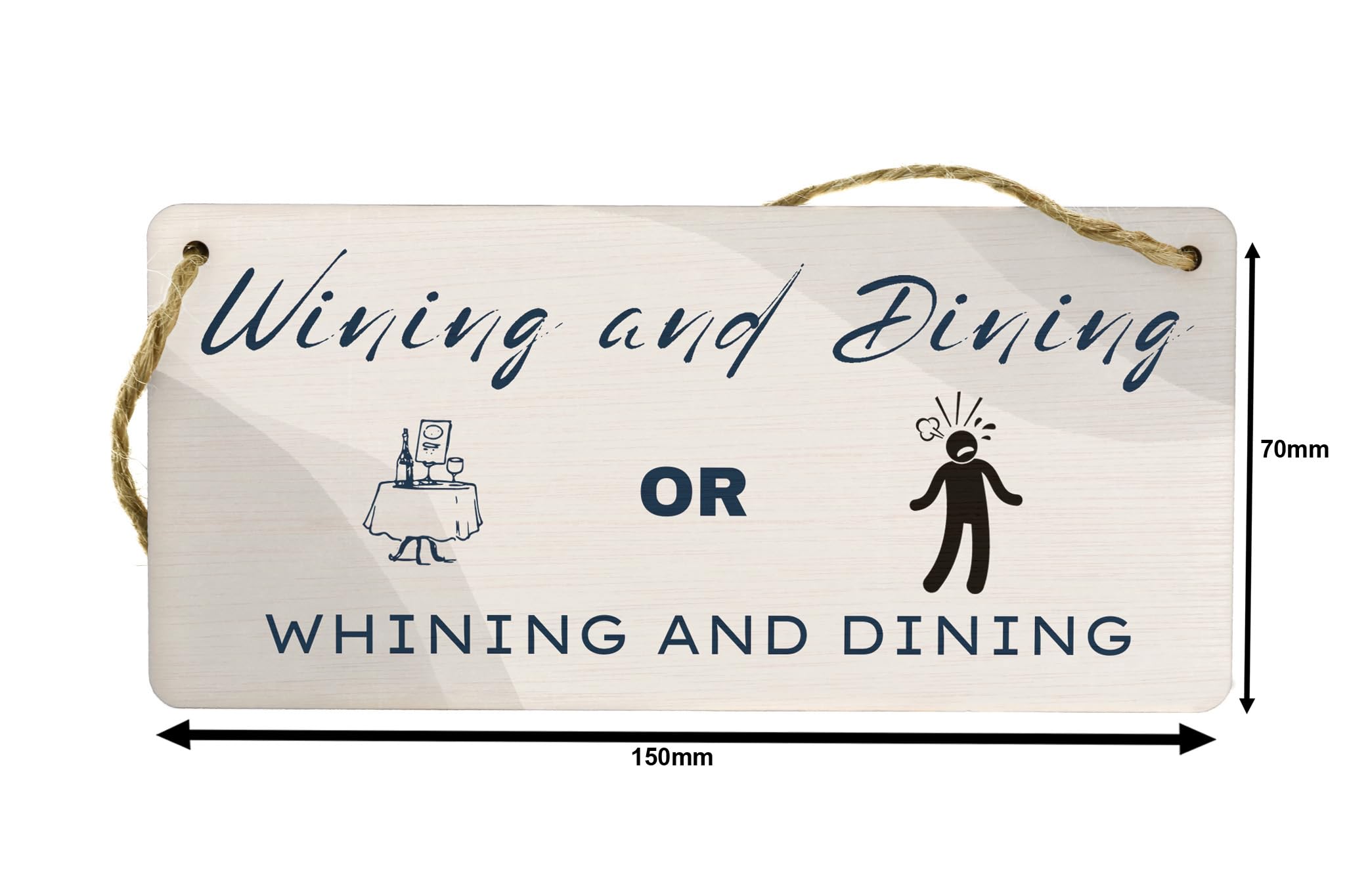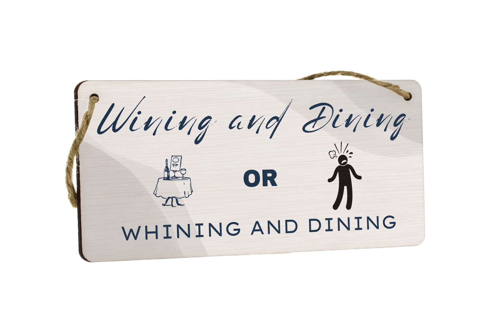 Add a touch of romance and humor to your home decor with this charming plywood hanging sign. Designed to bring a smile to the faces of couples, lovers, husbands, wives, boyfriends, and girlfriends, this funny gift is sure to be a hit. Made from durable plywood and featuring a full-colour design, this novelty home decor item reads 'Wining and Dining or Whining and Dining', accompanied by an image of a table and a person. Whether you're looking to surprise your partner or add a unique touch to your own space, this sign is the perfect choice.