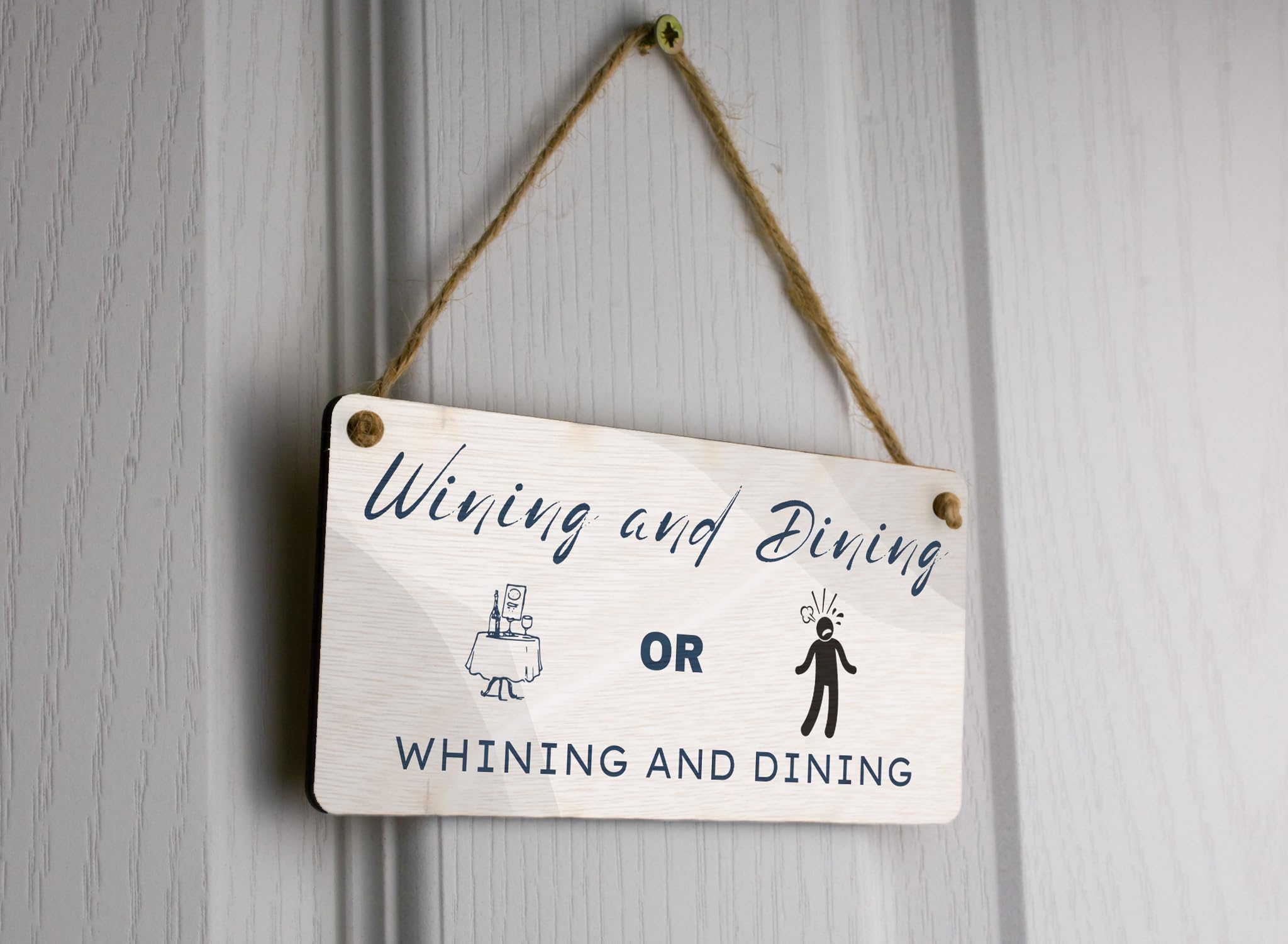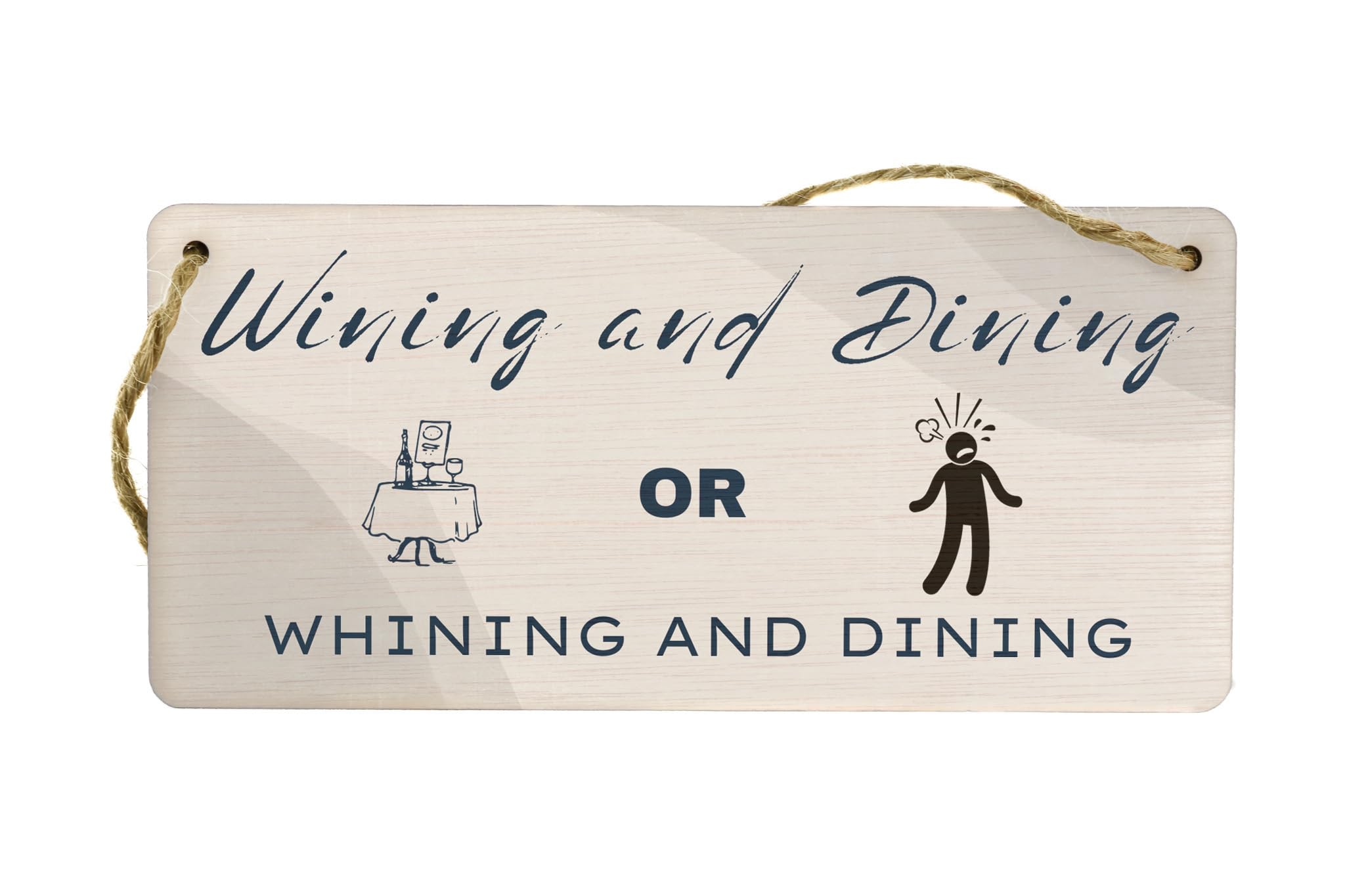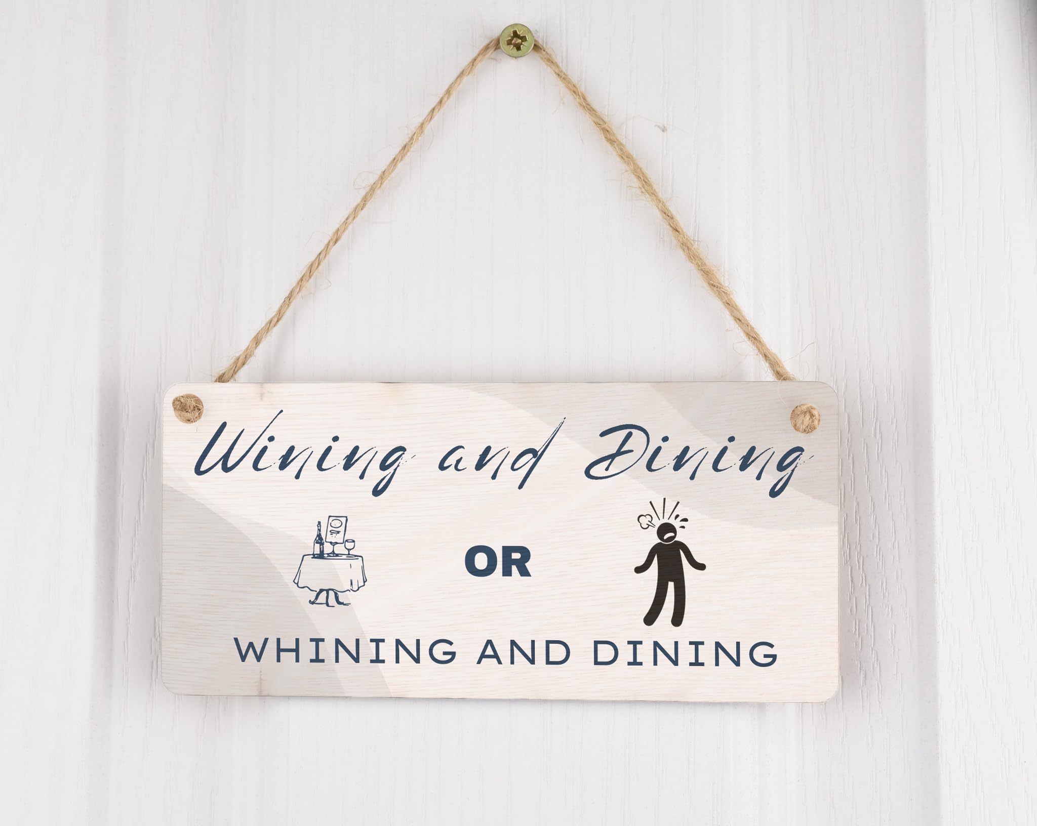 Add a touch of romance and humor to your home decor with this charming plywood hanging sign. Designed to bring a smile to the faces of couples, lovers, husbands, wives, boyfriends, and girlfriends, this funny gift is sure to be a hit. Made from durable plywood and featuring a full-colour design, this novelty home decor item reads 'Wining and Dining or Whining and Dining', accompanied by an image of a table and a person. Whether you're looking to surprise your partner or add a unique touch to your own space, this sign is the perfect choice.