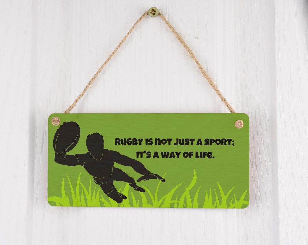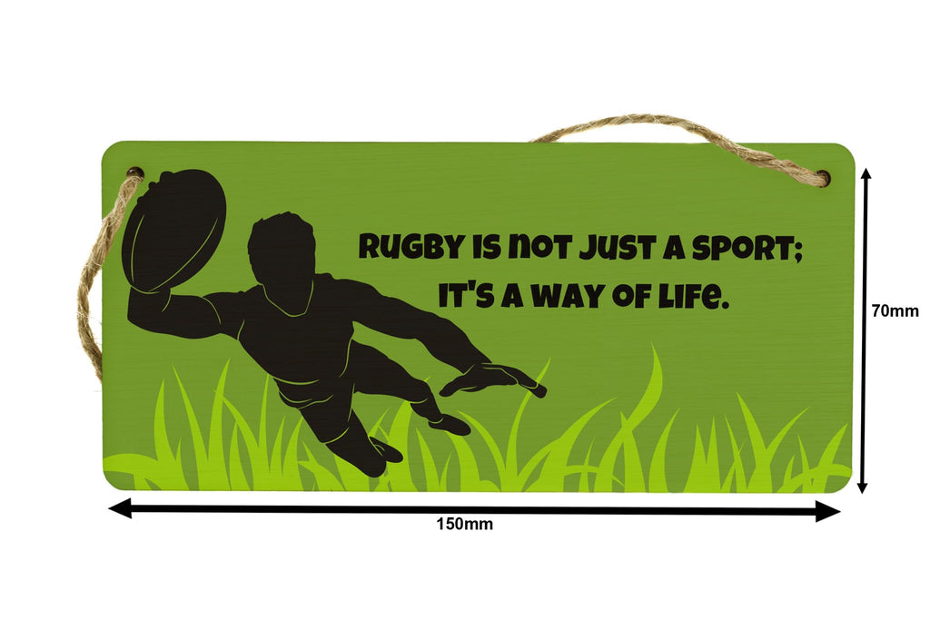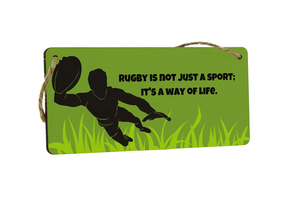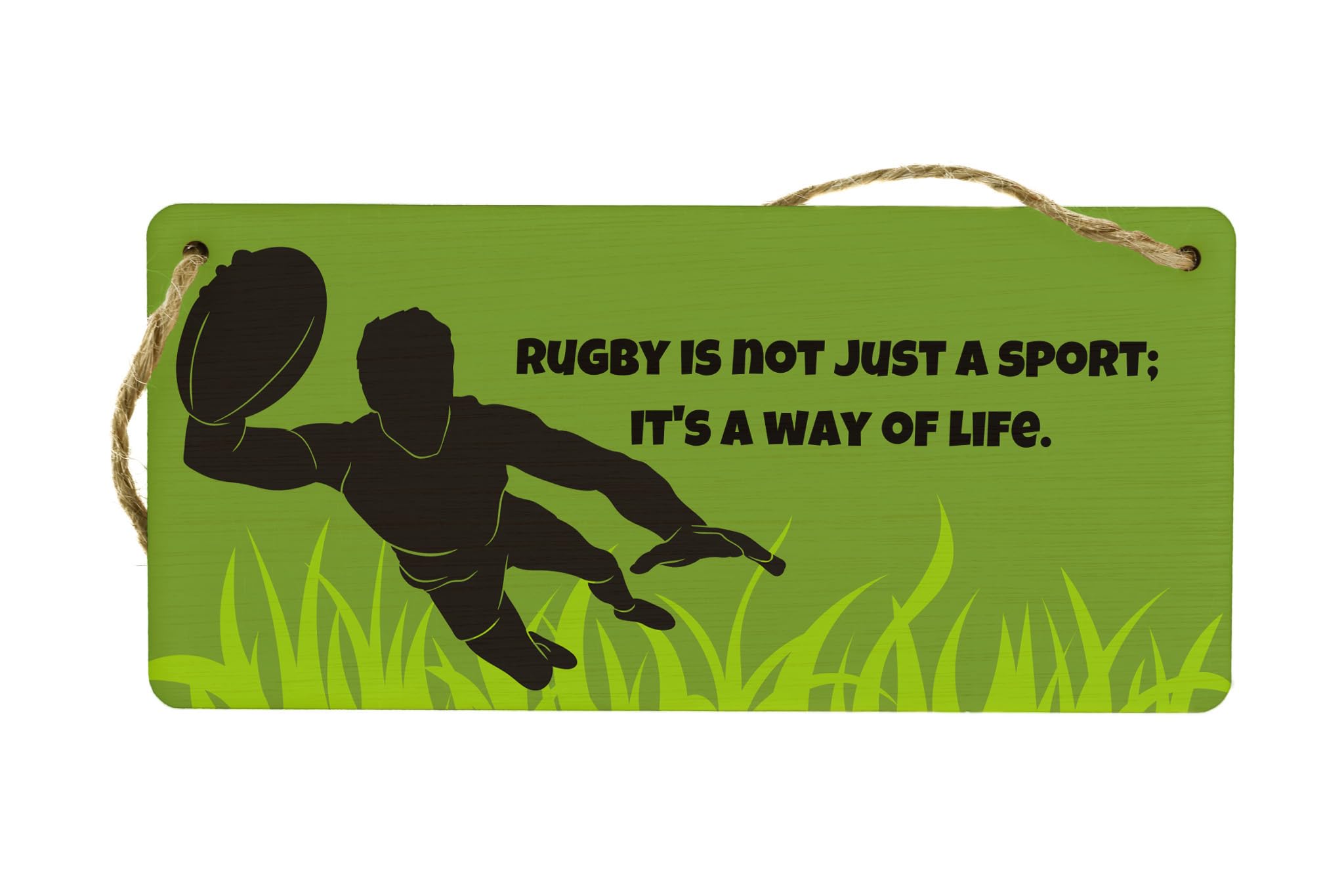 Introducing the Rugby Lifestyle Plywood Hanging Sign, the perfect sports wall art and home d?cor for him. Crafted from high-quality plywood, this hanging sign showcases a vibrant and full-color design that will brighten up any room. The sign reads 'Rugby is not just a sport, it is a way of life', proudly displaying your passion for the game. Whether you are a rugby enthusiast yourself or looking for a unique gift for a sports-loving friend, this rugby wall sign is a must-have. It is suitable for boys' rooms, man caves, or any space that needs a touch of sports-inspired charm. Add this rugby hanging sign to your home decor collection and showcase your love for the sport in style.
