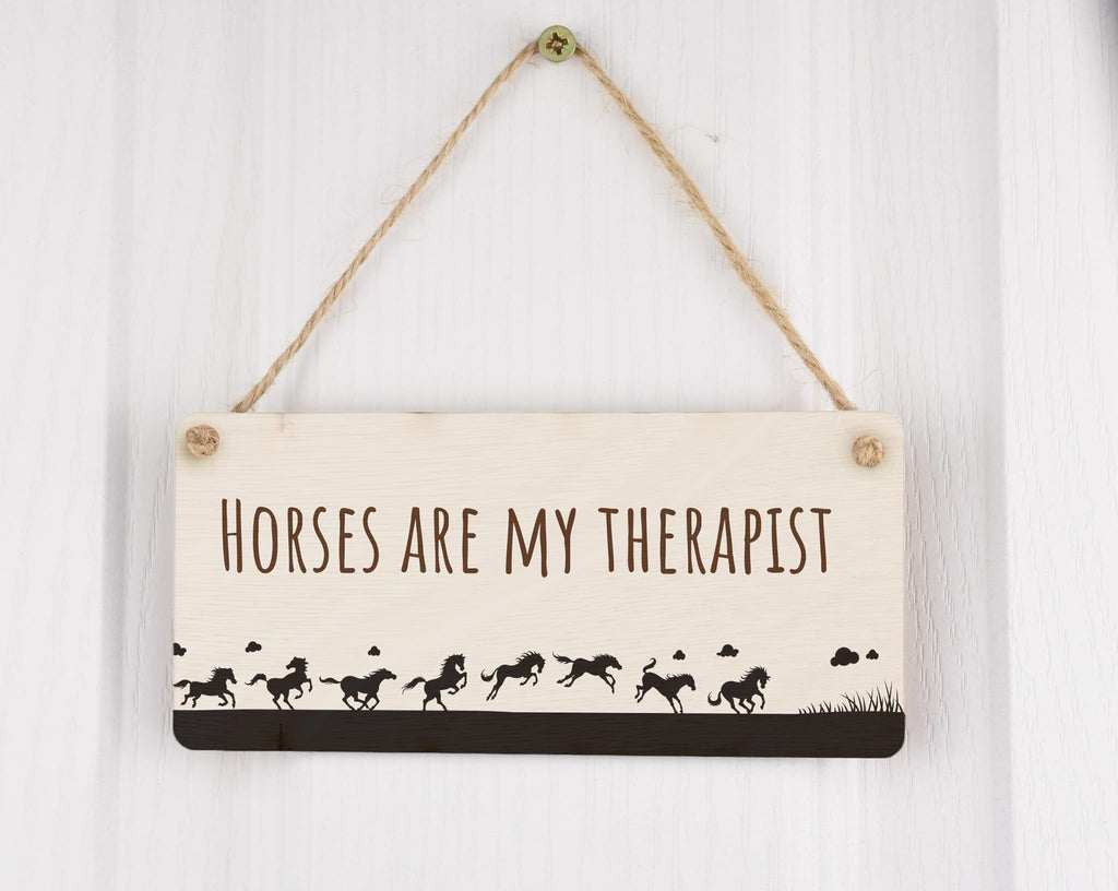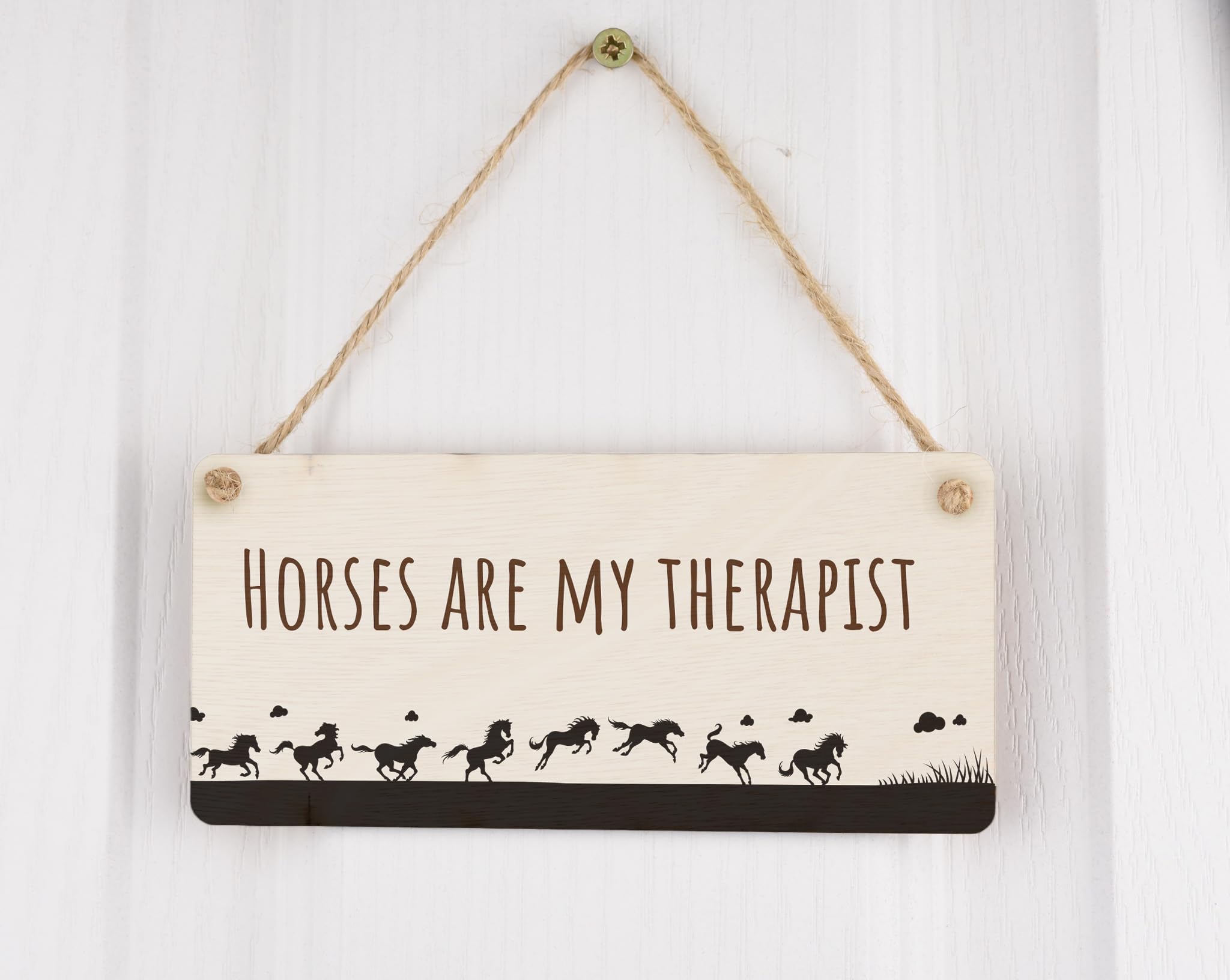 Add a touch of rustic farmhouse charm to your home decor with this beautiful Plywood Hanging Sign. This sign features a heartfelt message that reads 'Horses are my therapist', making it a perfect addition for any horse lover. Whether you have a farmhouse-style home or simply love the rustic aesthetic, this sign will enhance the overall ambiance of your living space. Made from high-quality plywood, this sign is durable and long-lasting. Hang it on your wall, door, or any other suitable place to instantly elevate the look and feel of any room. The neutral colors and wooden texture of this sign make it versatile and easy to blend with any existing decor. Show off your love for horses and bring a touch of farmhouse elegance to your home with this beautiful Horse Lover Plywood Hanging Sign.