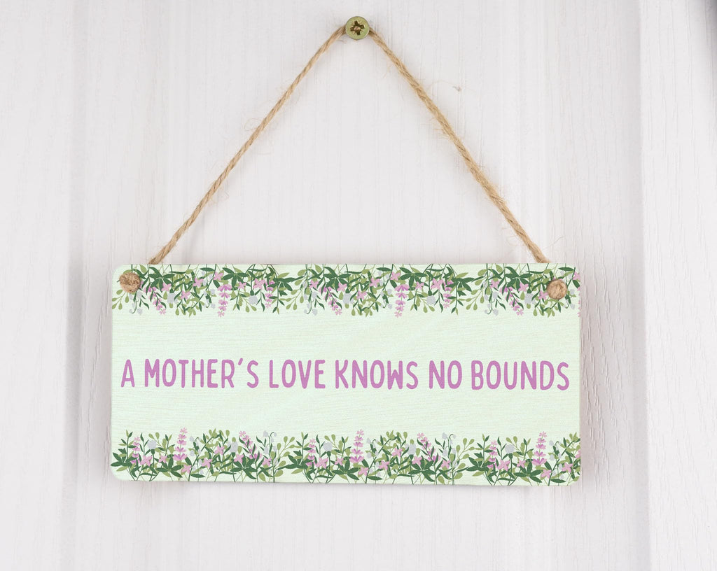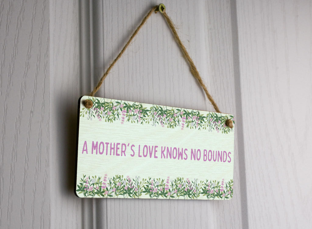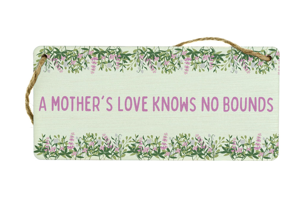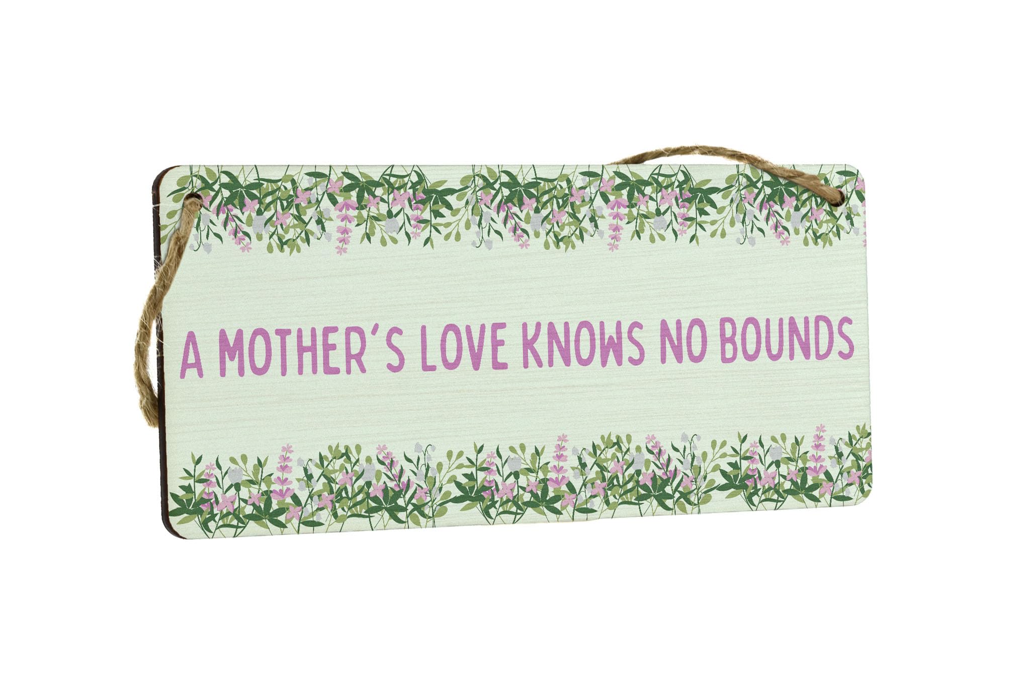 This handcrafted laser cut plywood wall sign is the perfect sentimental gift for any mother. With its rustic charm and floral design, it adds a touch of emotional decor to any home. The full colour printed sign features a heartfelt quote that reads 'A mother's love knows no bounds', making it a thoughtful keepsake for Mother's Day or any special occasion. The UV printed design is durable and vibrant, showcasing a cute floral bordered design in greens and purples. The wooden sign comes with twine included for easy hanging, making it a beautiful addition to any room.