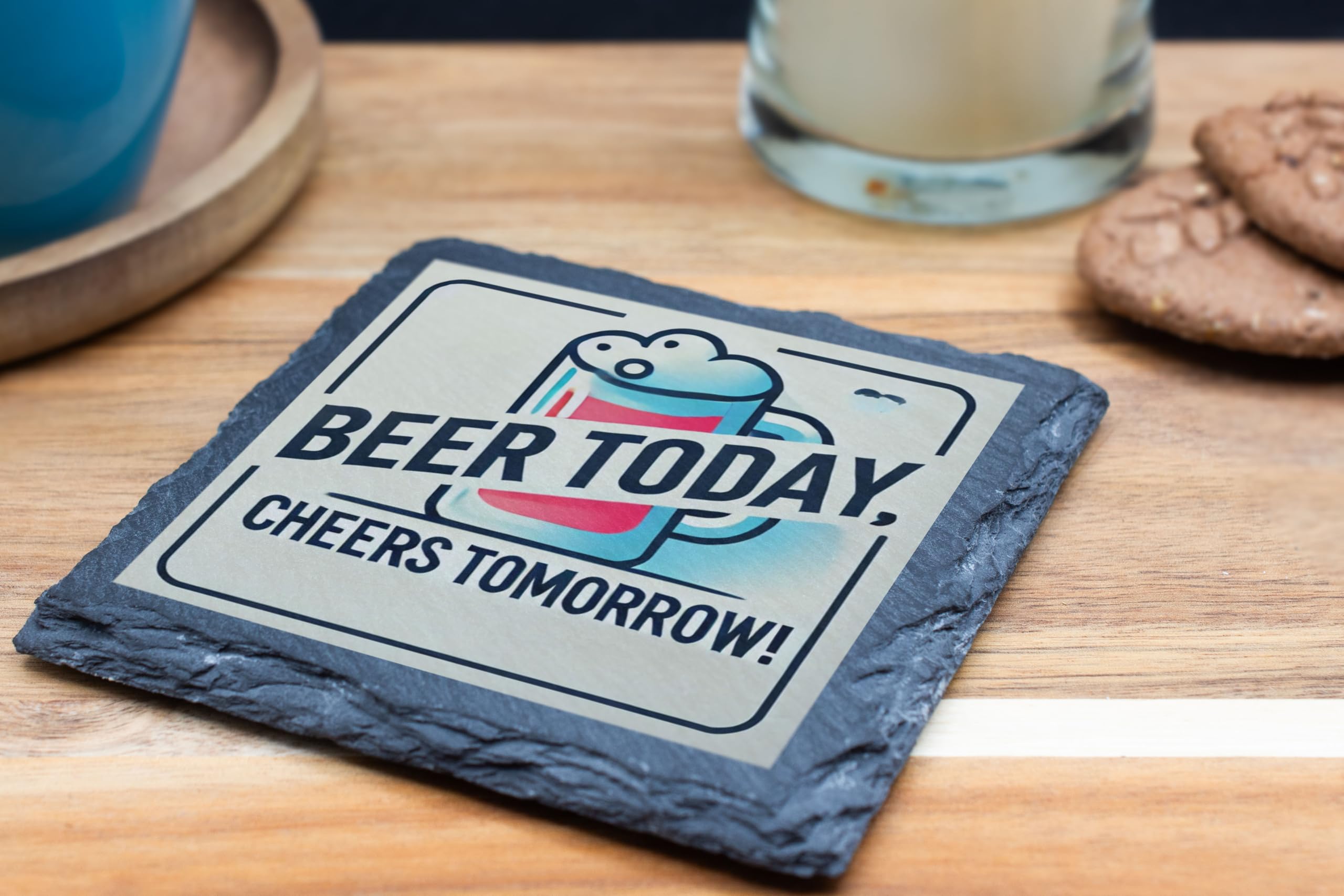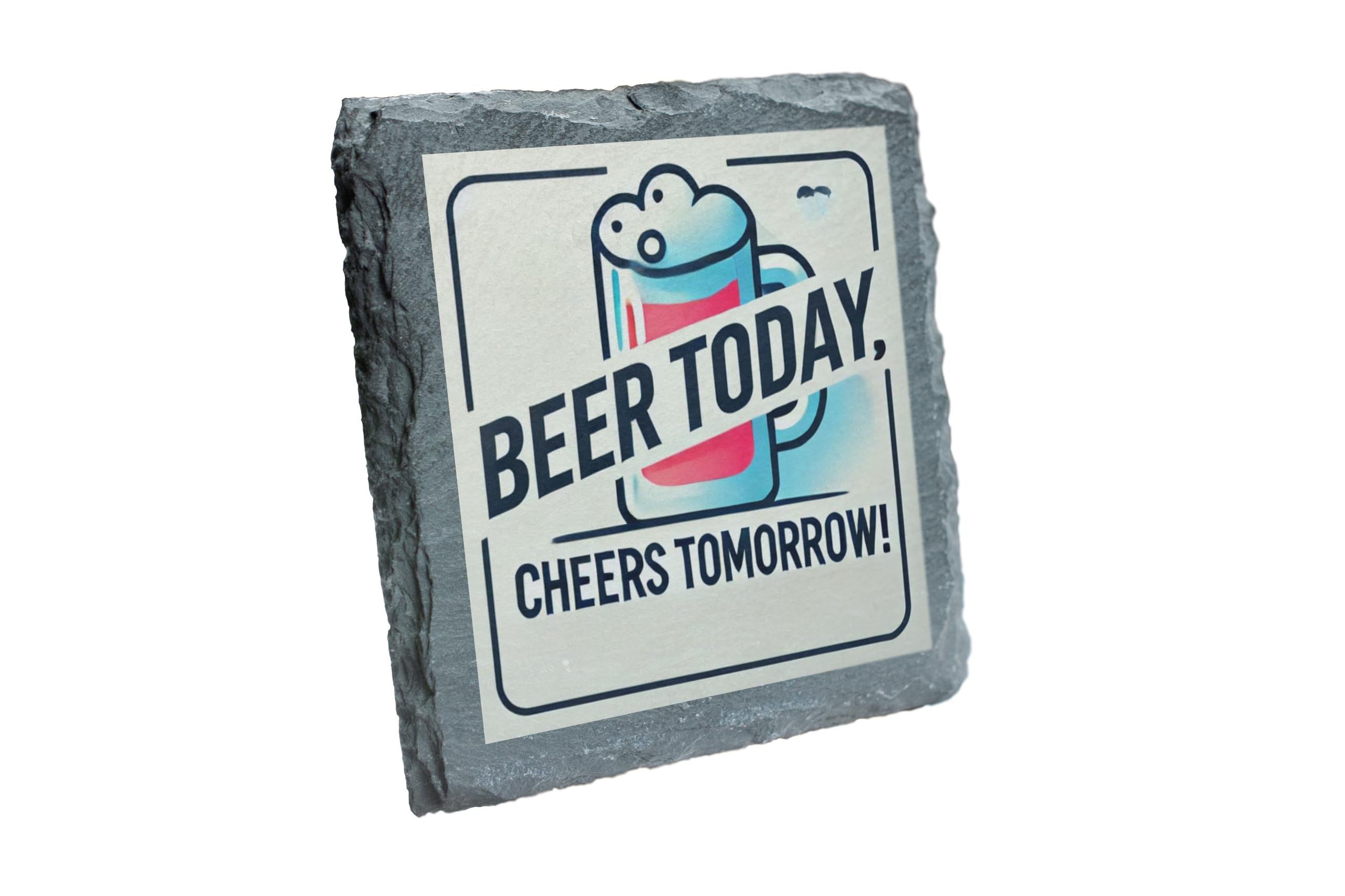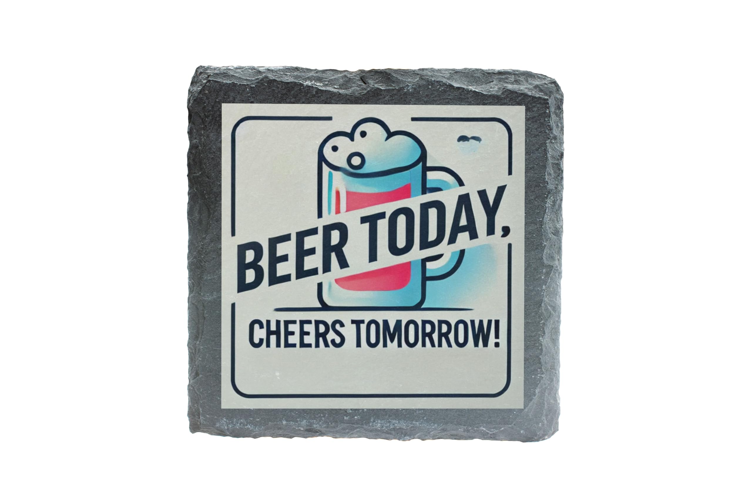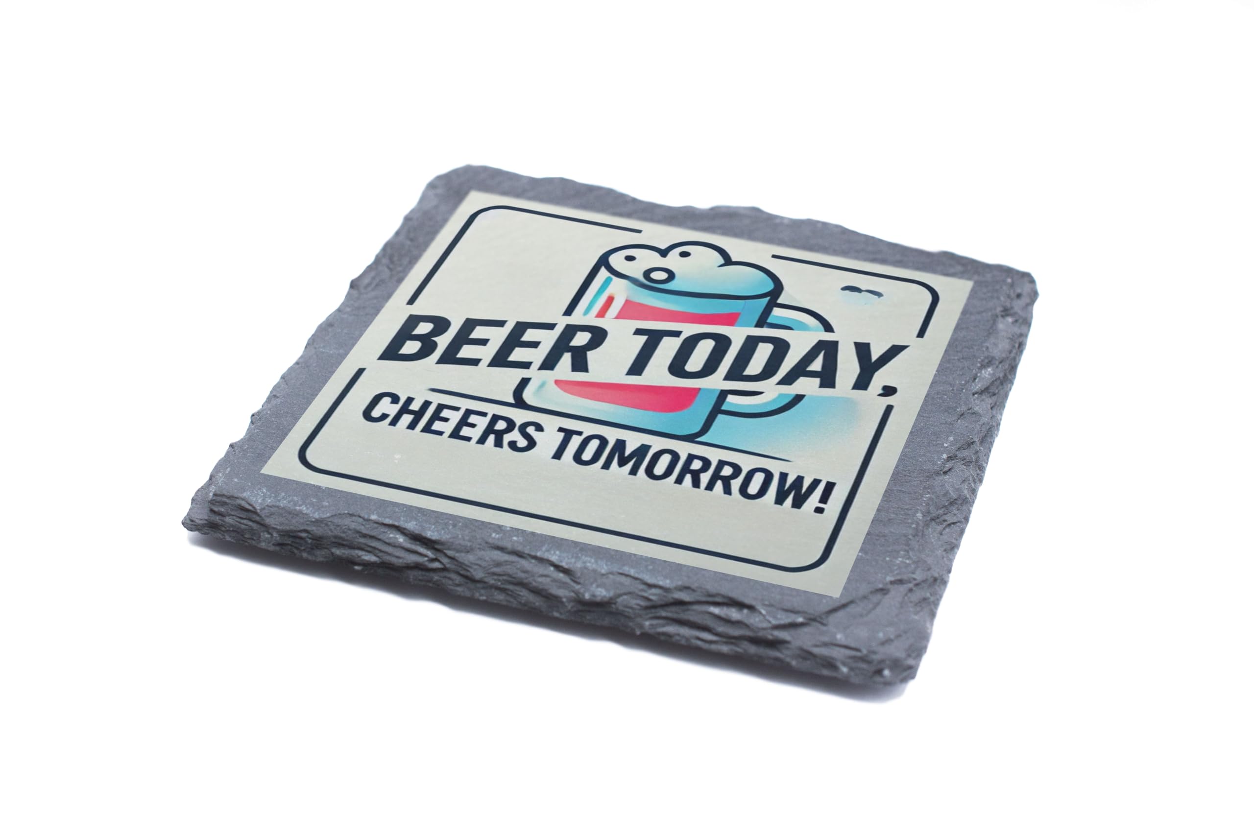 Add a fun and functional touch to your space with this rustic slate coaster, perfect for beer lovers. Featuring a lively design with a beer mug and the cheeky phrase, "Beer Today, Cheers Tomorrow!", this coaster brings personality and practicality to your home or bar. Made from premium natural slate, it offers durability and a stylish rustic aesthetic, protecting your surfaces from scratches and spills. Whether you're looking for a thoughtful gift for a beer enthusiast or a unique accessory for your own decor, this coaster is an excellent choice. Use it to brighten up your home bar, complement your coffee table, or spark laughter at parties. Durable, decorative, and full of charm, this coaster is a must-have for anyone who enjoys a good brew and a great time!