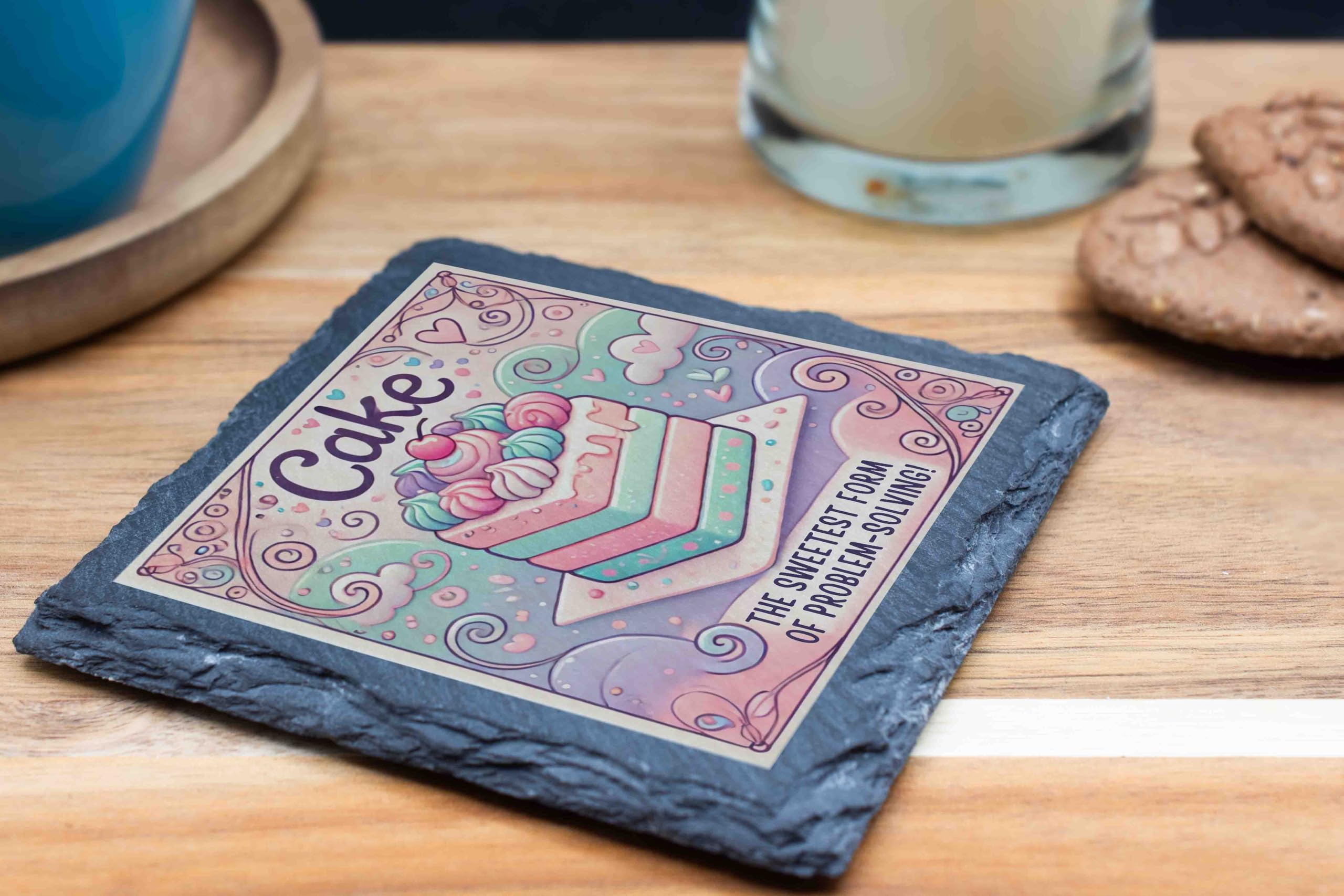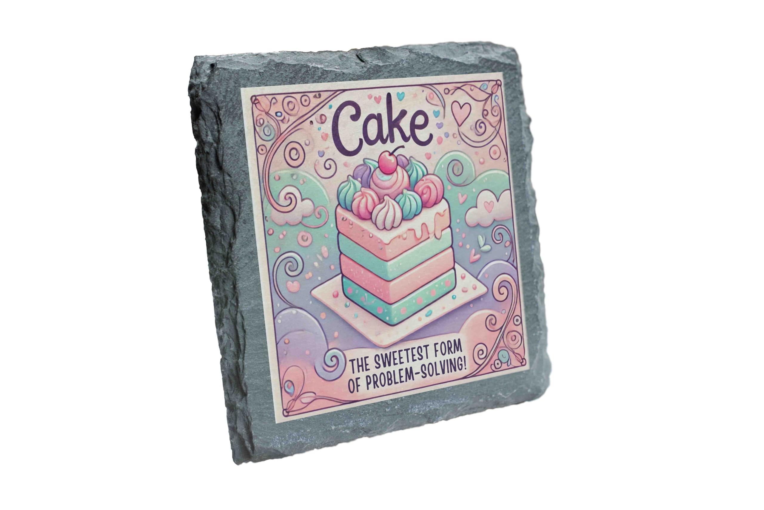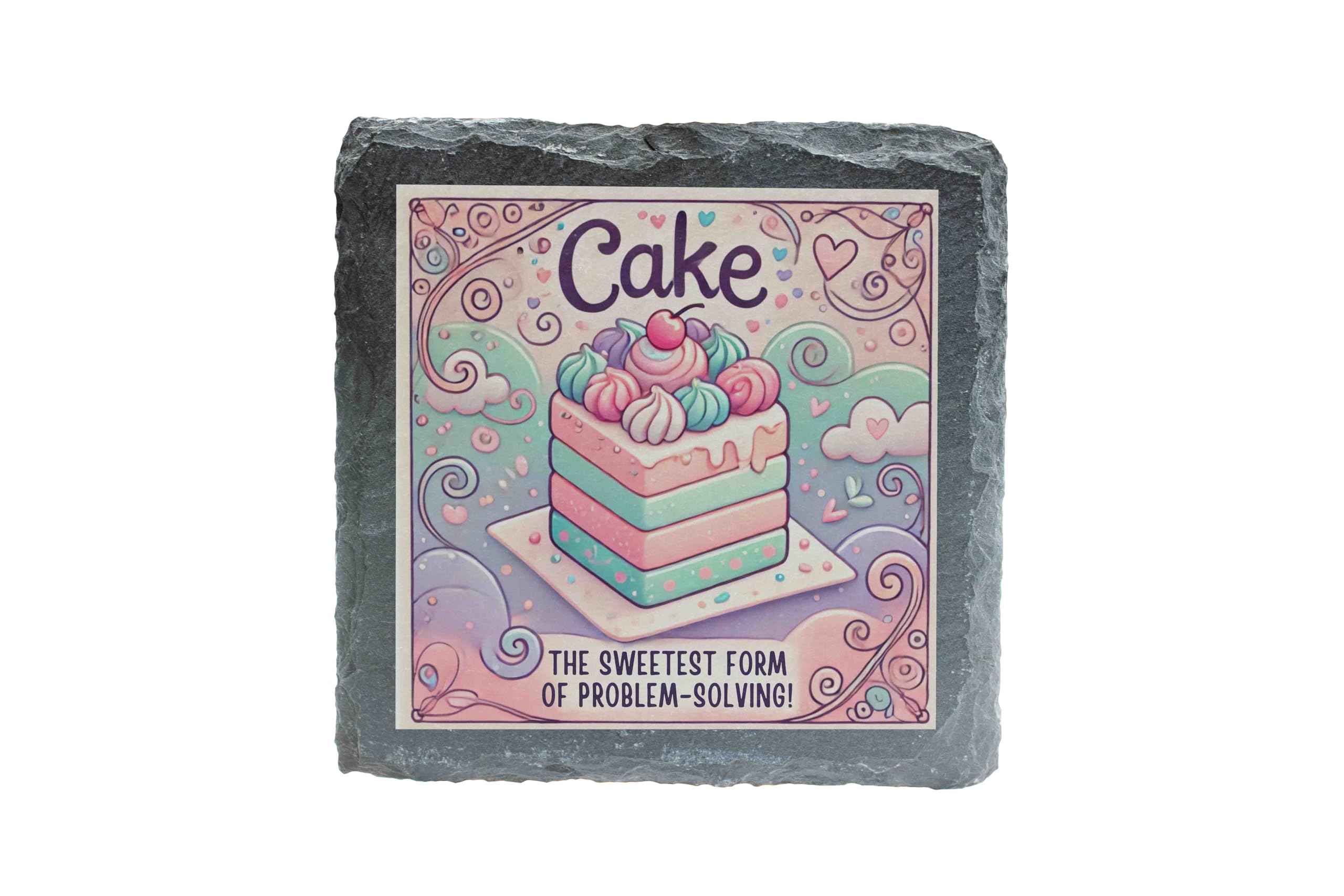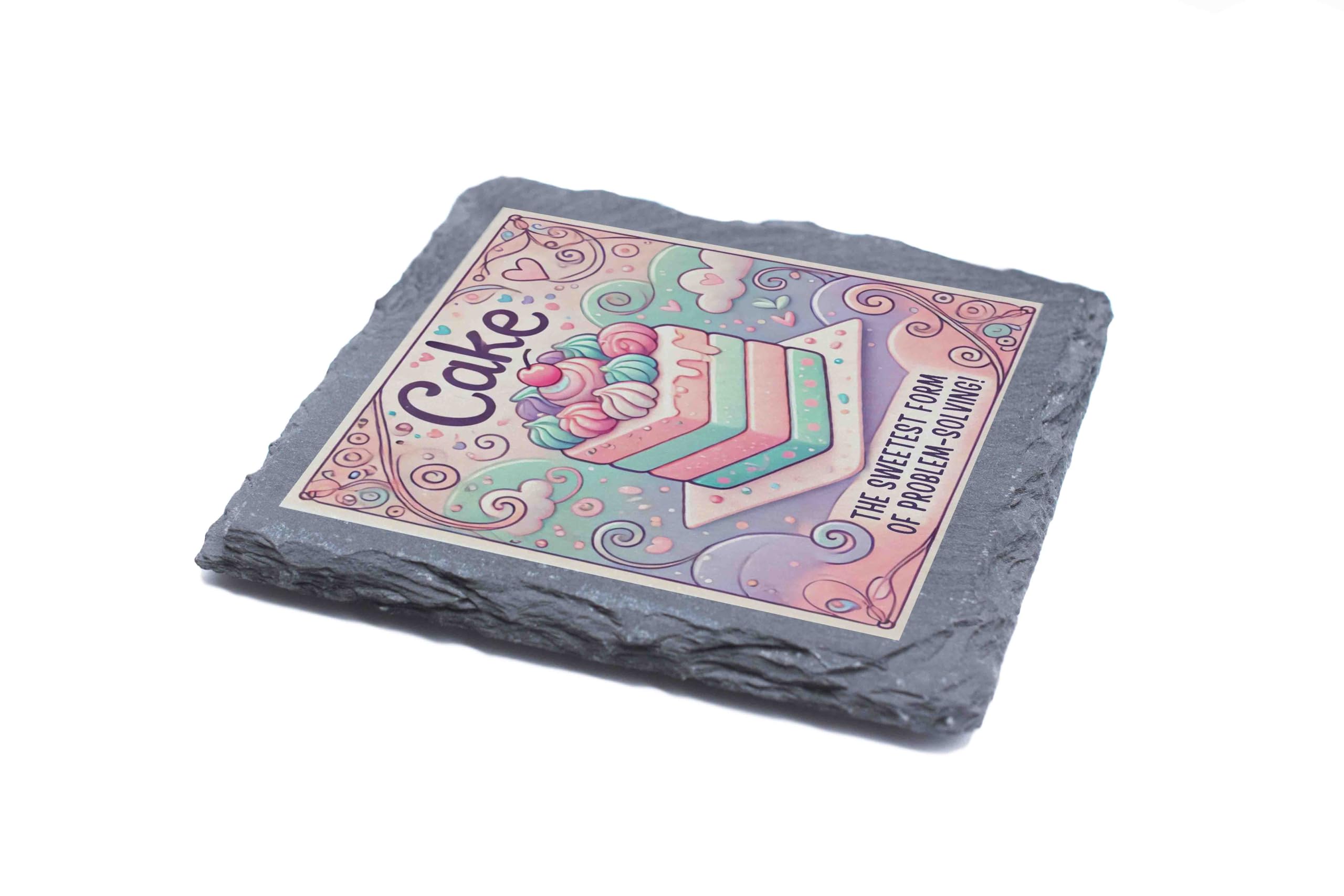 Celebrate your love for cake with this beautifully designed rustic slate coaster. Featuring a vibrant and playful illustration of a layered cake and the humorous message, "The Sweetest Form of Problem-Solving," this coaster brings charm and fun to your decor. Made from high-quality natural slate, it is both durable and stylish, providing functionality by protecting your furniture from drink stains and scratches. Perfect for dessert lovers, bakers, or anyone who appreciates sweet and humorous decor, this coaster makes an excellent gift for birthdays, housewarmings, or any special occasion. Use it to brighten up your kitchen, living room, or coffee table, or as a conversation starter at dessert-themed gatherings. Full of personality and practicality, this coaster is a delightful addition to any home.
