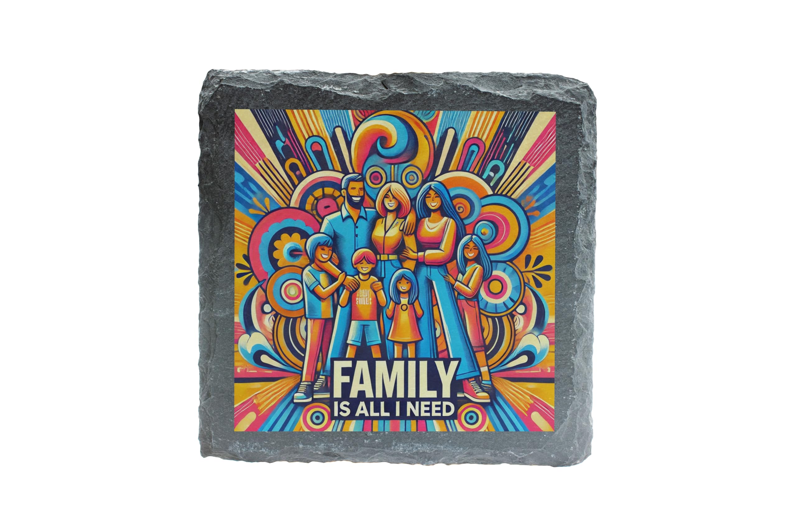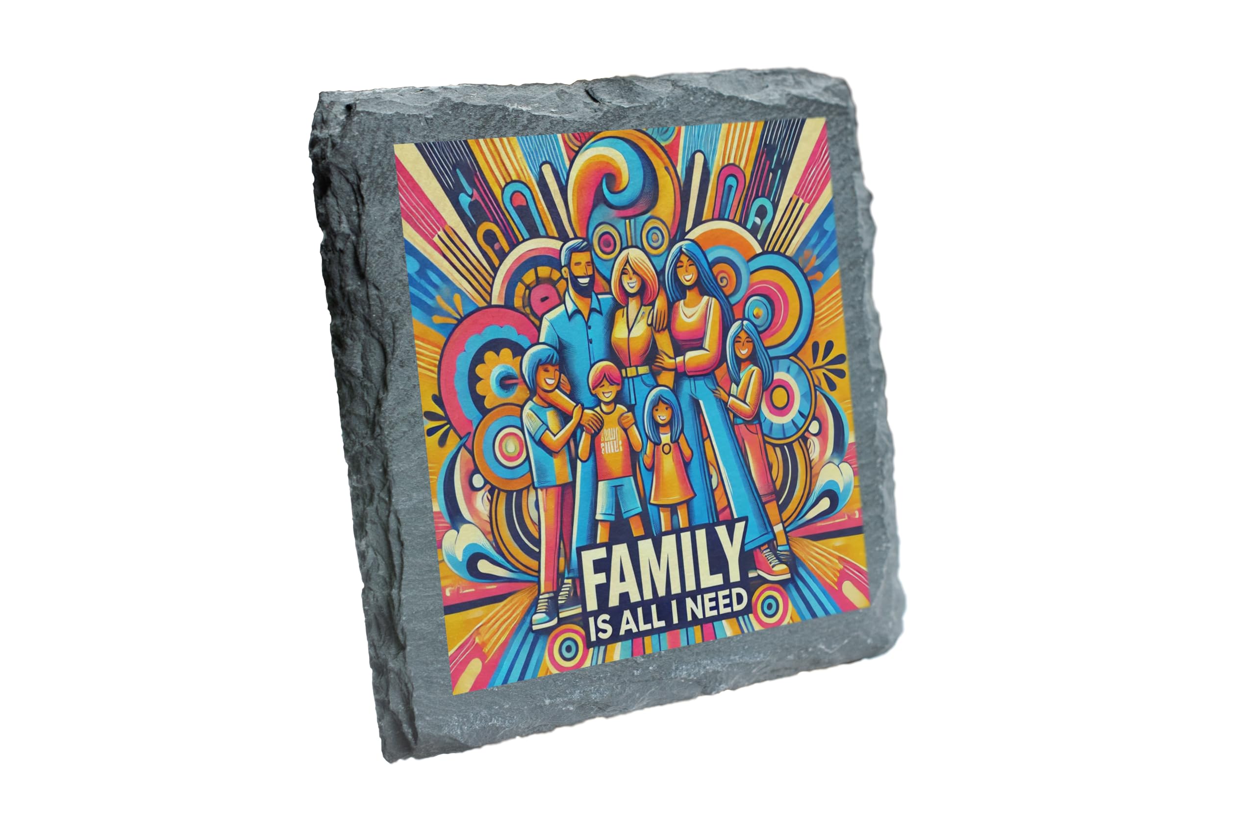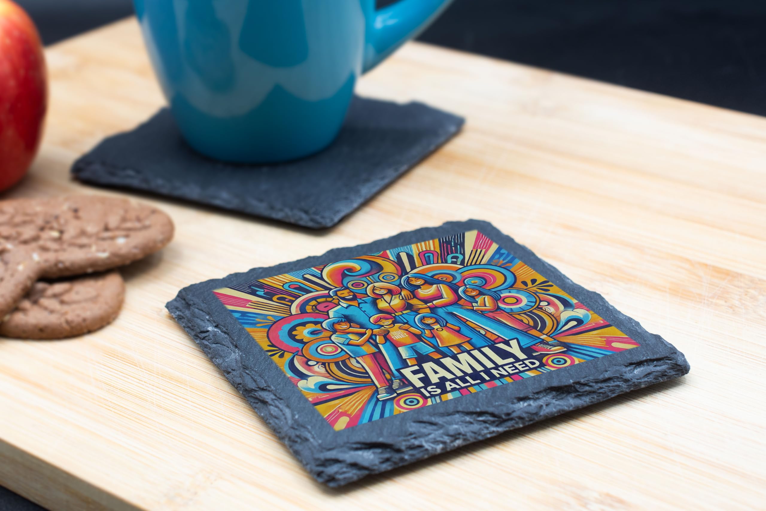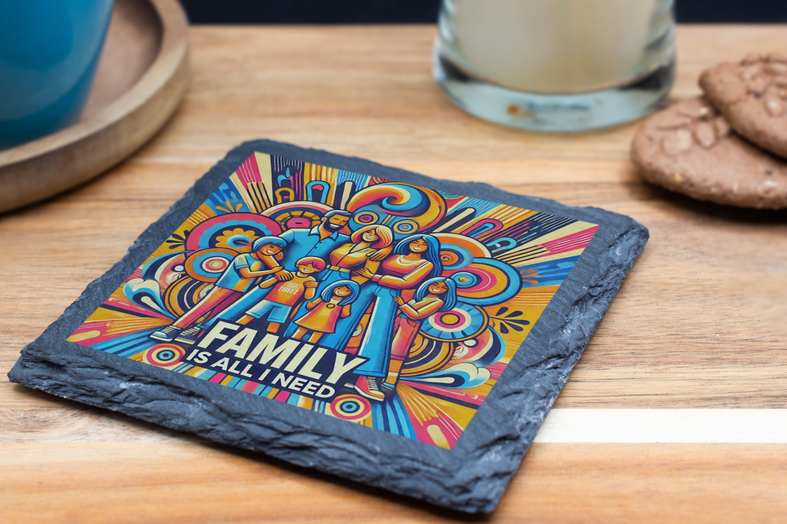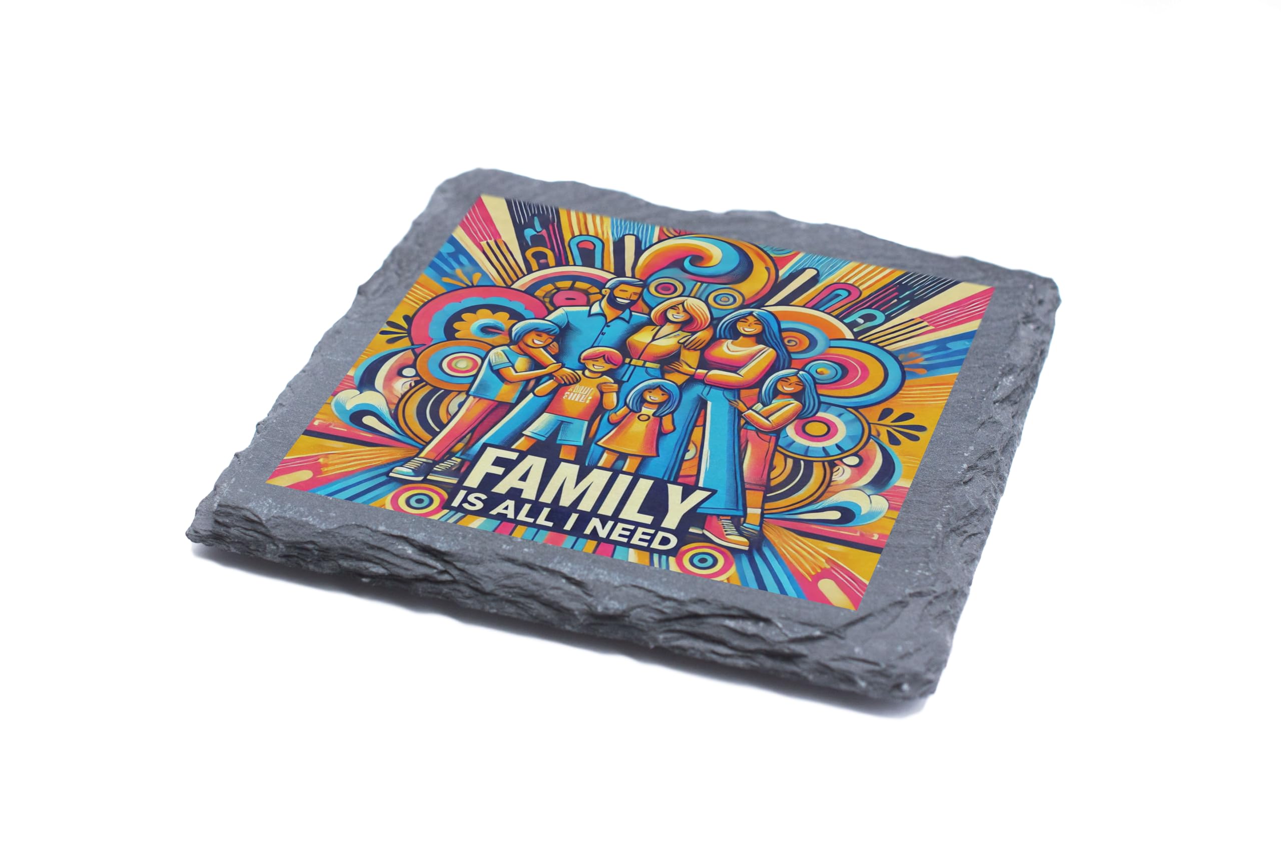 Celebrate the love and bond of family with this beautiful rustic slate coaster. Featuring a vibrant and colorful illustration of a happy family and the touching phrase, "Family Is All I Need," this coaster is a meaningful addition to any home. Crafted from durable natural slate, it offers both style and functionality, protecting your furniture from drink rings and scratches. Whether as a gift for a loved one or as a heartfelt addition to your own home decor, this coaster is perfect for showcasing the importance of family. Use it during family gatherings, to brighten up your coffee table, or as a daily reminder of what truly matters. Stylish, durable, and full of warmth, this coaster is a wonderful way to celebrate the beauty of family connections.