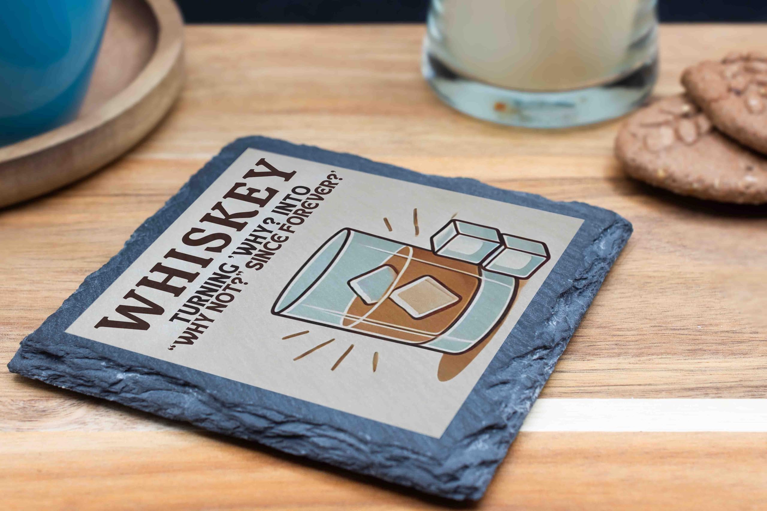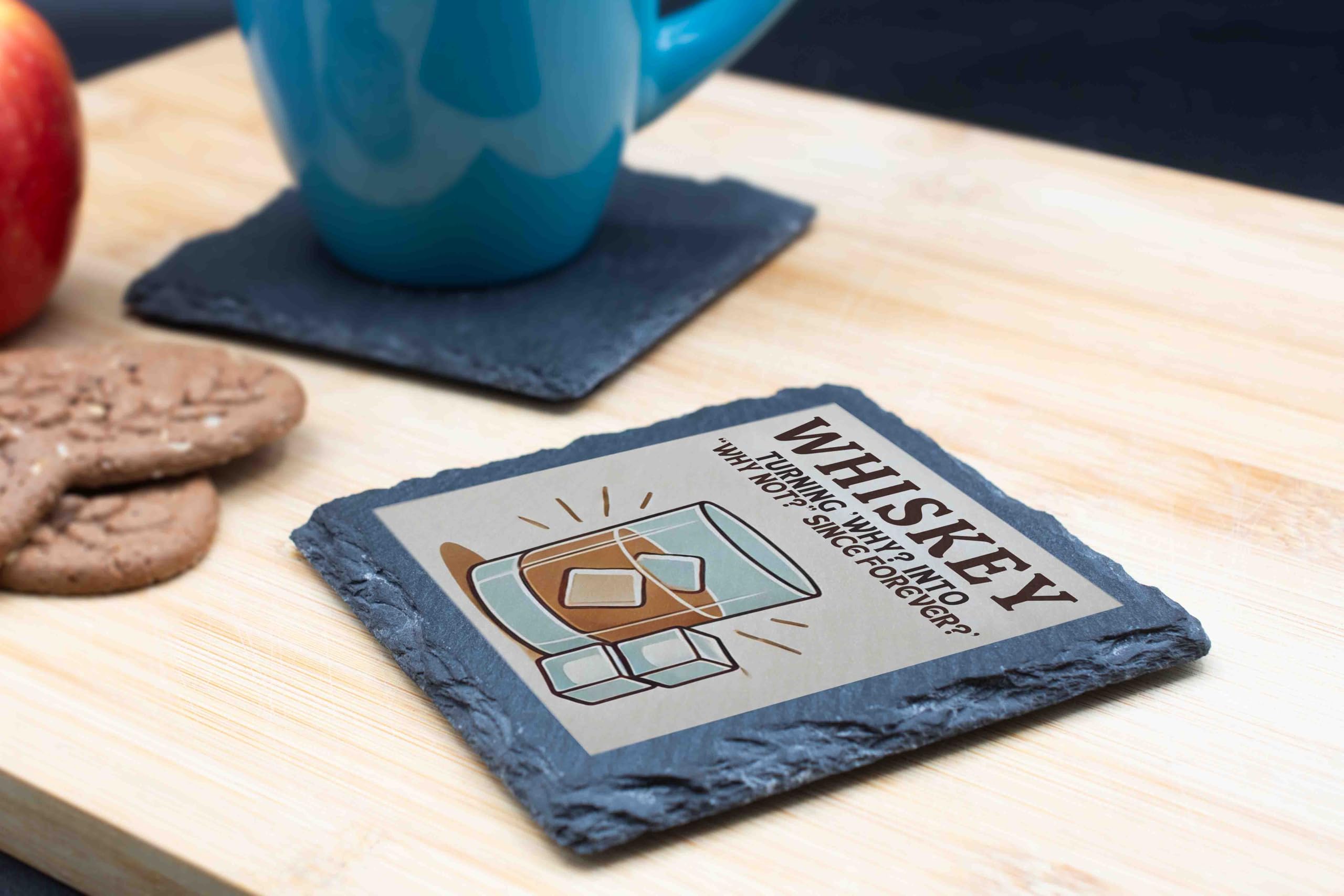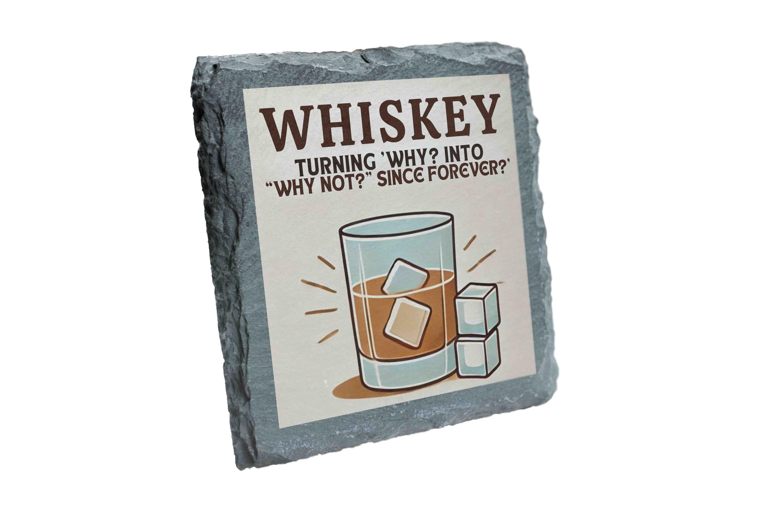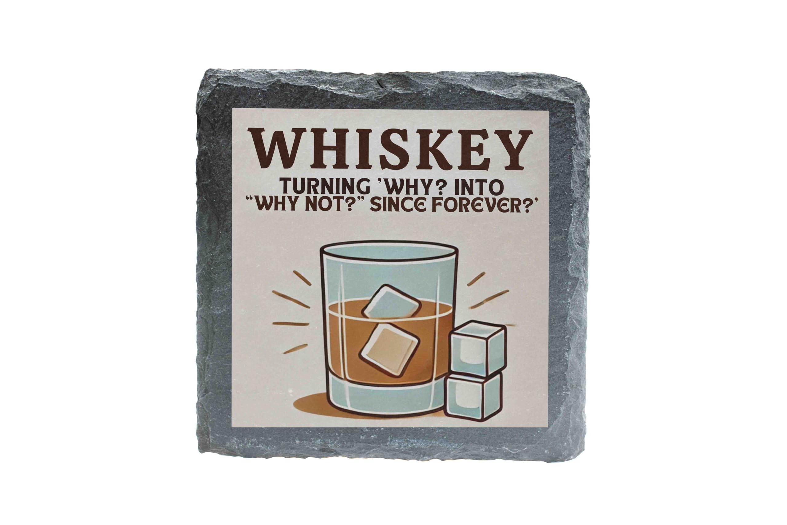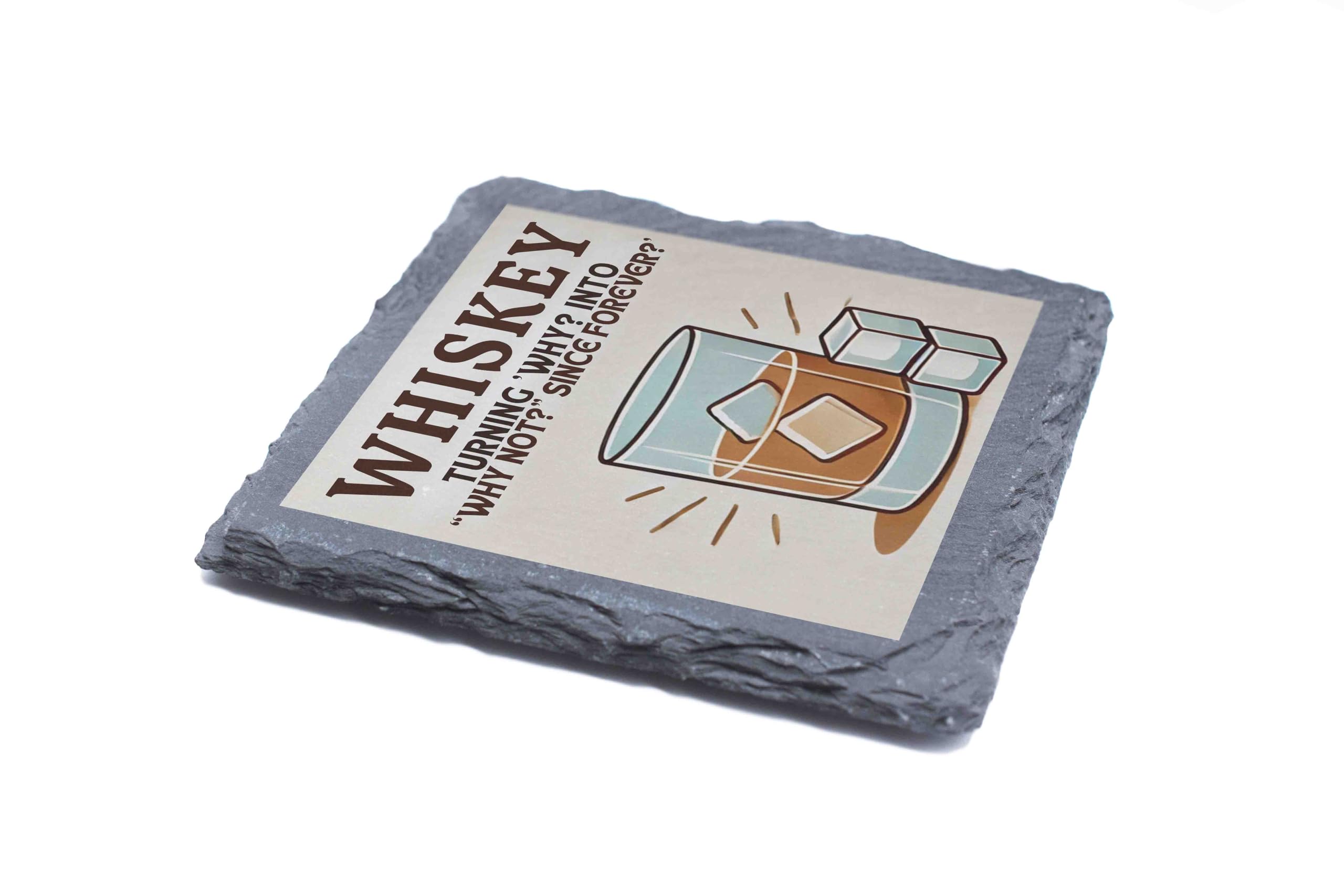 Elevate your home decor with this rustic slate coaster featuring a playful whiskey-themed design. The stylish illustration of a whiskey glass, accompanied by the humorous phrase "Turning 'Why?' into 'Why Not?' Since Forever," adds a touch of sophistication and fun to any space. Crafted from durable natural slate, this coaster provides reliable protection for your surfaces against drink rings and scratches. Perfect as a thoughtful gift for whiskey enthusiasts or as a stylish addition to your own barware collection, this coaster is versatile enough for casual gatherings or special occasions. Use it to complement your home bar setup, spark conversations at parties, or simply enjoy its charming design every day. Durable, functional, and full of character, this coaster is a must-have for whiskey lovers and decor enthusiasts alike.