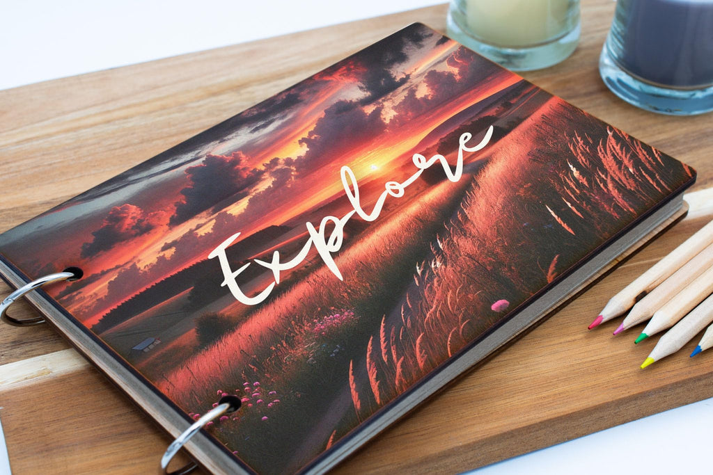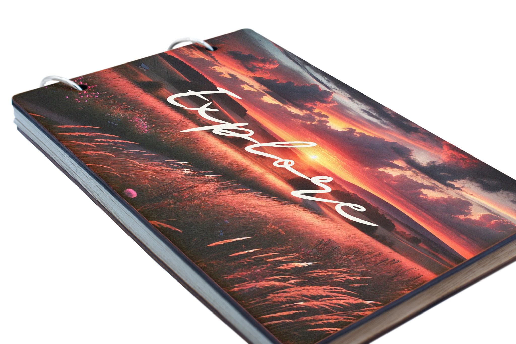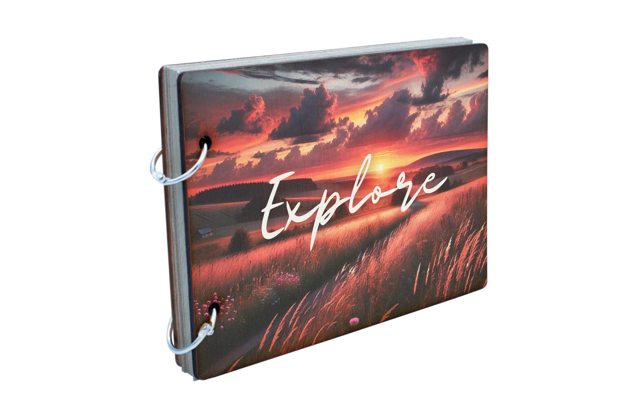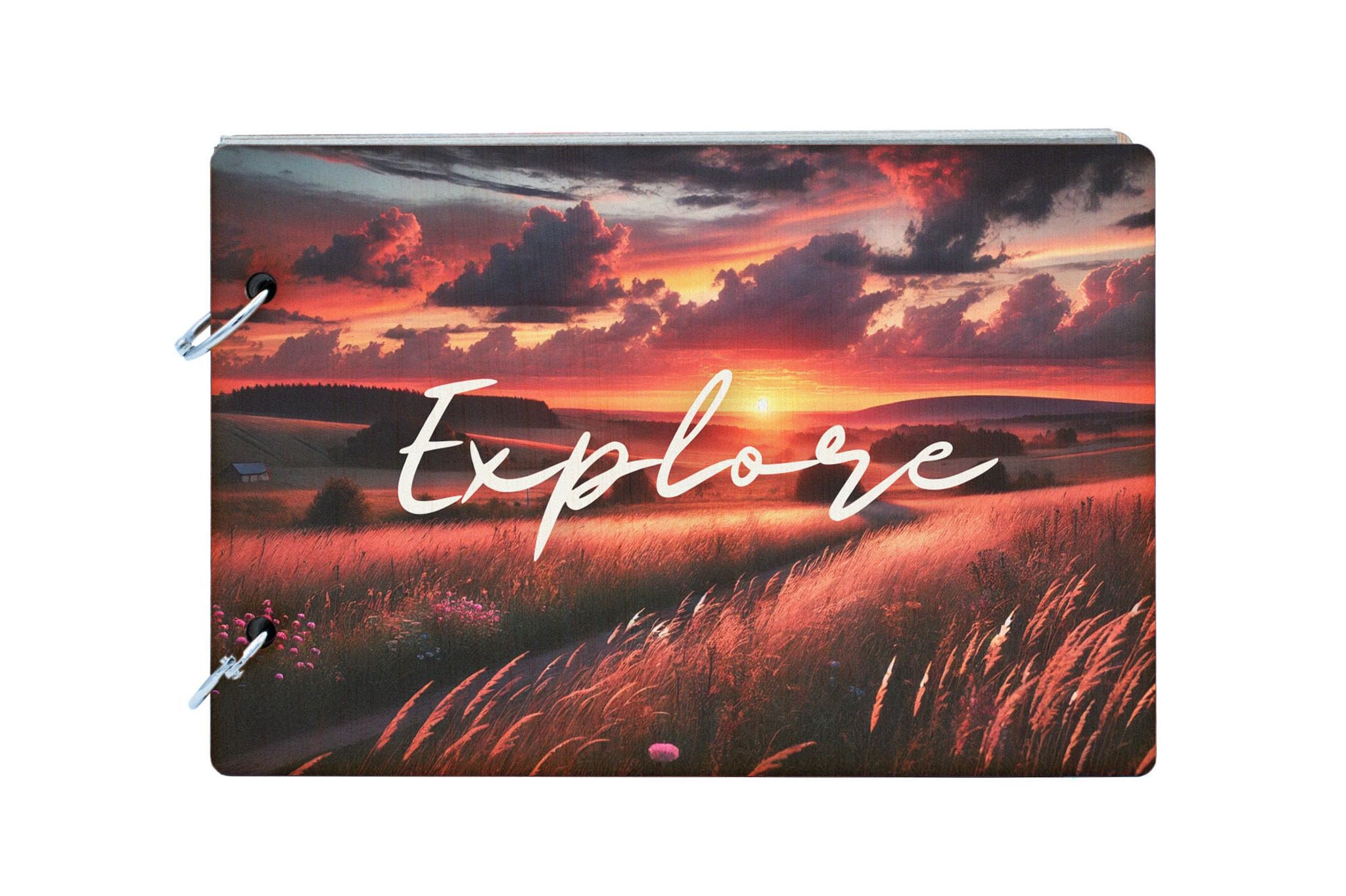 Immerse yourself in the beauty of a Rustic Sunset Adventure with our 'Explore Landscape Memories' scrapbook. This elegant artwork-inspired book features warm tones and a full colour front cover showcasing a stunning sunset over a tranquil field. The wooden cover adds a rustic touch, perfect for capturing your countryside travel memories. The 25 recycled pages inside are blank, providing a canvas for your inspiration. Let your creativity run wild as you prioritise your memories in this unique and AI-generated artwork scrapbook.