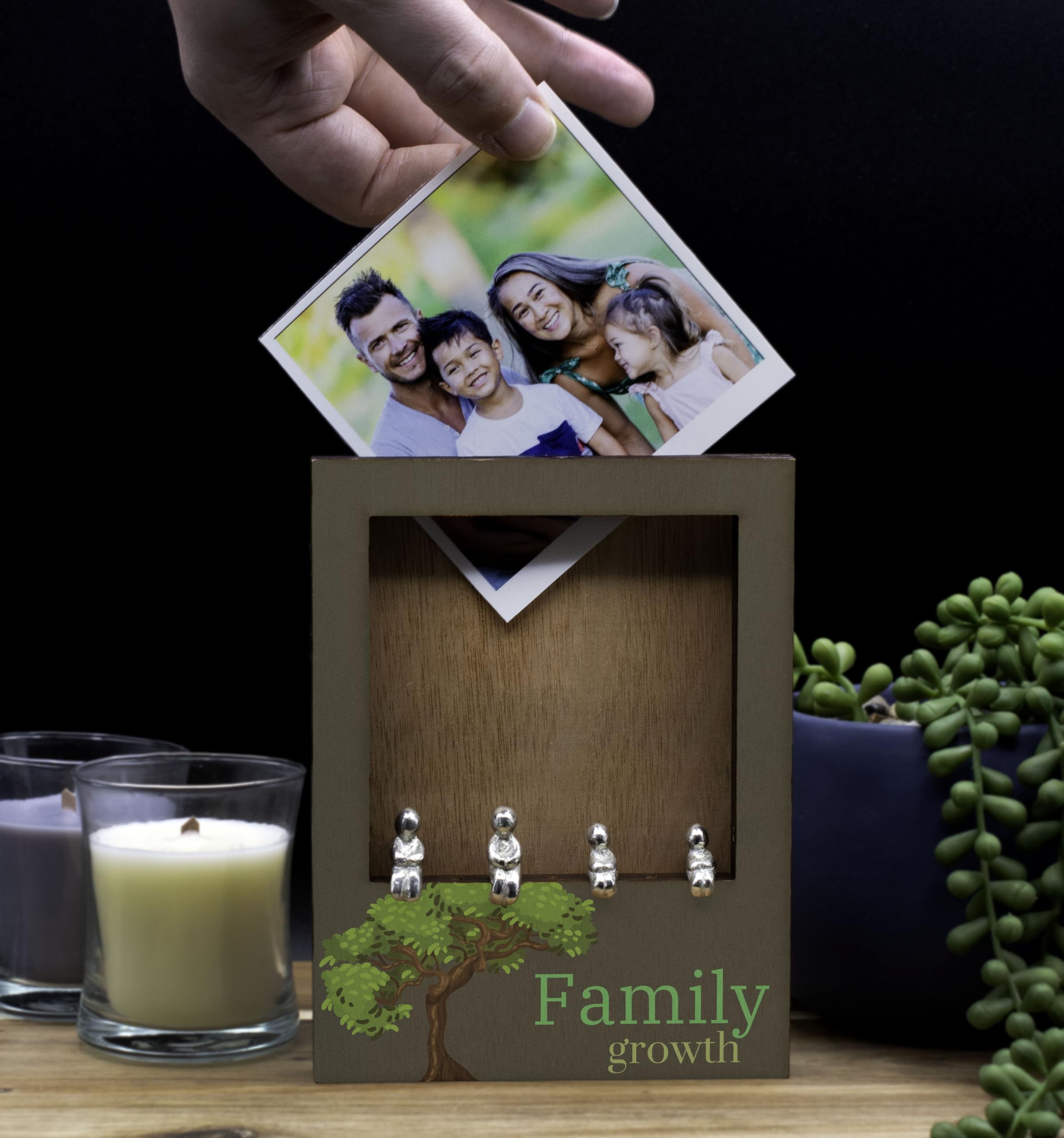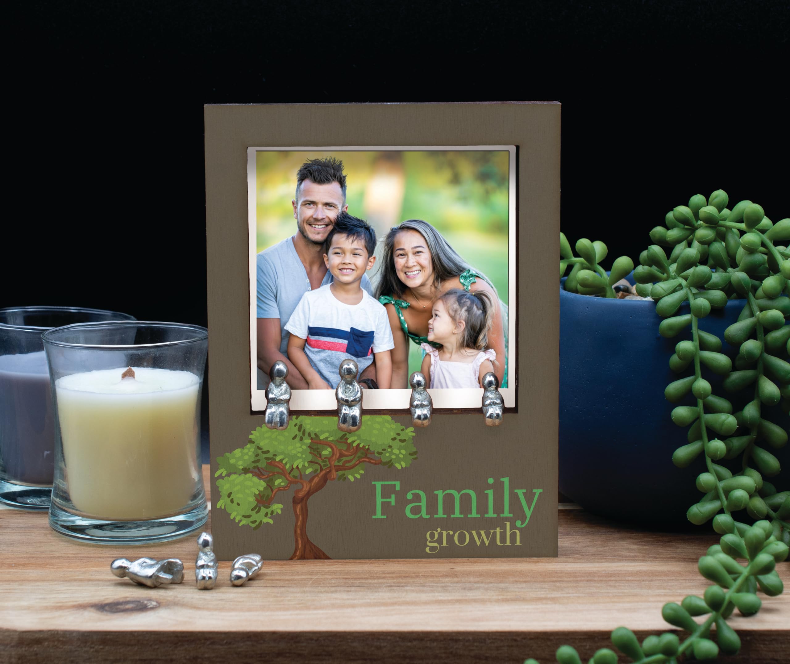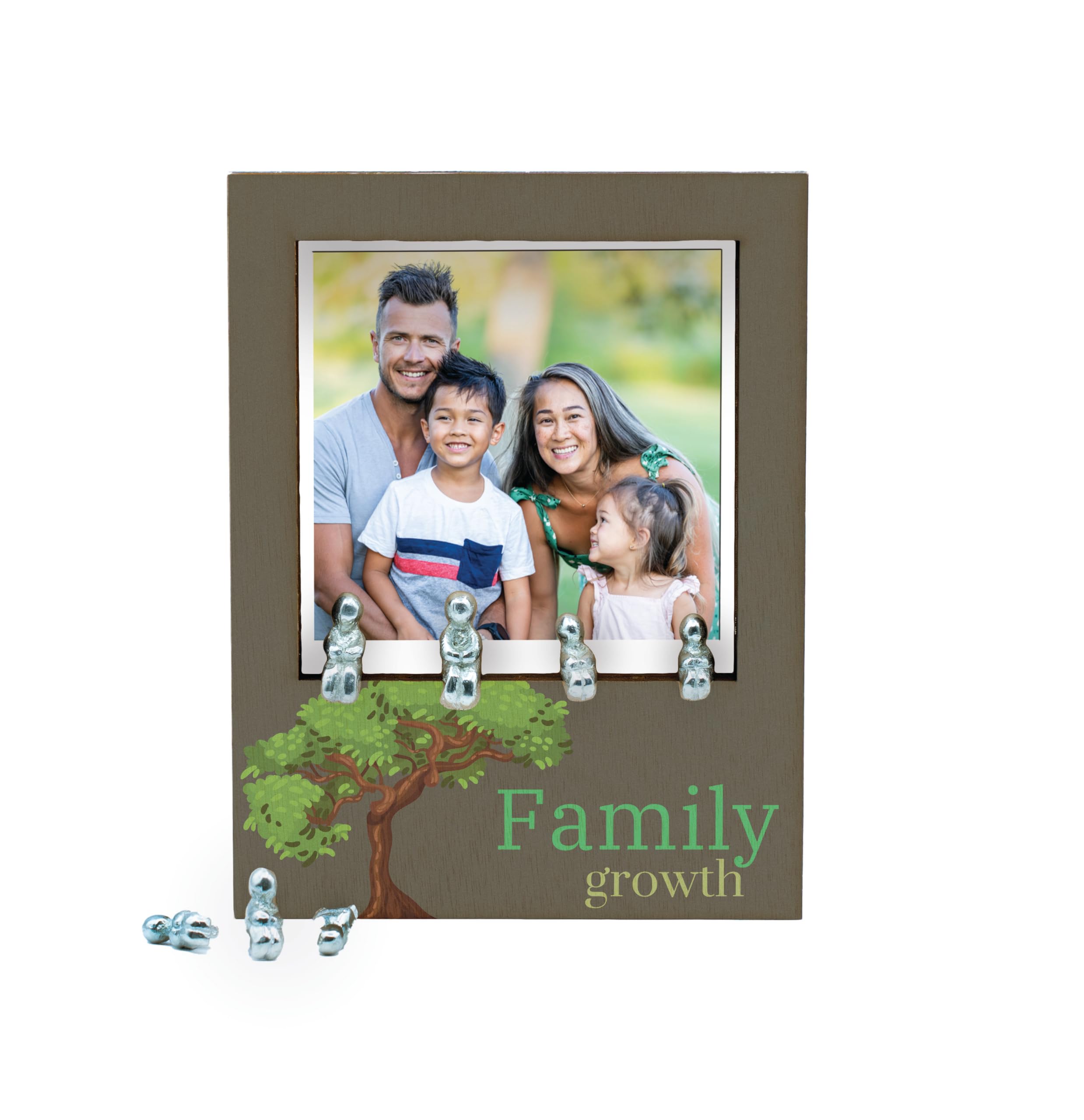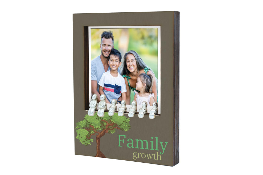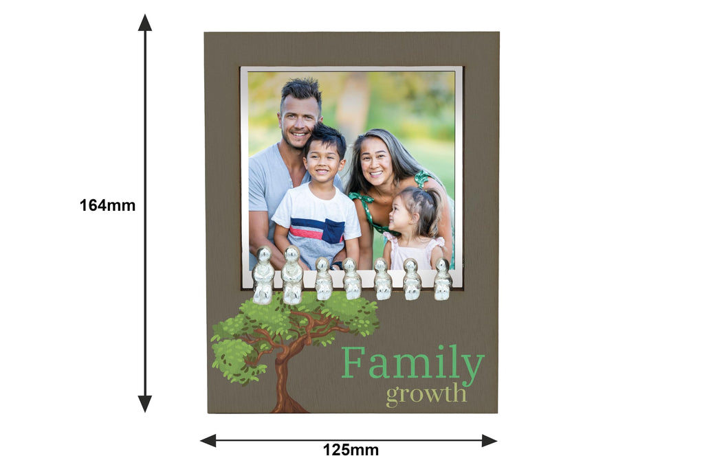 Enhance your home decor with this charming Rustic Wooden Family Tree Frame with Tin Figure Accents. This handcrafted laser cut plywood photo frame features a unique tree design, complete with tin figurine accents that add a touch of novelty to your space. The frame is UV printed with the message 'family growth', serving as a constant reminder of the importance of family memories and growth. Ideal for tabletop display, this nature-inspired frame is a perfect keepsake for treasuring your family moments. Give the gift of family-themed decor with this unique photo holder that is sure to impress. Add a touch of rustic charm to your home with this family tree frame that is both functional and stylish.