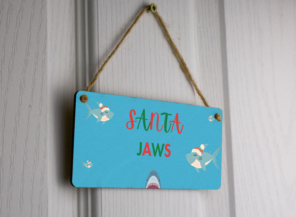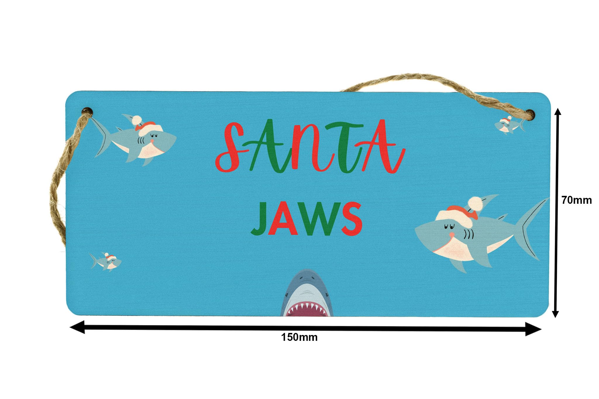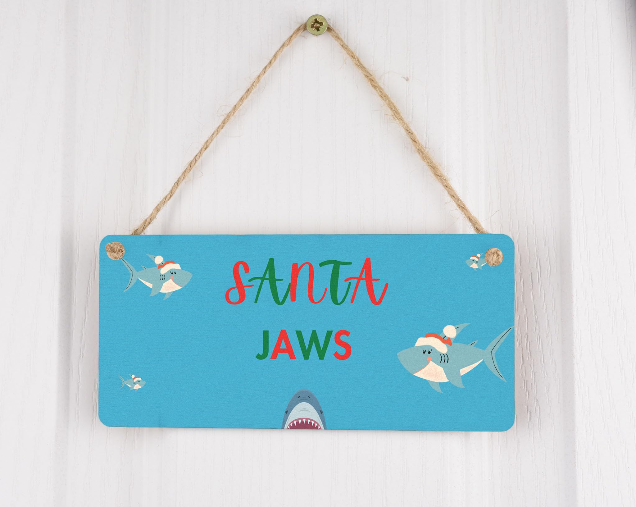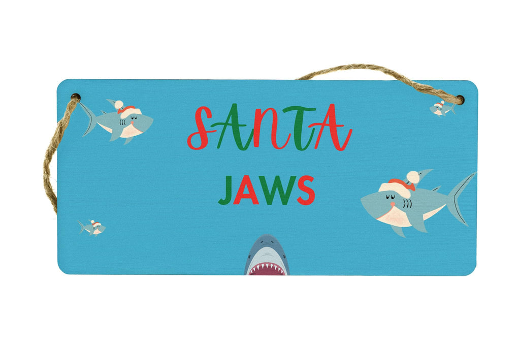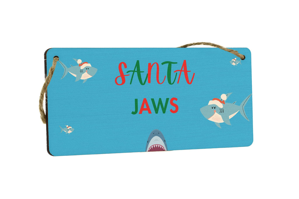 Add a splash of festive fun to your Christmas decorations with our Funny Plywood Hanging Sign. This charming sign is the perfect gift for kids, family, parents, couples, grandparents, and siblings. Made from quality plywood, it is sturdy and durable, ensuring it will last for many holiday seasons to come. The sign features a full-color design with images of sharks wearing Santa hats on a vibrant blue background. The bold red and green writing adds to the festive vibes, making it a delightful addition to any room in your home. Make this Christmas one to remember with our Santa Jaws sign!