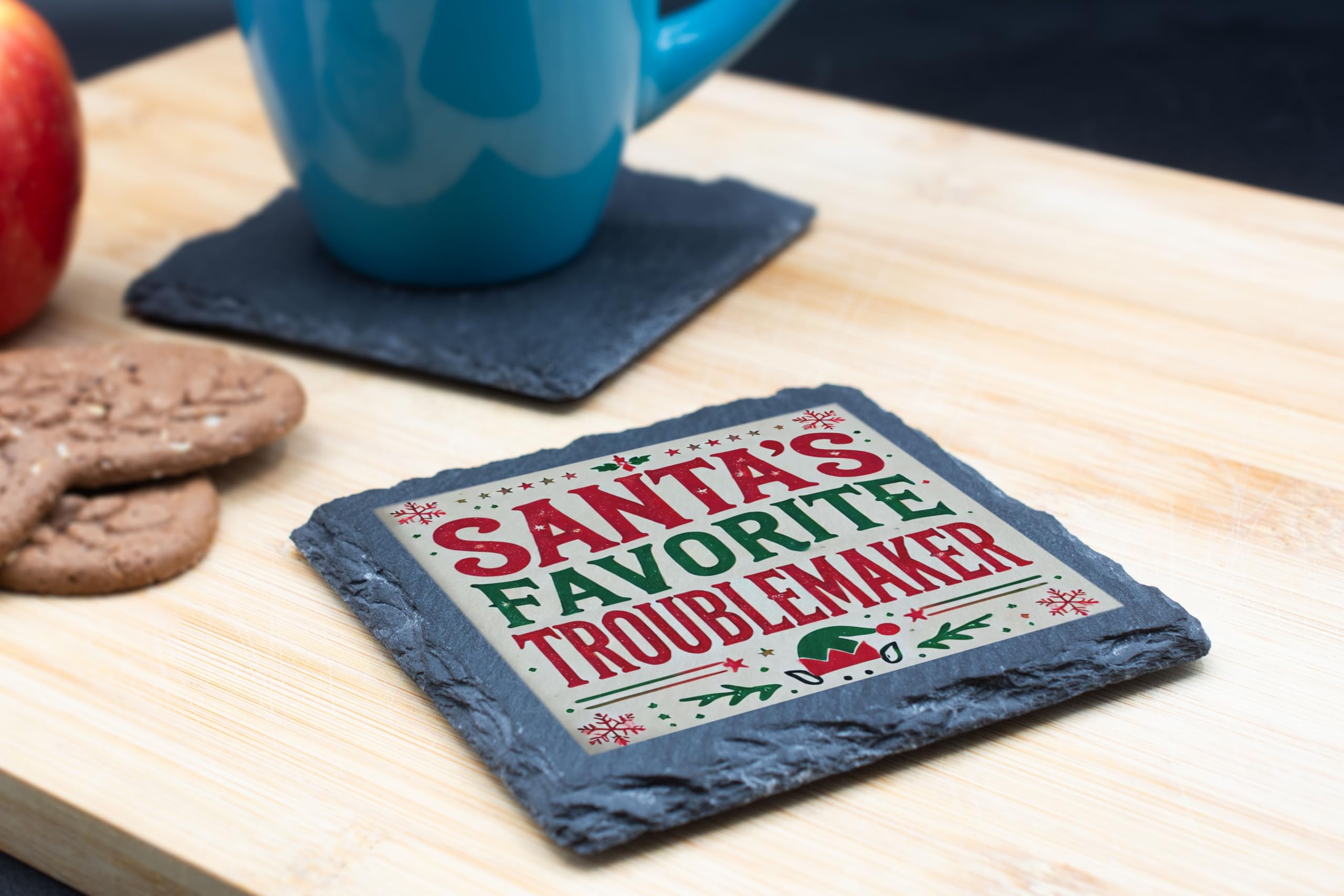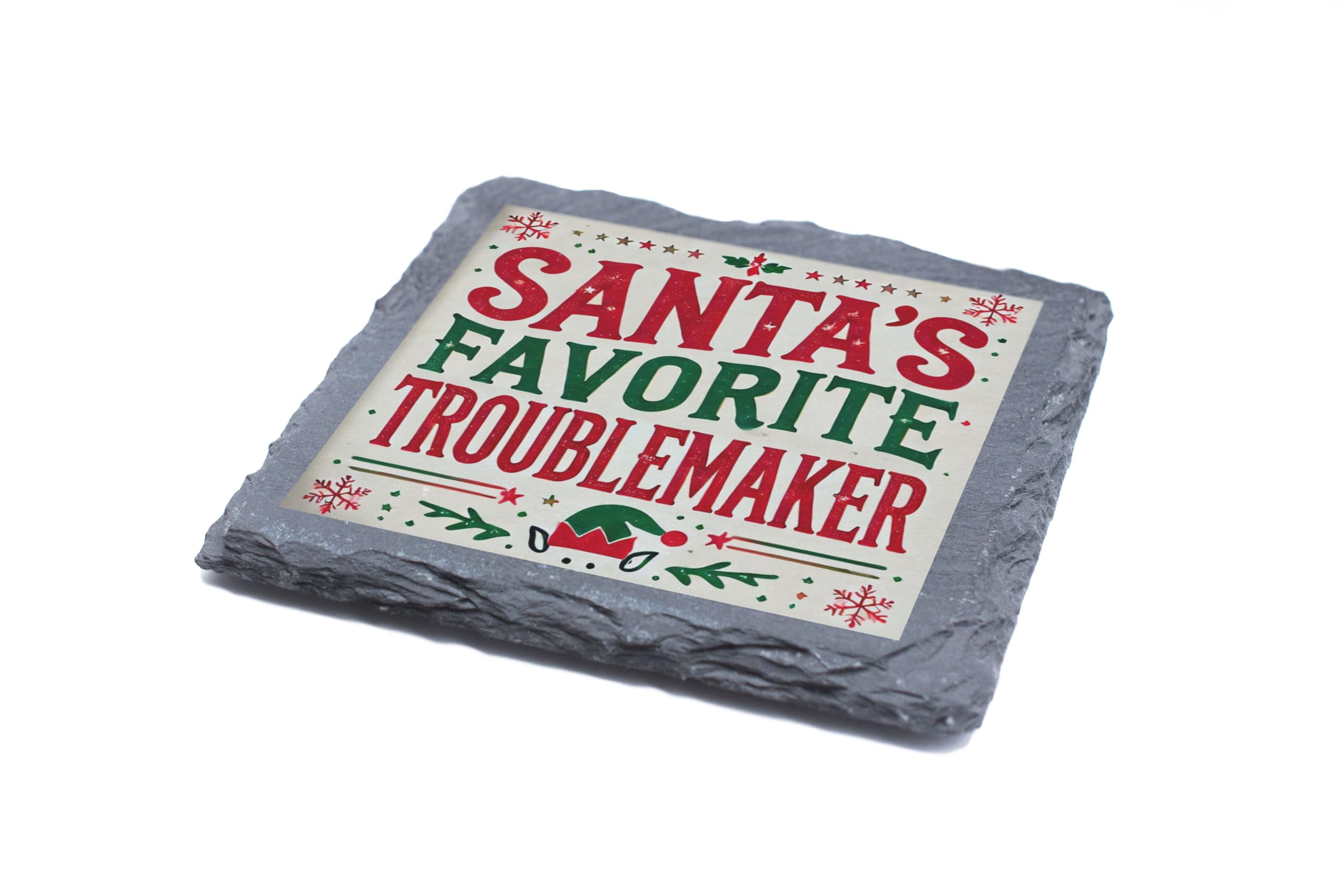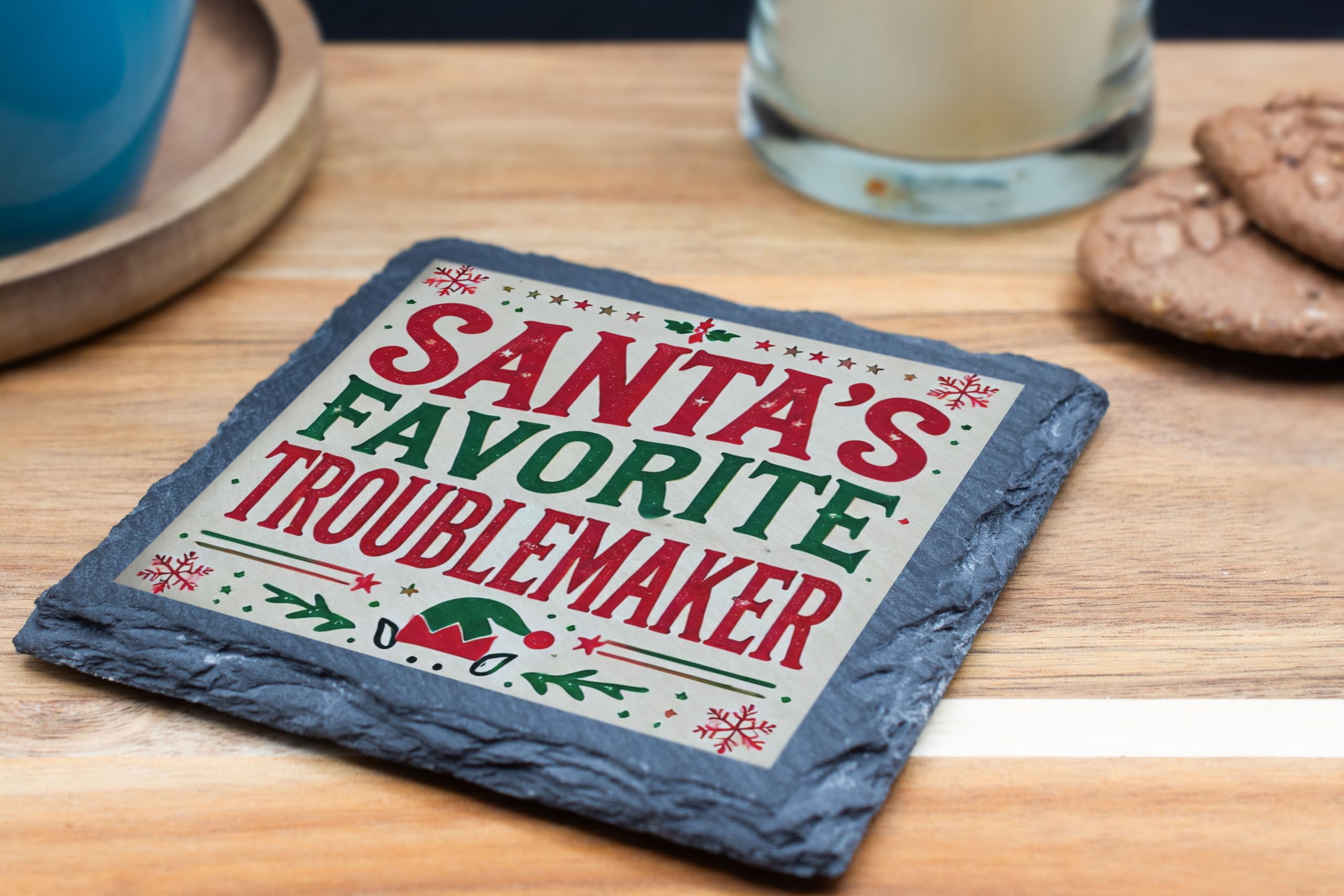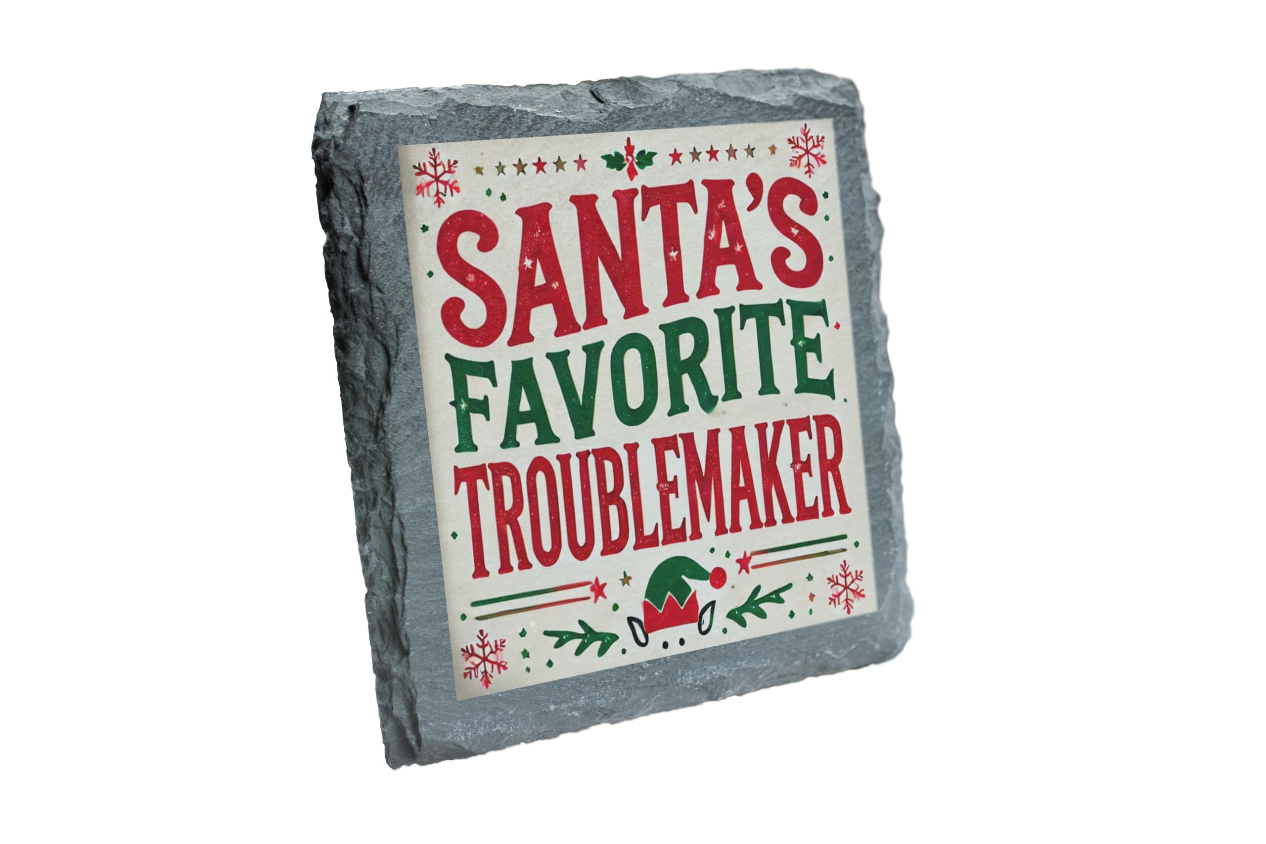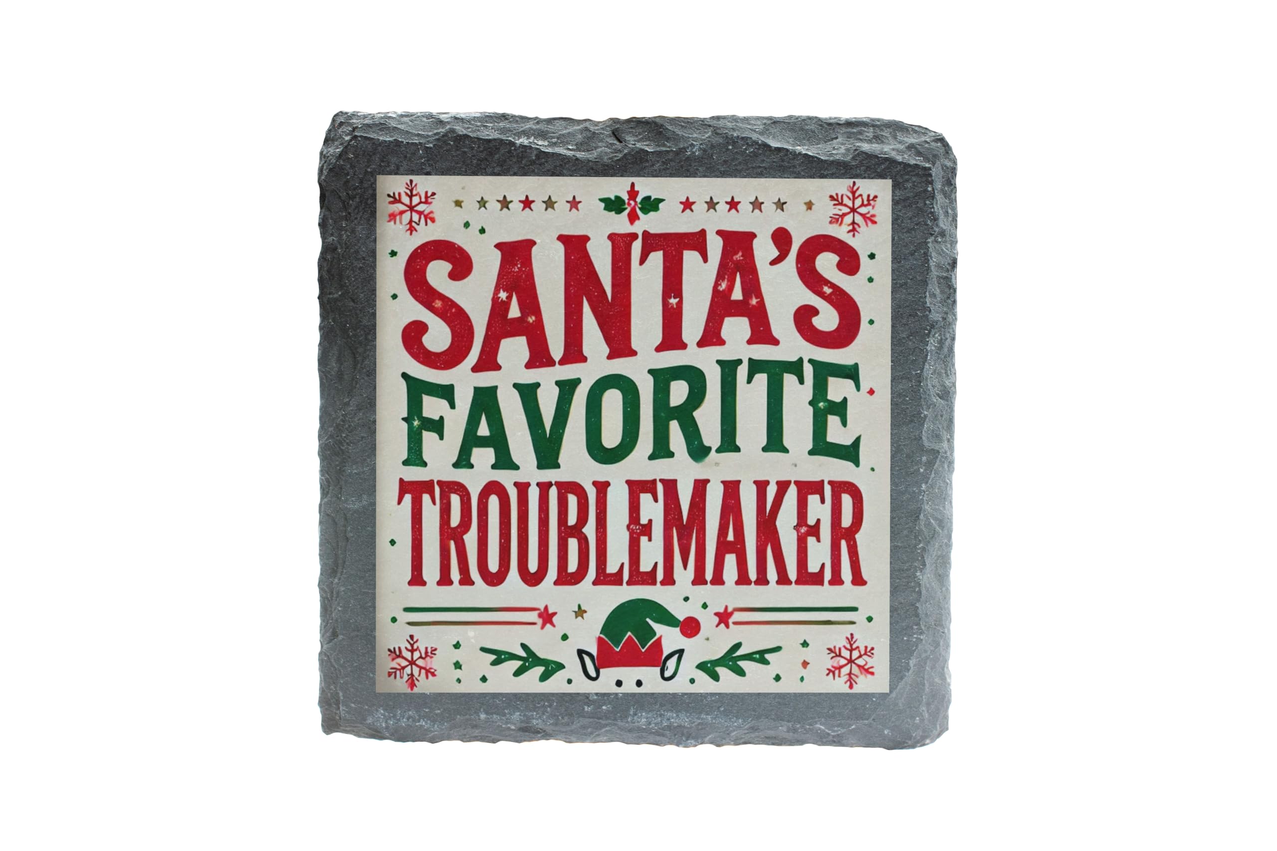 Bring a touch of holiday mischief to your home with the "Santa's Favorite Troublemaker" slate coaster. This fun and festive drink accessory is sure to spark laughter and holiday cheer at any Christmas gathering. Crafted from premium natural slate, this coaster not only offers sturdy protection for your tables and surfaces but also doubles as a delightful piece of seasonal decor. Whether you're sipping eggnog, mulled wine, or your favorite holiday cocktail, this coaster is the perfect festive companion. Looking for a holiday gift or stocking stuffer? This quirky coaster is an excellent choice for friends, family, or anyone who takes pride in their "troublemaker" title. Add some laughter and joy to your Christmas celebrations with this unique and charming coaster!