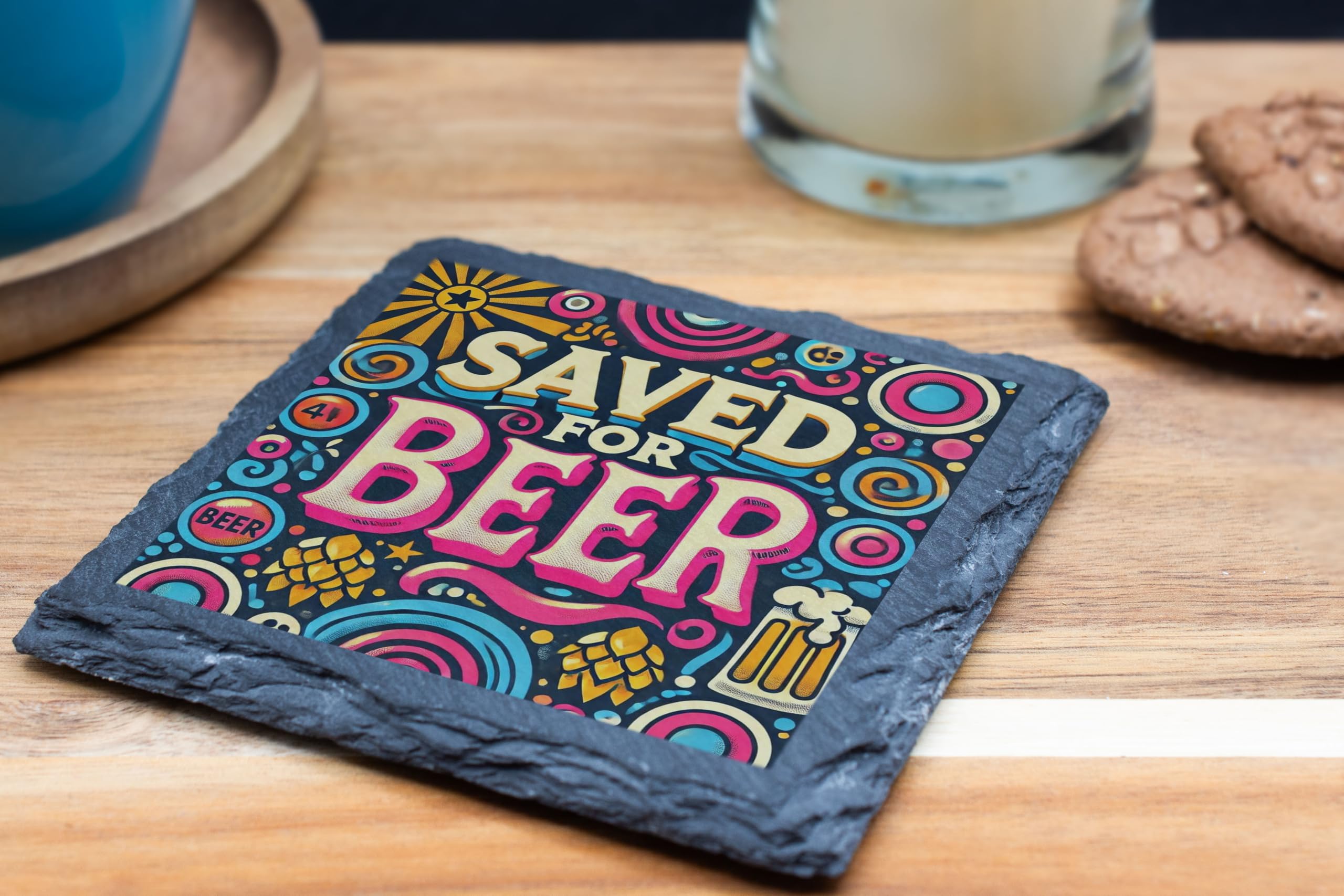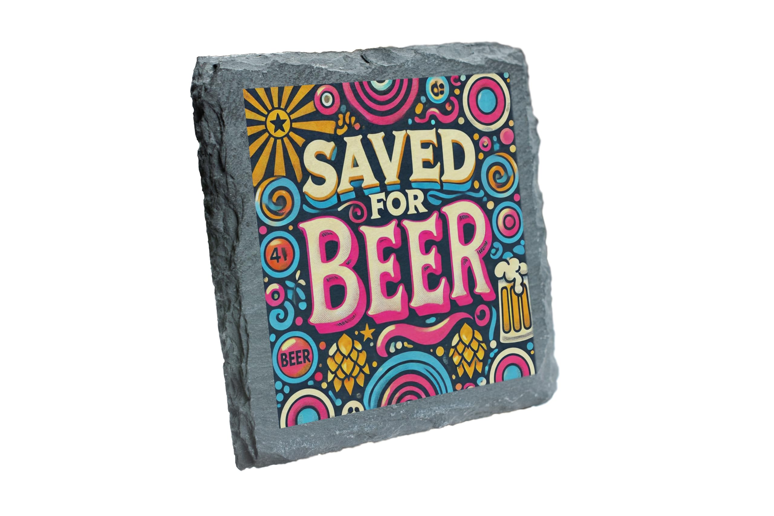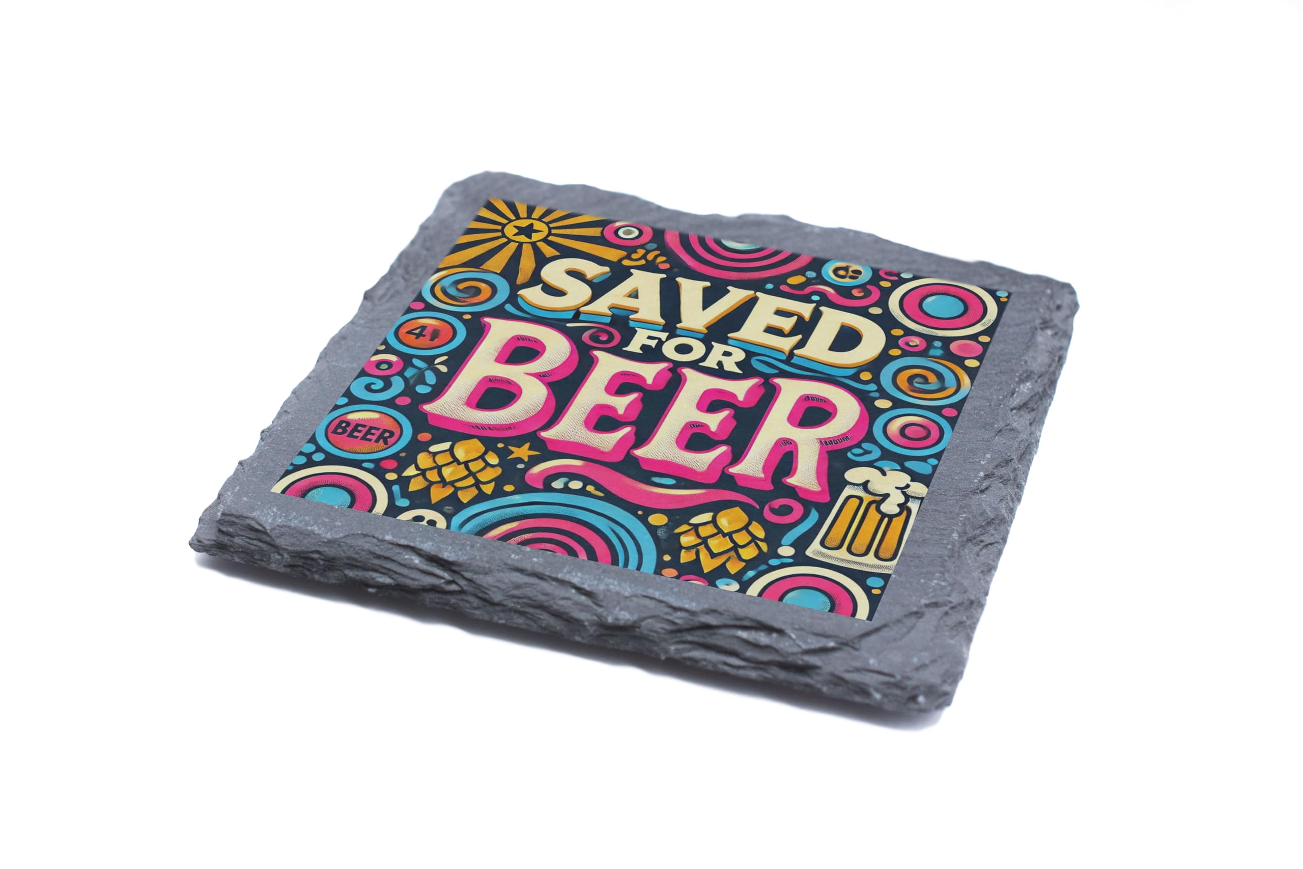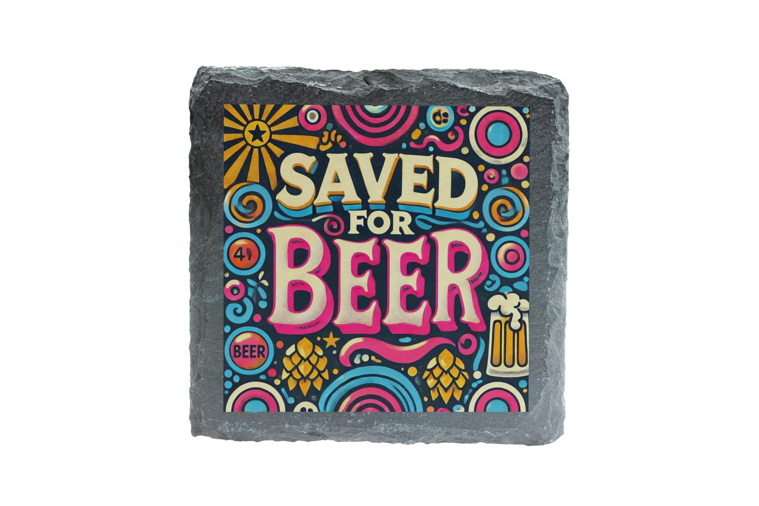 Celebrate your love for beer with the Saved for Beer Slate Coaster, a unique and colorful addition to any space. Featuring bold typography and fun illustrations of hops, bubbles, and beer mugs, this coaster combines personality with functionality. Its playful design is sure to be a conversation starter during gatherings or parties. Made from premium natural slate, this coaster is as durable as it is stylish. Its rustic and sturdy build makes it perfect for protecting your surfaces from spills and condensation, all while adding a touch of humor and charm. Whether you?re hosting a beer tasting or simply enjoying your favorite brew, this coaster is the perfect companion. Surprise your beer-loving friends, family, or colleagues with this quirky and thoughtful gift. Ideal for birthdays, housewarmings, or just because, the Saved for Beer Slate Coaster is a delightful way to share the love of beer.
