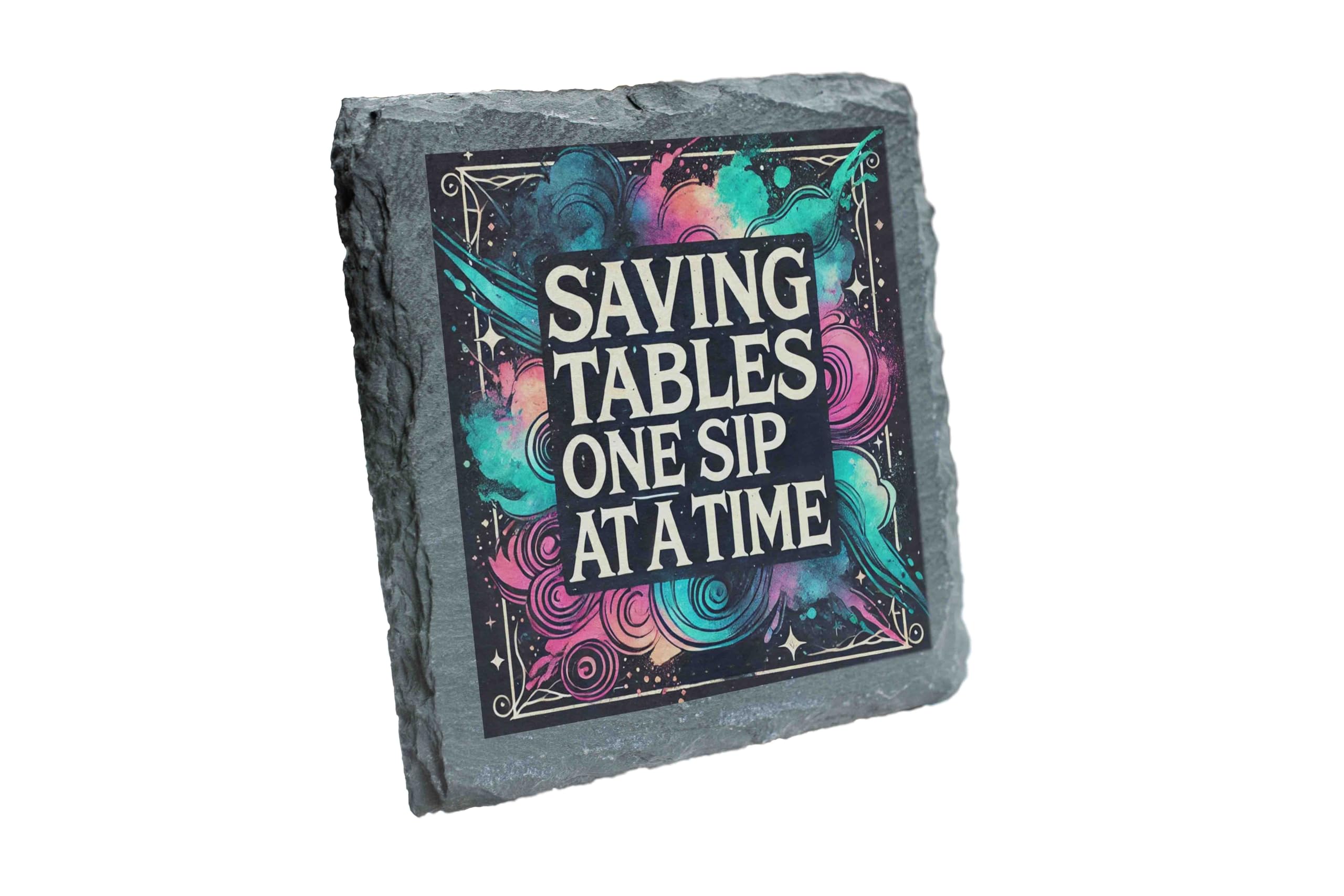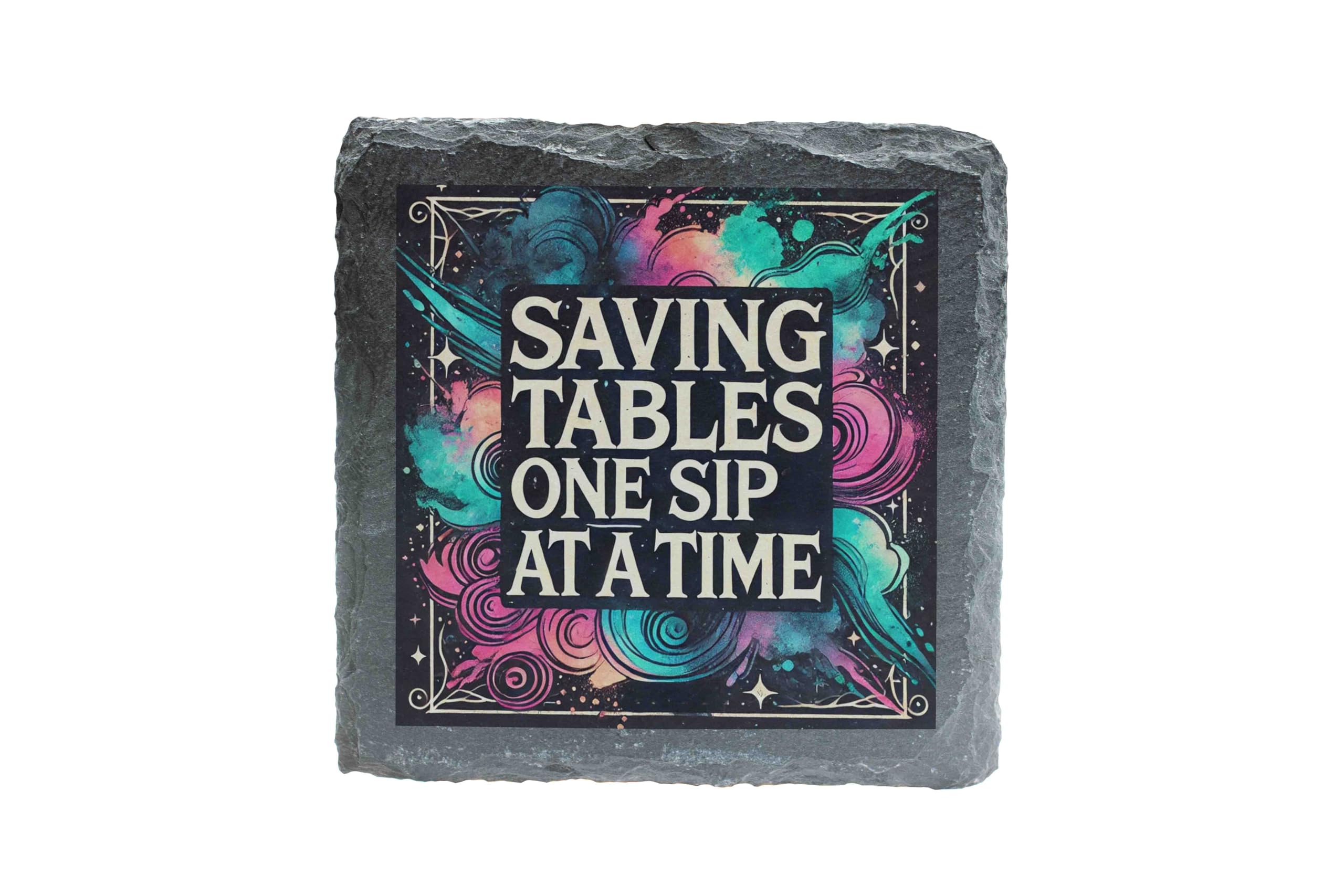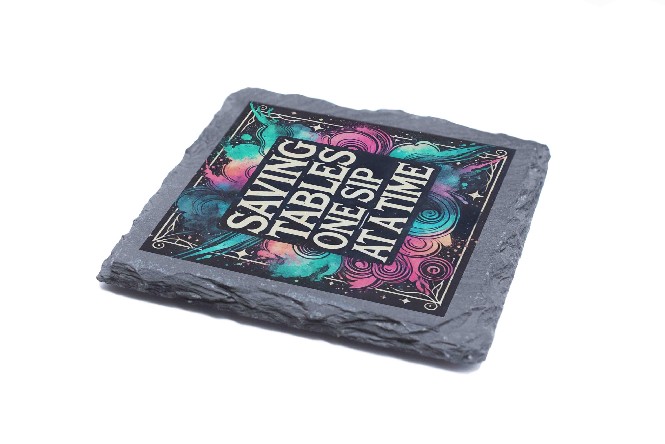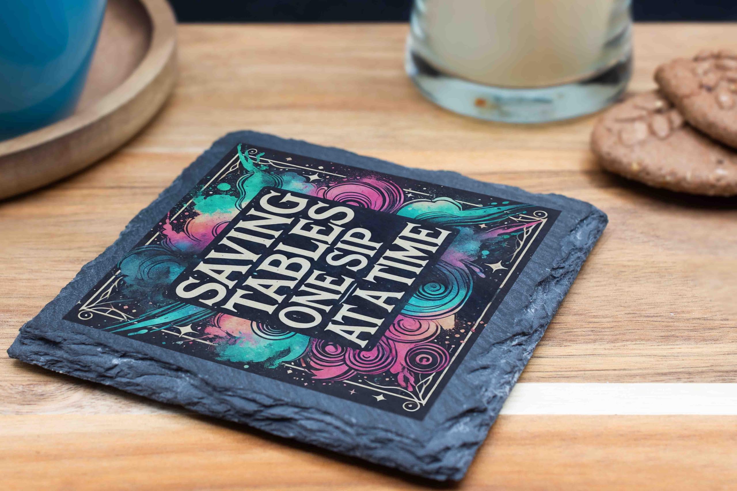 Elevate your table d?cor with the "Saving Tables One Sip at a Time" Slate Coaster. This stunning piece combines functionality with artistic elegance, featuring a cosmic-inspired design that adds a unique flair to any coffee table, desk, or bar. Crafted from premium natural slate with rugged edges, this coaster is both durable and visually striking. It?s designed to protect surfaces from heat, moisture, and scratches, making it as practical as it is stylish. Whether as a personal accessory or a thoughtful gift for someone who loves celestial designs, this coaster is a perfect blend of charm and utility. Easy to maintain and built to last, it?s a standout piece for any home or office.