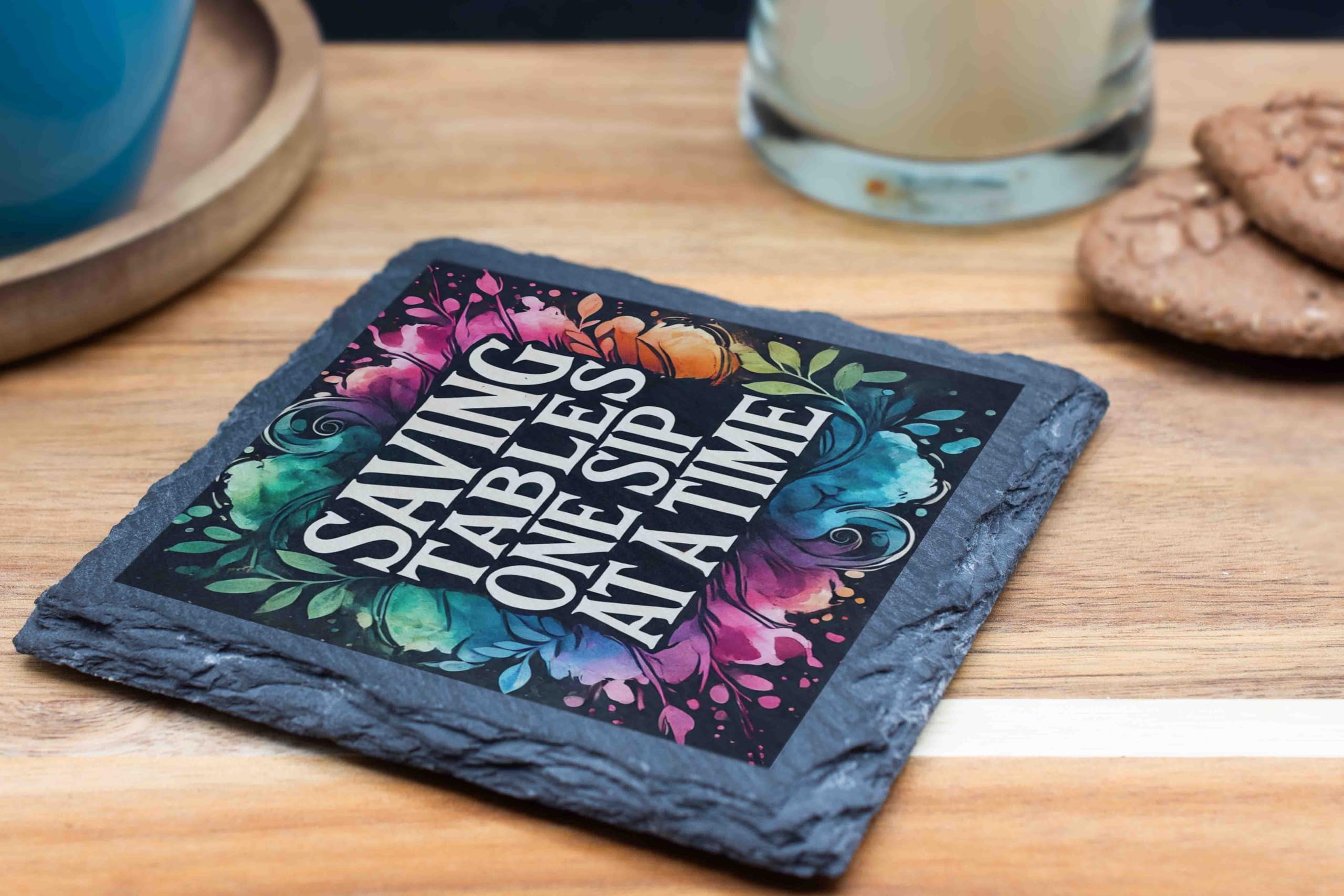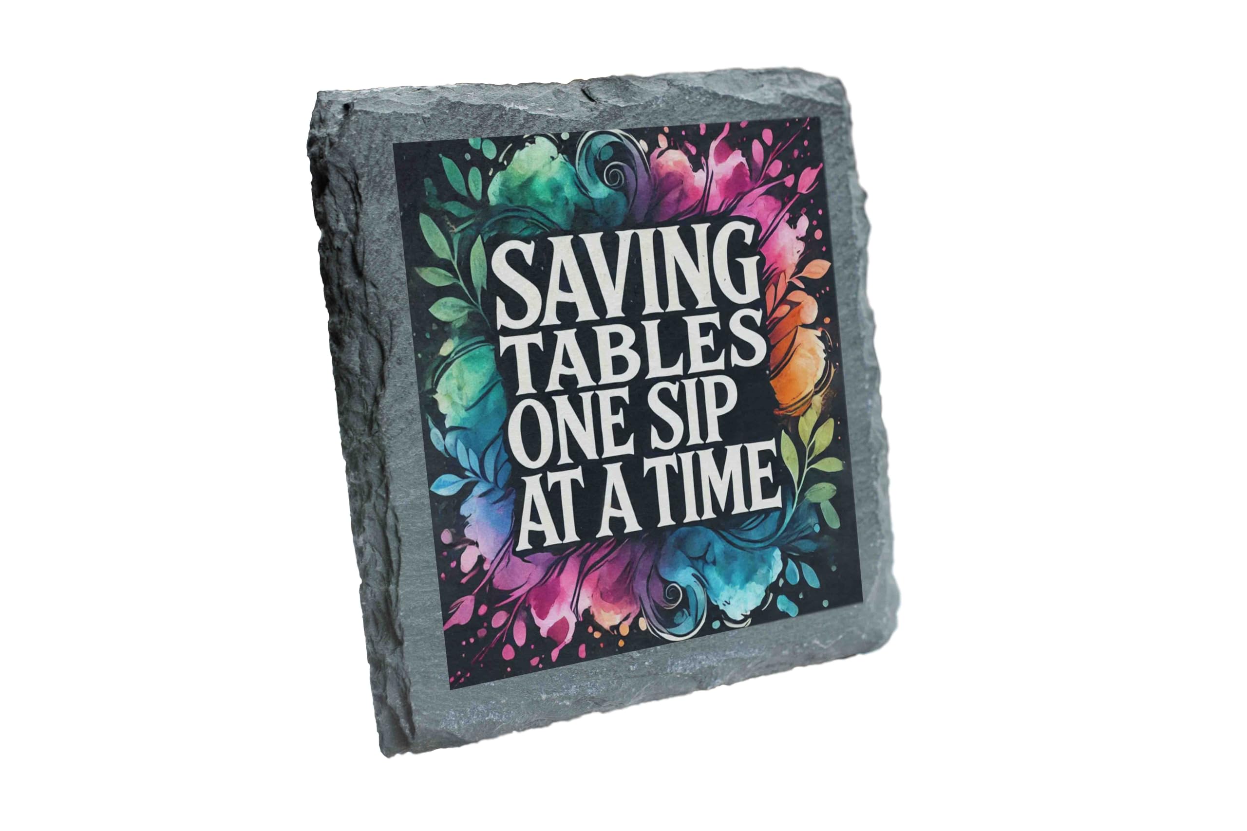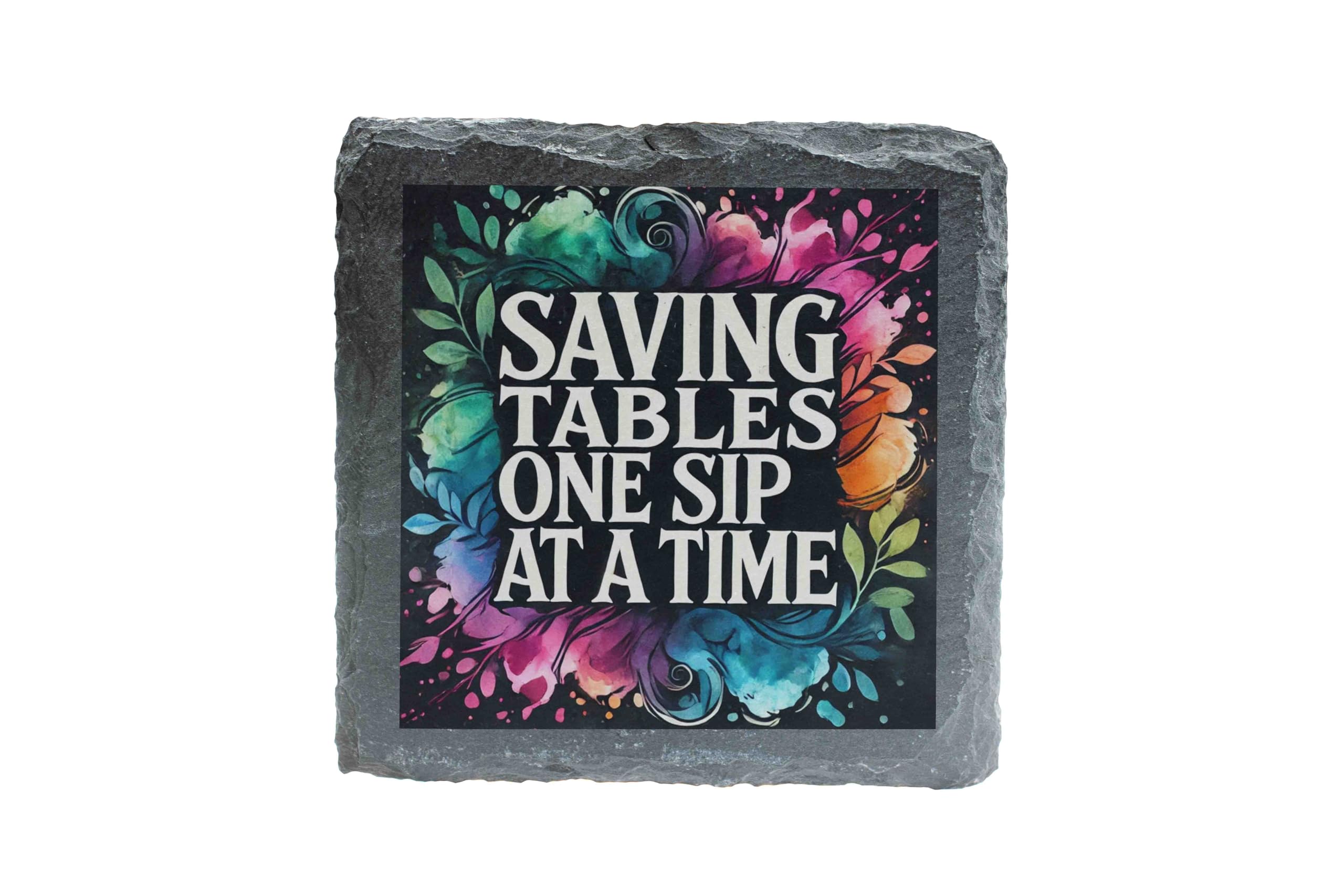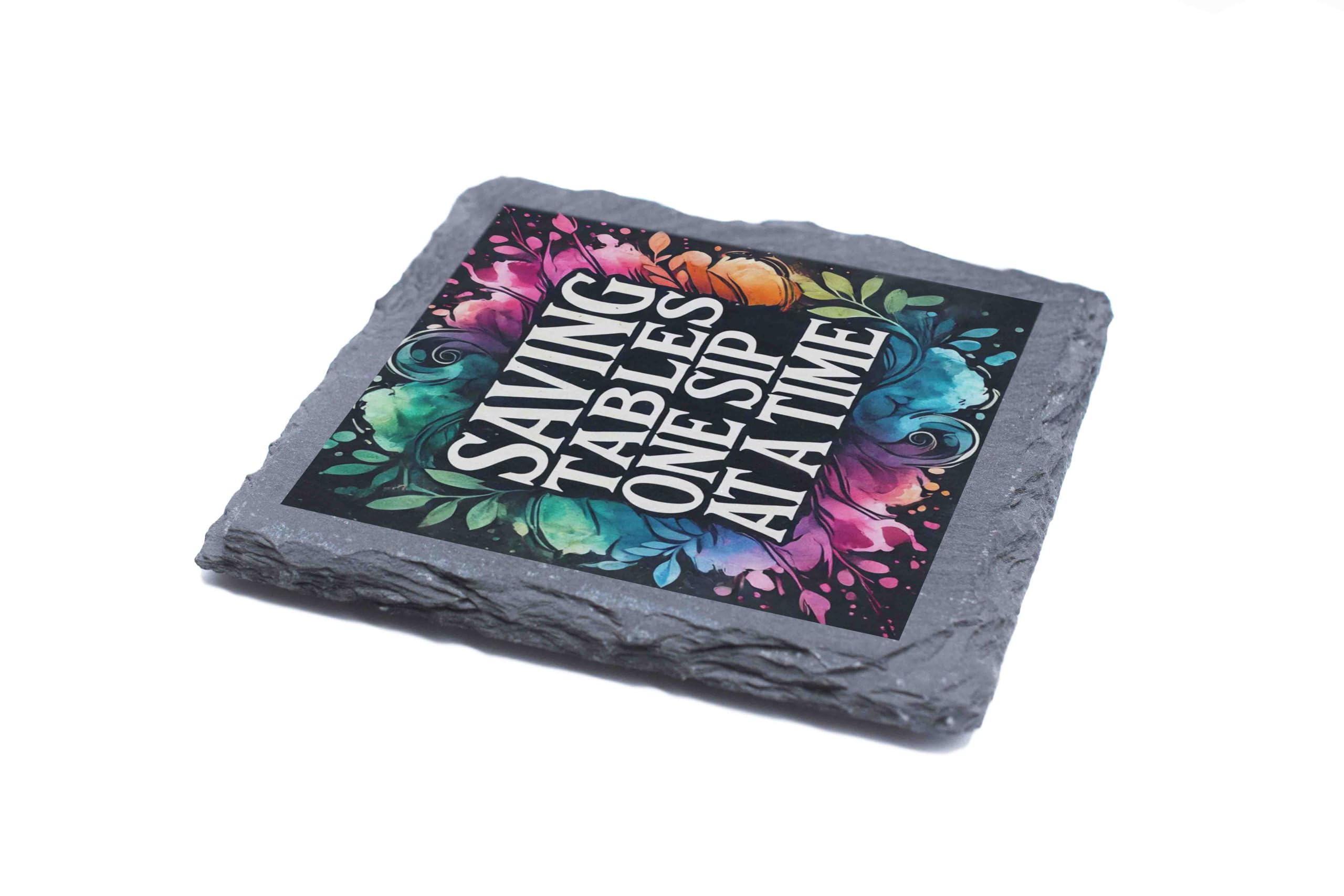 Elevate your table d?cor with the "Saving Tables One Sip at a Time" Slate Coaster. Featuring a stunning floral design that bursts with color and elegance, paired with the bold and witty phrase, this coaster is both functional and decorative. It?s perfect for adding personality and protection to your furniture. Made from premium natural slate, this coaster combines durability with a rustic, sophisticated look. It?s designed to guard your surfaces from heat, moisture, and scratches while being easy to clean and maintain. Whether as a stylish addition to your own home or a thoughtful gift for a loved one, this coaster is a beautiful blend of practicality and artistry that?s sure to impress.