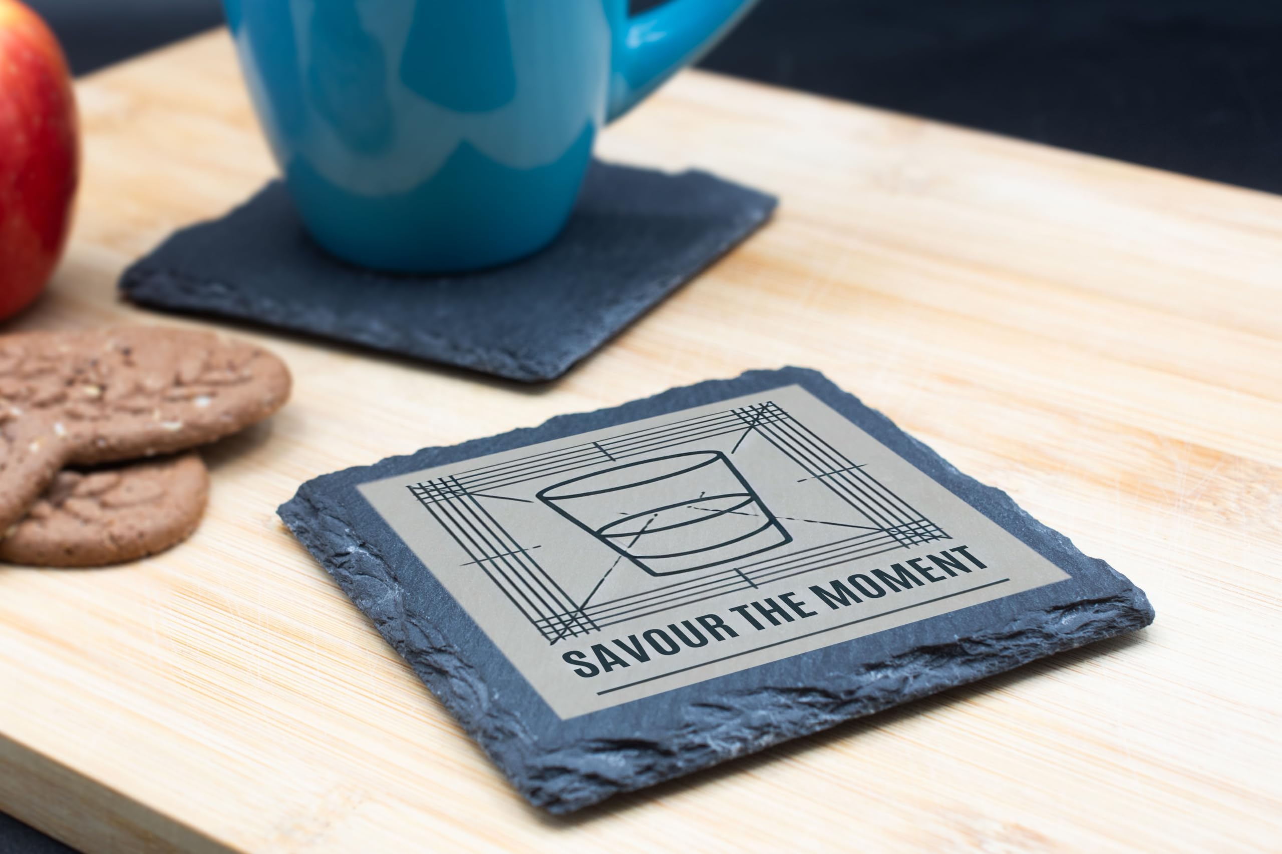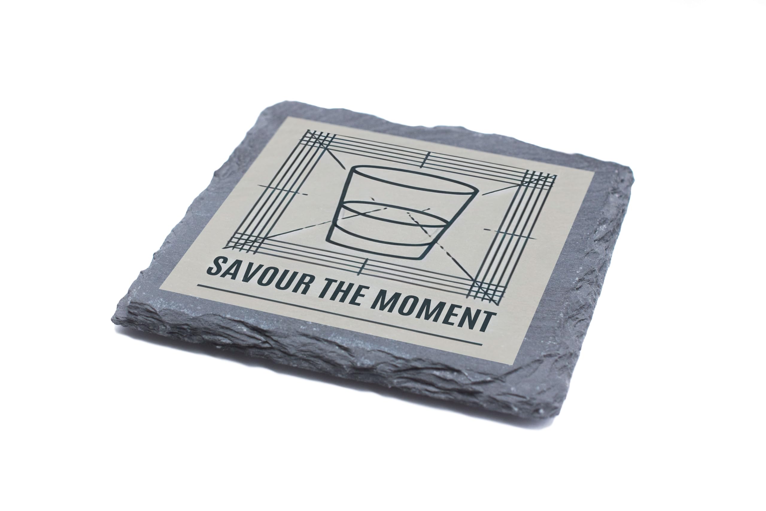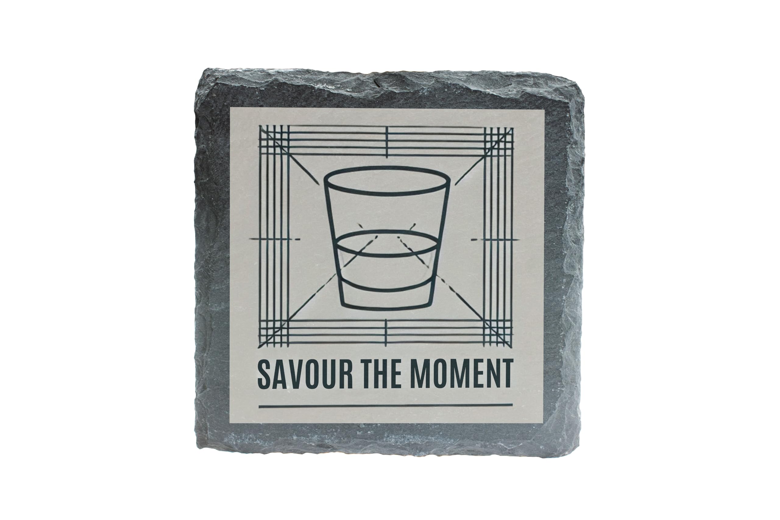 Embrace life's special moments with this elegant slate coaster, designed for those who appreciate fine whiskey and great design. The coaster features a minimalist geometric illustration of a whiskey glass and the inspirational phrase "Savour the Moment," making it both functional and decorative. Crafted from premium natural slate, this coaster offers durability and a rustic yet polished look. Its textured surface provides a secure spot for your favorite drink while protecting your furniture from condensation and scratches. Whether you?re hosting a gathering or enjoying a quiet evening with a drink, this coaster adds a touch of sophistication to any occasion. It's also a perfect gift for whiskey aficionados, cocktail enthusiasts, or anyone who values stylish, functional decor.