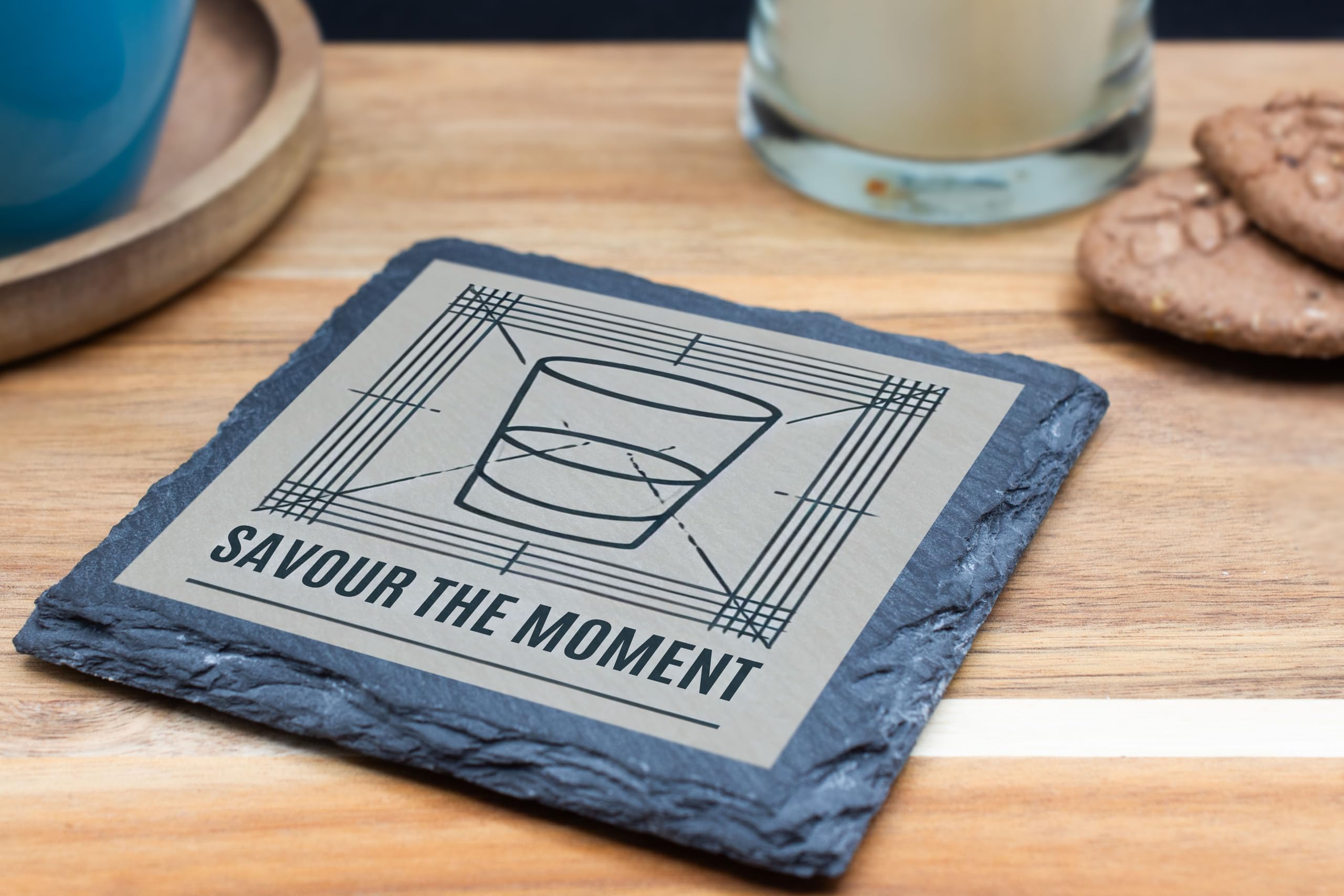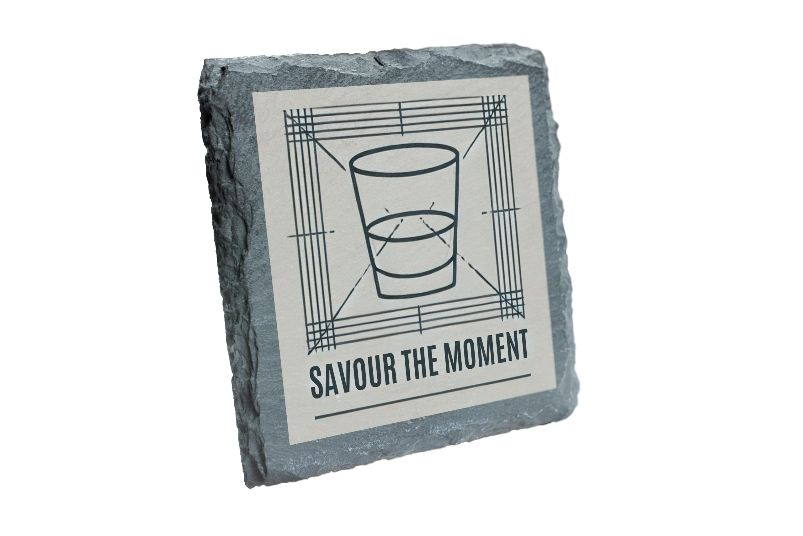 - Stylish Design: Features a sleek geometric illustration of a whiskey glass with the motivational phrase "Savour the Moment."