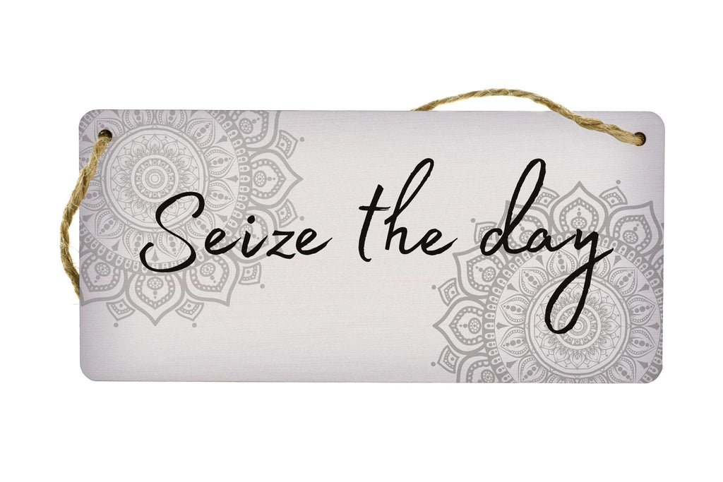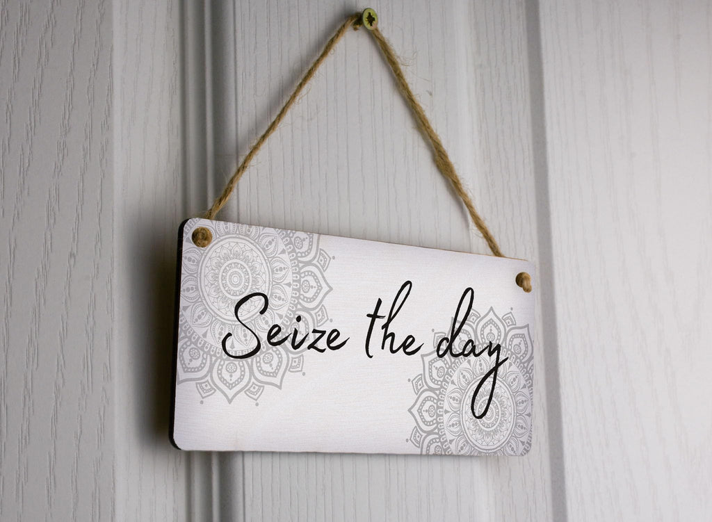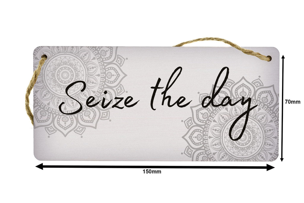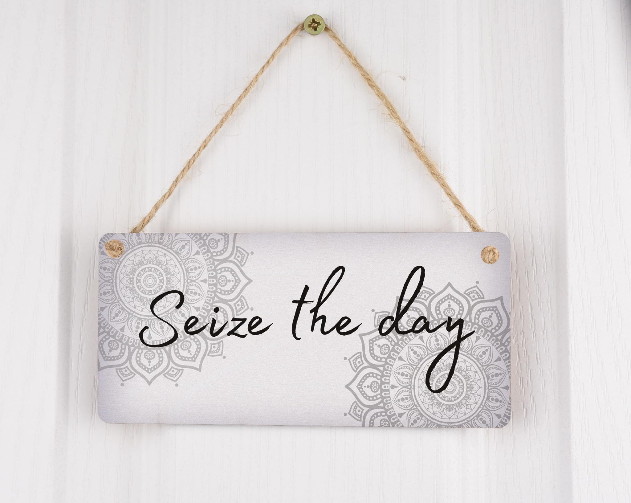 This Motivational Plywood Hanging Sign is the perfect addition to any home. Made from quality plywood, this sign features a grey background with beautiful mandala designs in full colour. The writing on the sign reads 'Seize the Day', serving as a daily reminder to live life to the fullest. Whether you hang it in your bedroom or living room, this sign will bring inspiration and motivation to any space. It also makes a thoughtful gift for your home, husband, wife, partner, son, daughter, or siblings. Add a touch of inspiration to your space with this beautiful and meaningful room sign.