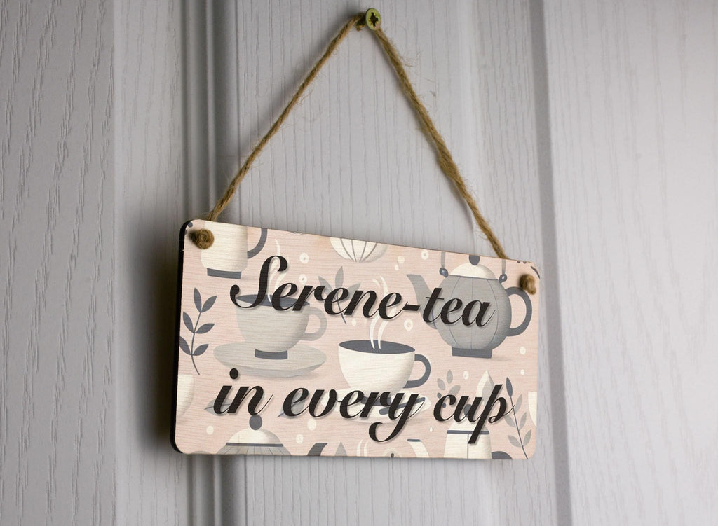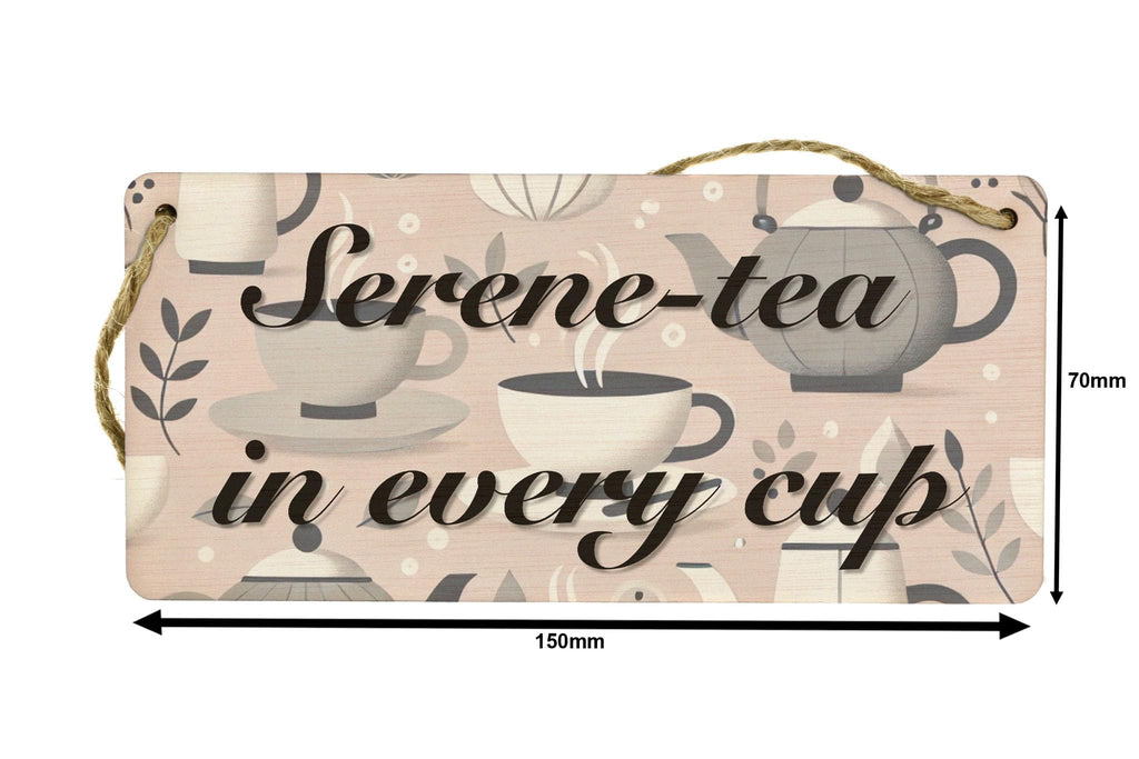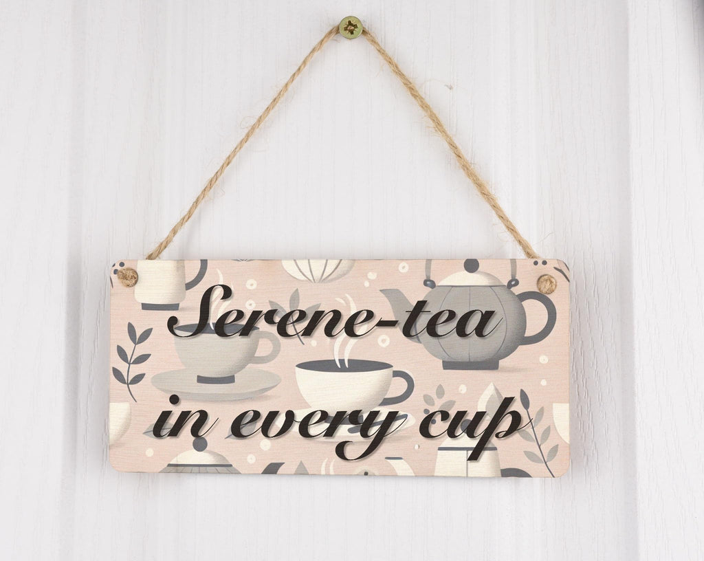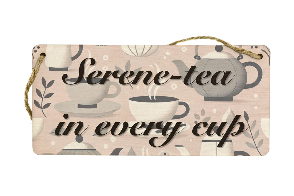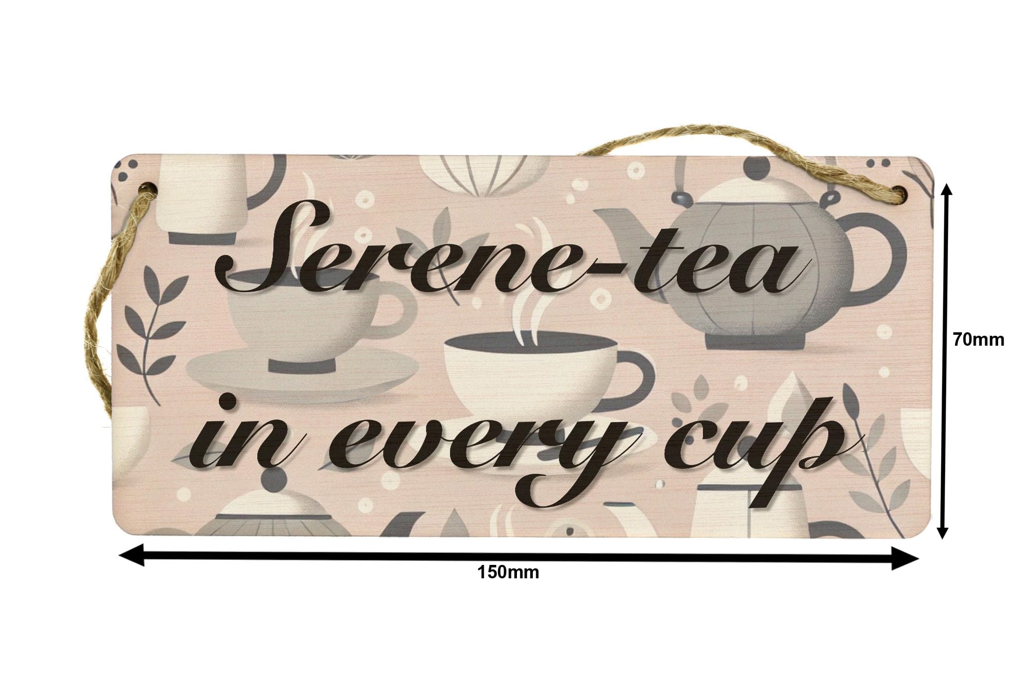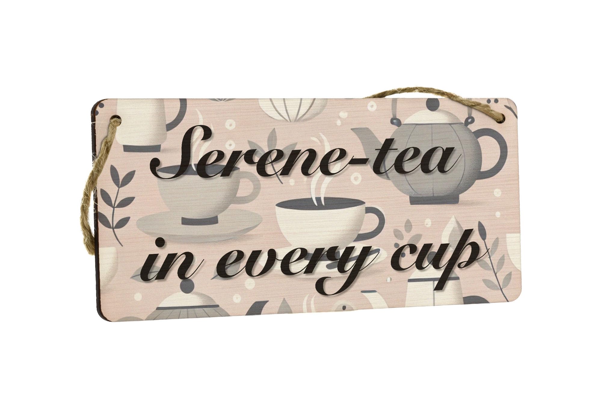 Add a touch of whimsy and tranquility to your home with our Serene-Tea Pun Wall Art Sign! This modern tea themed decor is perfect for creating relaxing vibes in your cosy kitchen. The soft pink background and sleek typography give this piece a minimalistic style that will complement any home decor. Featuring a charming teapot and teacup design, this wall art sign is sure to bring a sense of calm and peacefulness to your space. The playful lettering adds a humorous message that will make you smile every time you see it. This tea lover's gift is made of handcrafted laser cut plywood and comes ready to hang with twine included. Treat yourself or a loved one to this delightful piece of home decor that reads 'serene tea in every cup'.