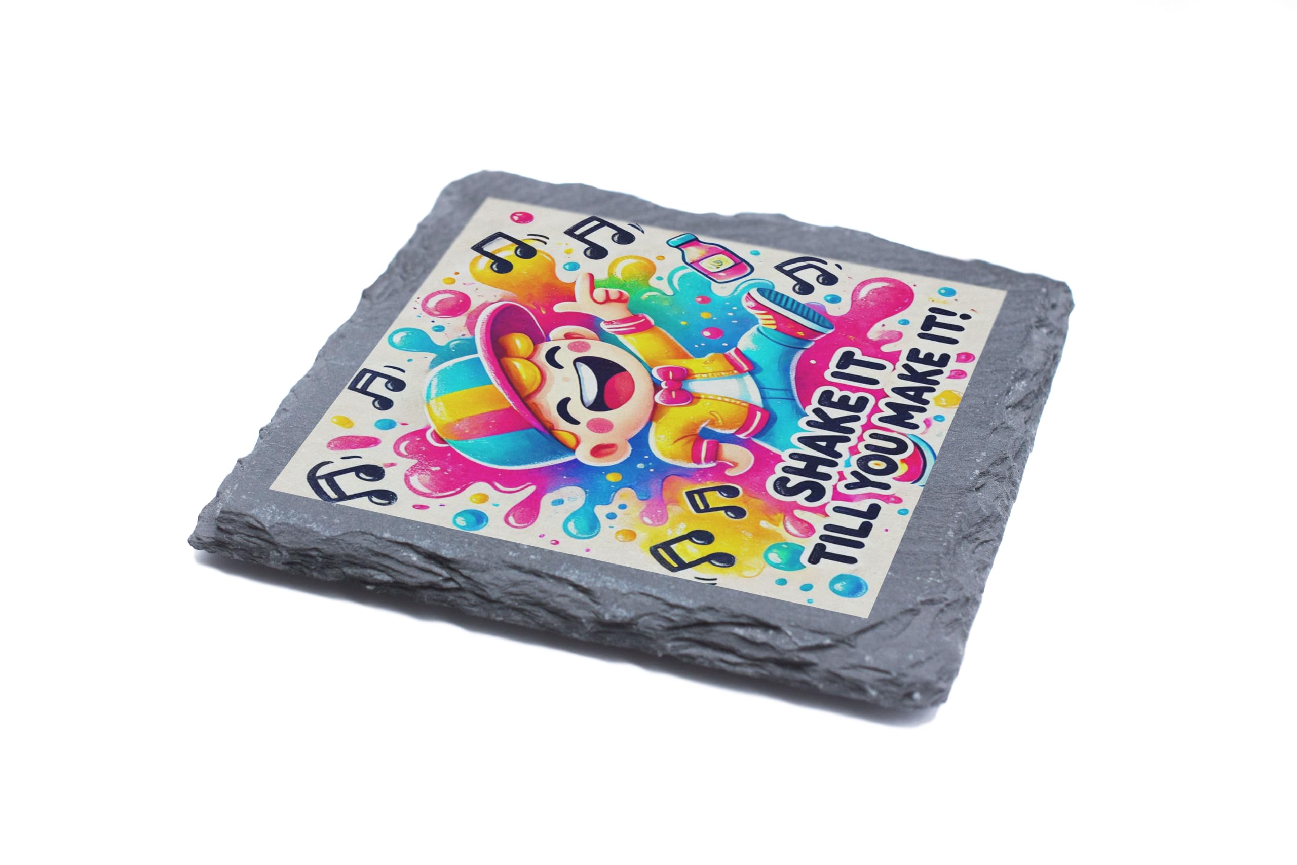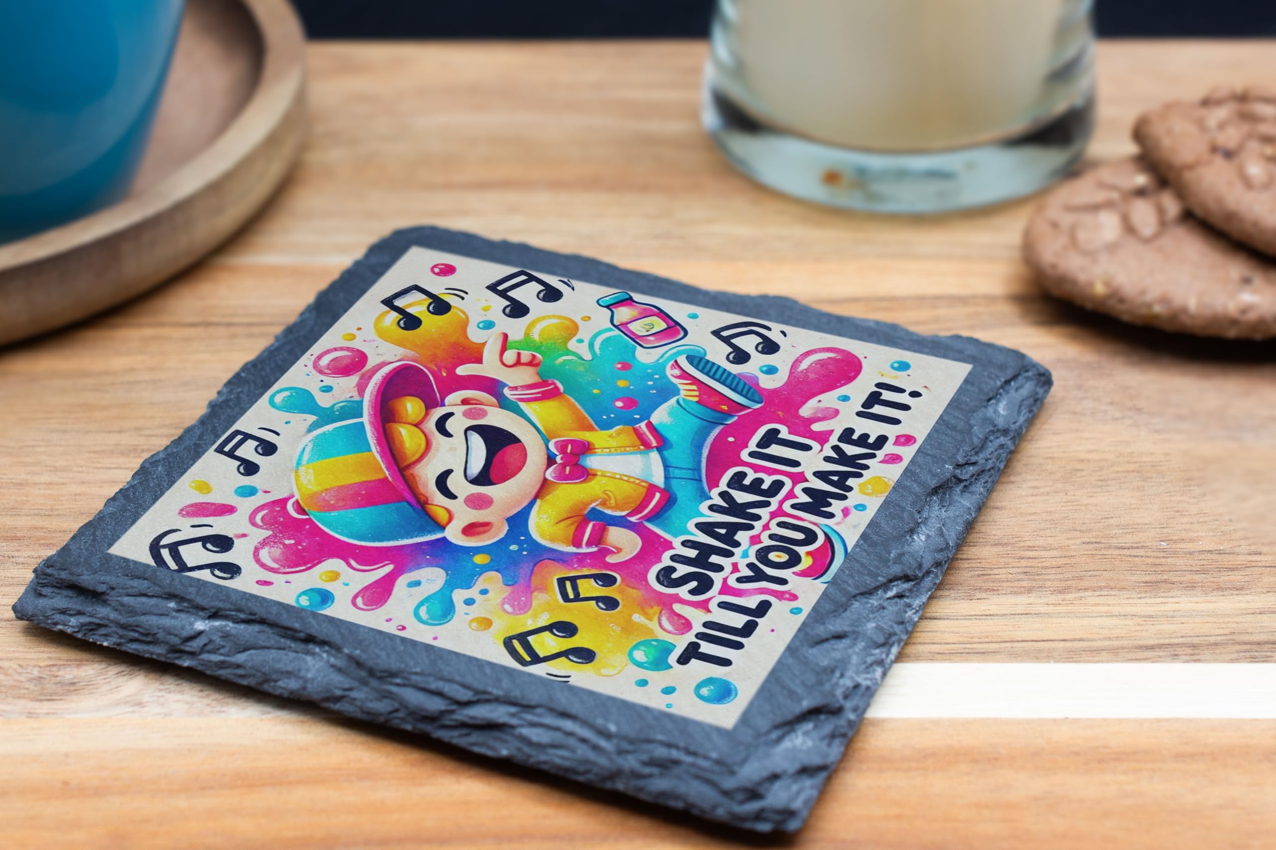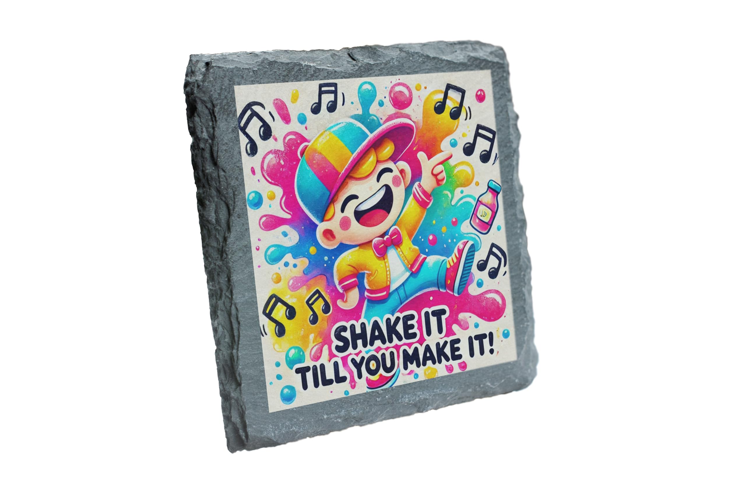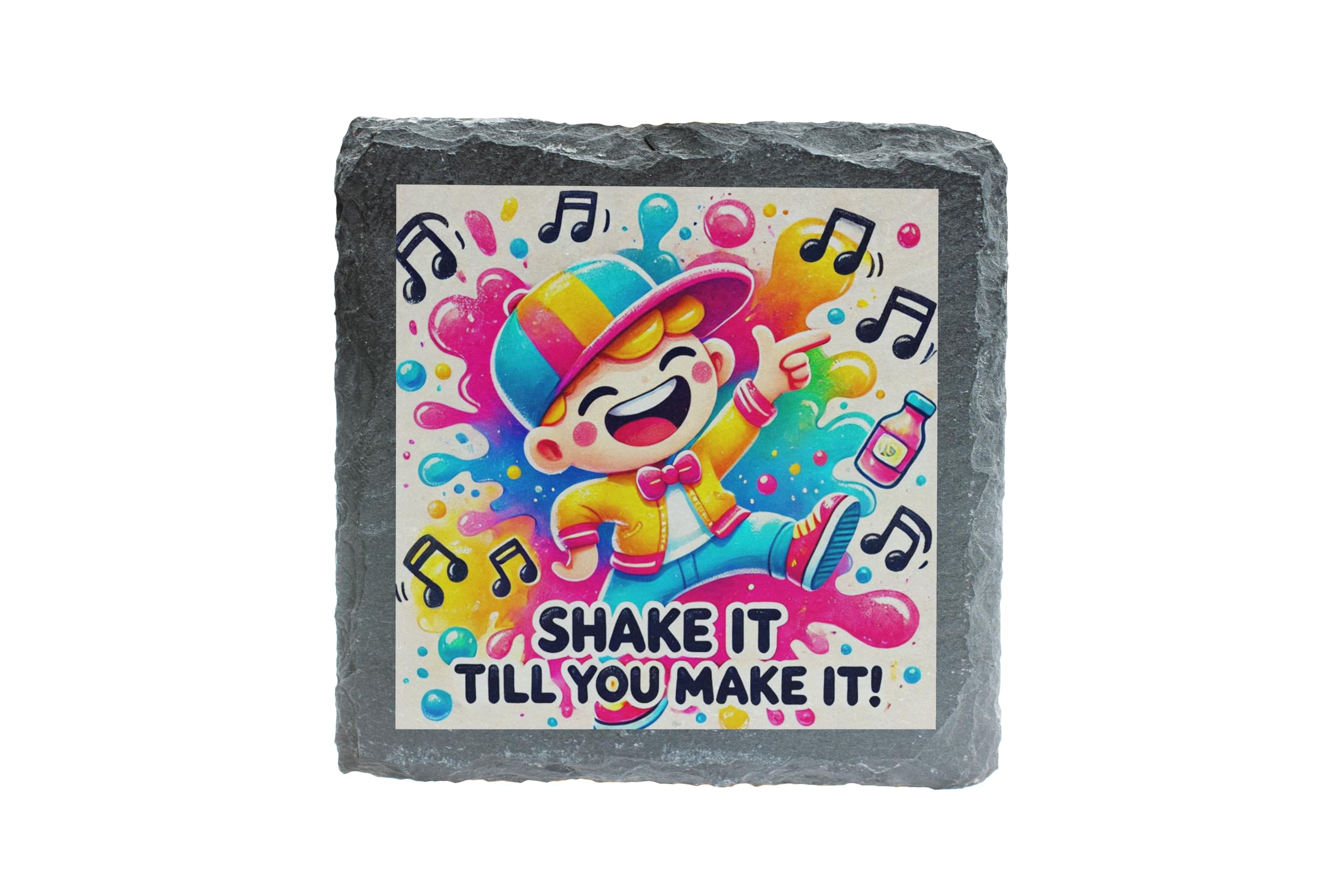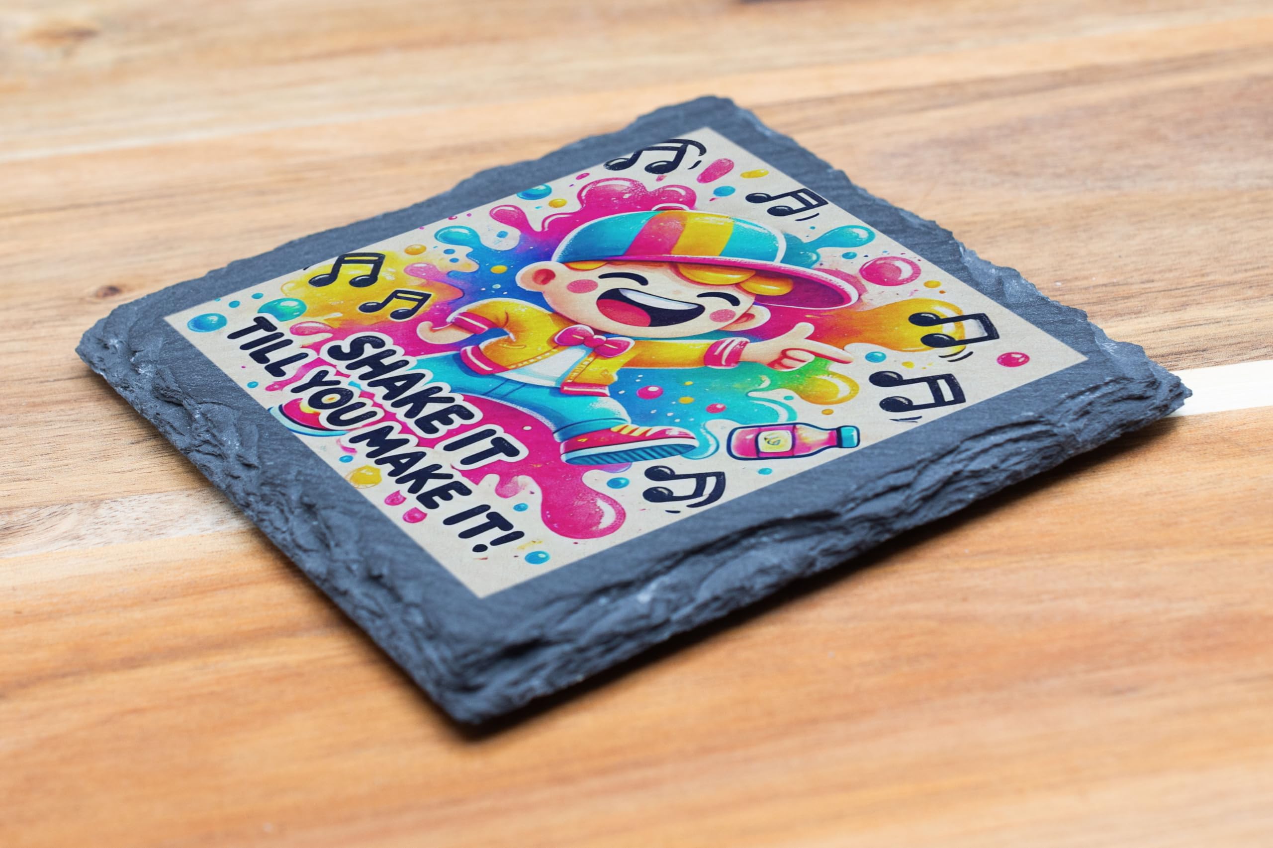 Add a touch of rhythm and energy to your home with the "Shake It Till You Make It" Fun and Colorful Slate Coaster. This coaster showcases a dynamic design featuring a playful character surrounded by vivid splashes of color and lively musical notes. Made from durable natural slate, it not only protects your surfaces from drink spills but also adds a stylish and whimsical accent to your decor. The fade-resistant print ensures the design stays as bold and beautiful as the day you got it. Whether you're hosting a dance party, enjoying your favorite drink, or simply brightening up your living space, this coaster is a fantastic choice. It also makes a thoughtful gift for music lovers, dancers, or anyone who embraces life's vibrant moments!