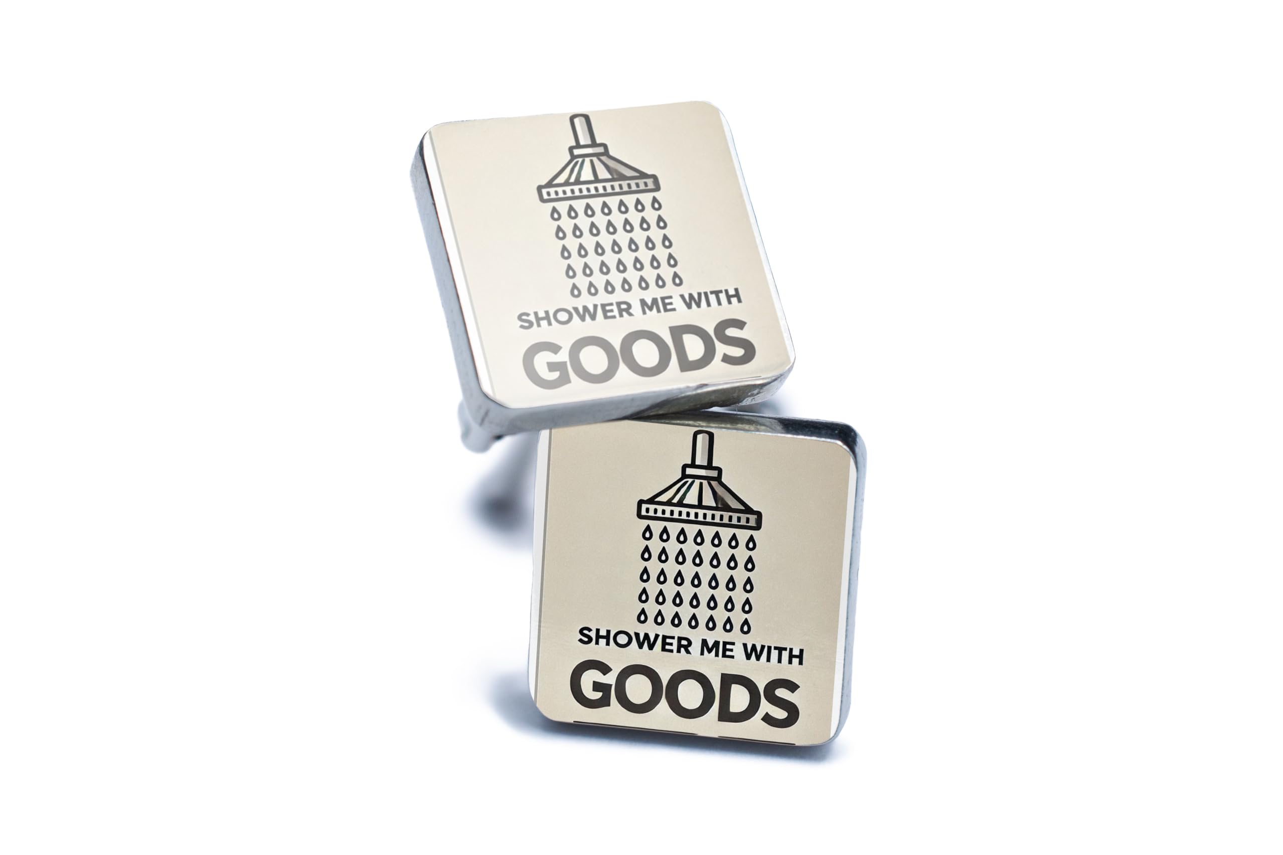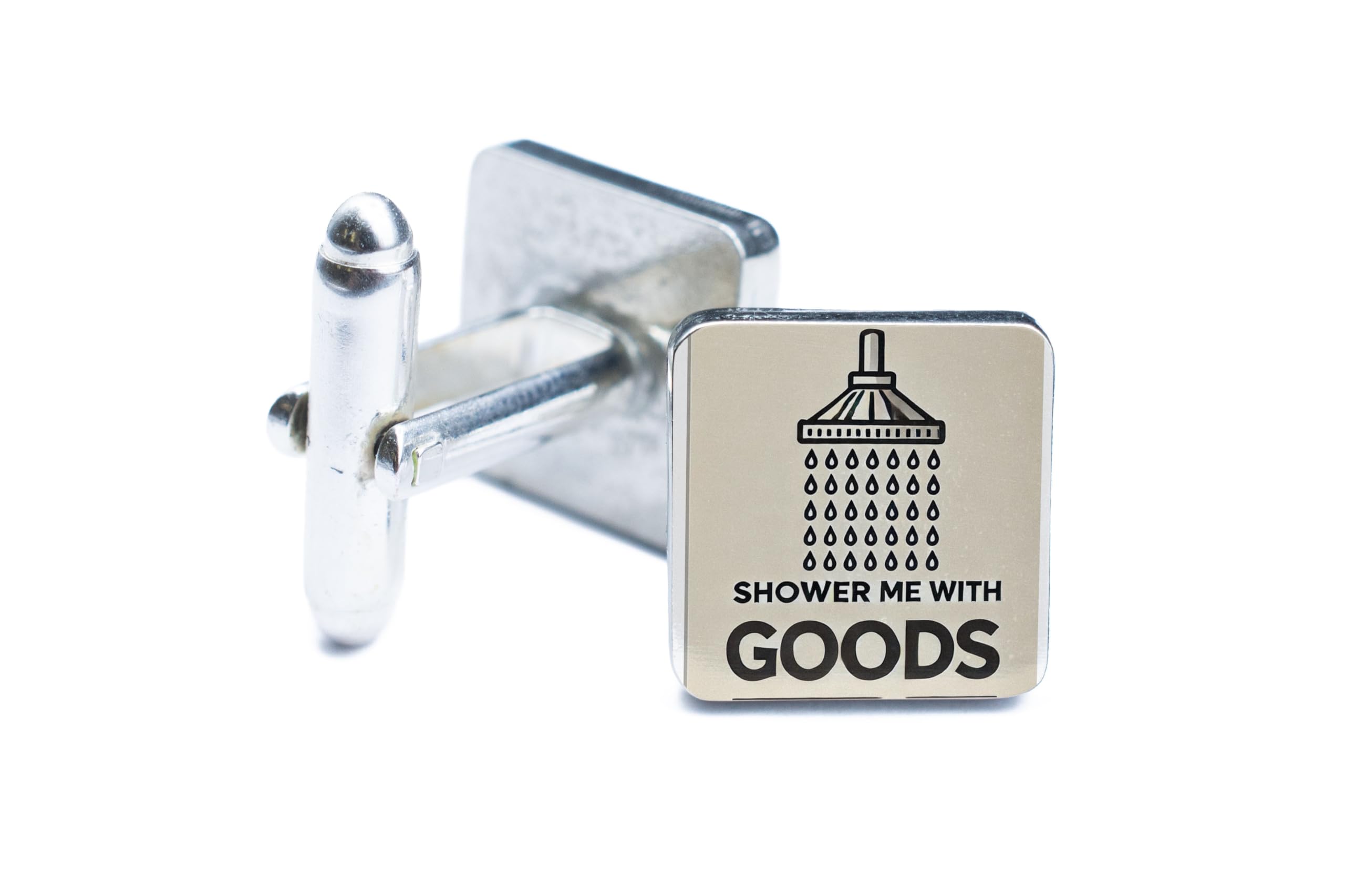 Add a touch of humor to your wardrobe with these quirky "Shower Me with Goods" cufflinks. Featuring a clever design that combines wit and style, these cufflinks are perfect for anyone who loves to stand out and make a statement. Crafted with care, these cufflinks are as durable as they are funny, making them a great addition to your formal or casual wear. Whether you're looking to treat yourself or find the perfect gift for someone with a sense of humor, these cufflinks are sure to deliver. They arrive in a sleek gift box, ready to bring joy and laughter to any occasion.