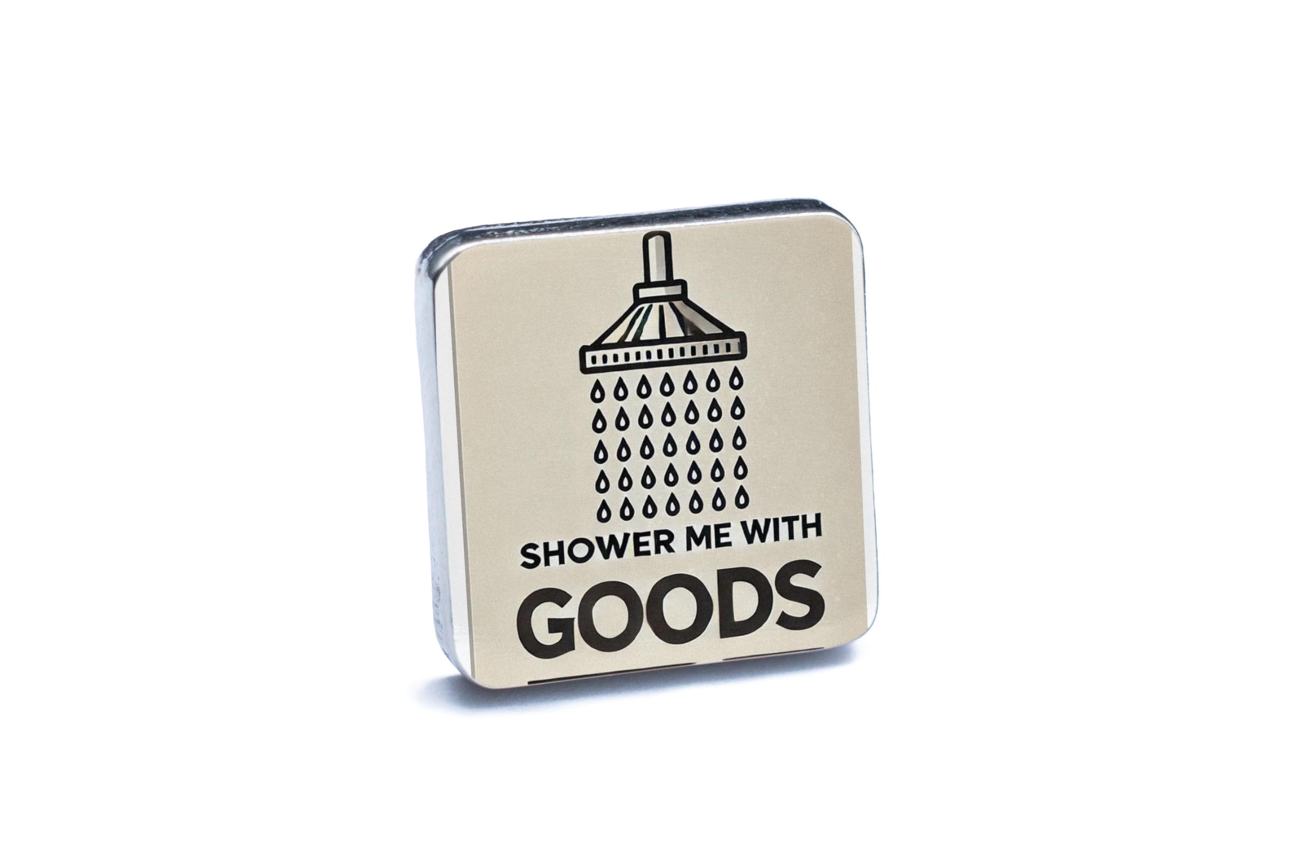 - Playful Design: Features a witty "Shower Me with Goods" message paired with a creative showerhead illustration.