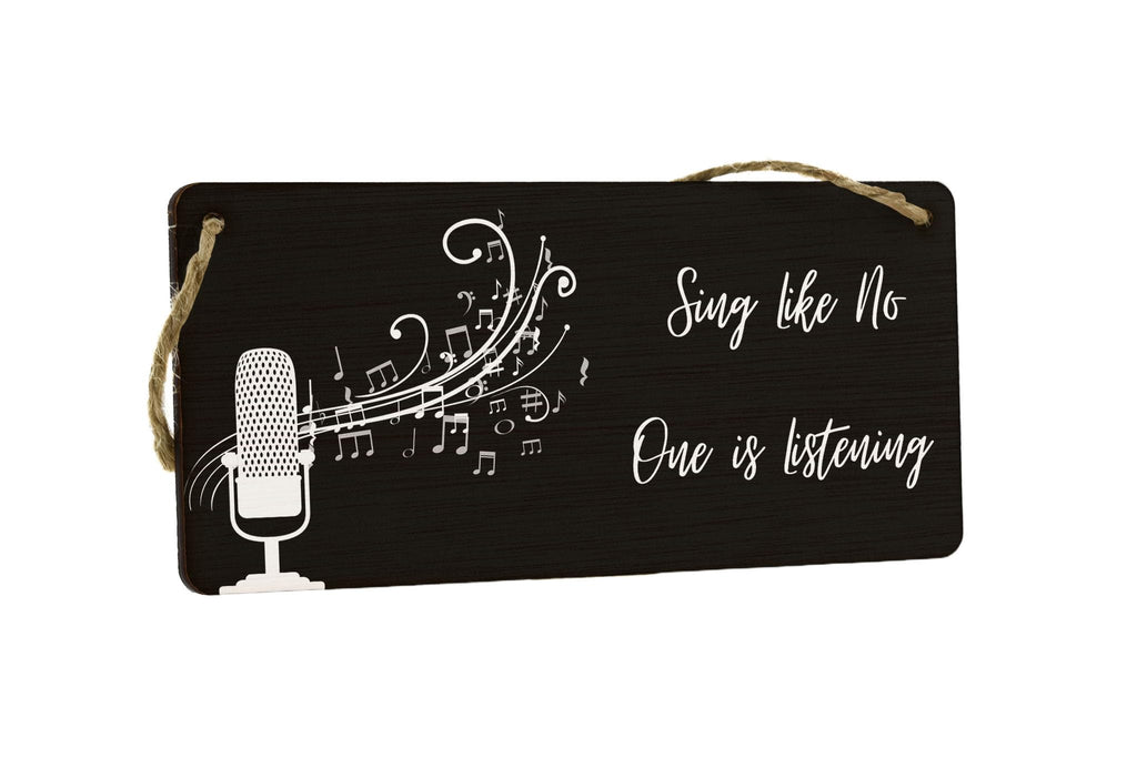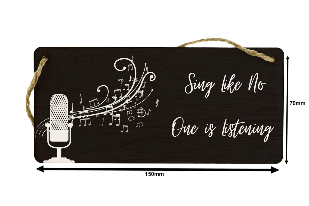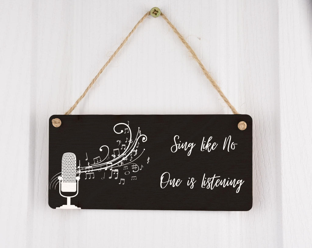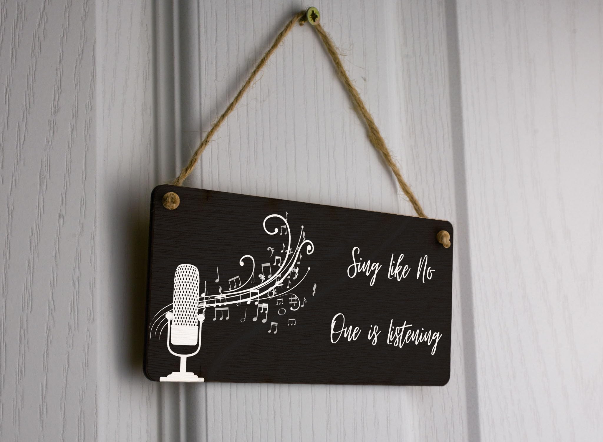 Add a touch of elegance and motivation to your home with this Plywood Motivational Hanging Sign. Made from quality plywood, this sign is not only durable but also adds a rustic charm to any space. The sign features the inspiring phrase 'Sing Like No One is Listening' in white writing, encouraging you to embrace your inner artist and let your voice soar. The black background is adorned with white music notes swirling, symbolizing the beauty and power of music. To further enhance the design, an image of a microphone is elegantly incorporated, representing the passion and joy of singing. Whether you hang it in your living room, bedroom, or any room in your home, this full colour sign is sure to bring a positive and motivational atmosphere. It also makes a wonderful gift for your loved ones, including your husband, wife, boyfriend, girlfriend, son, daughter, or siblings.