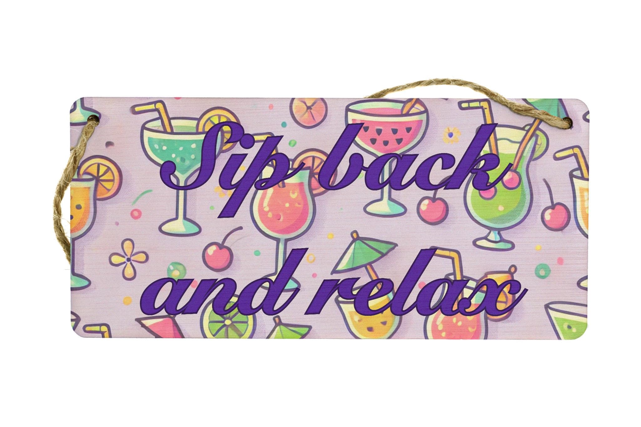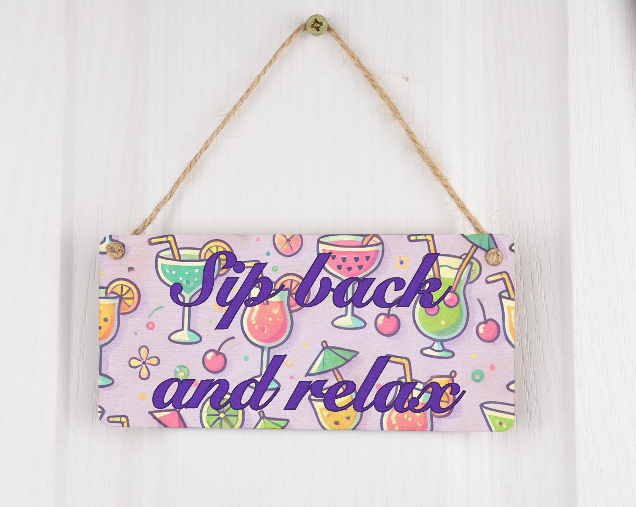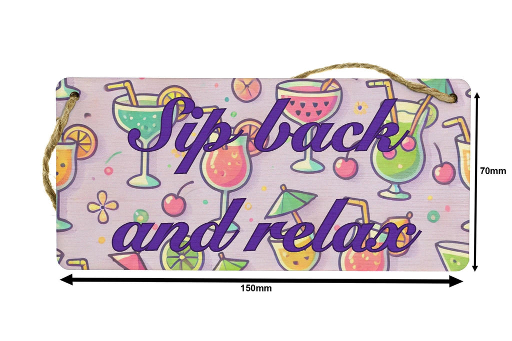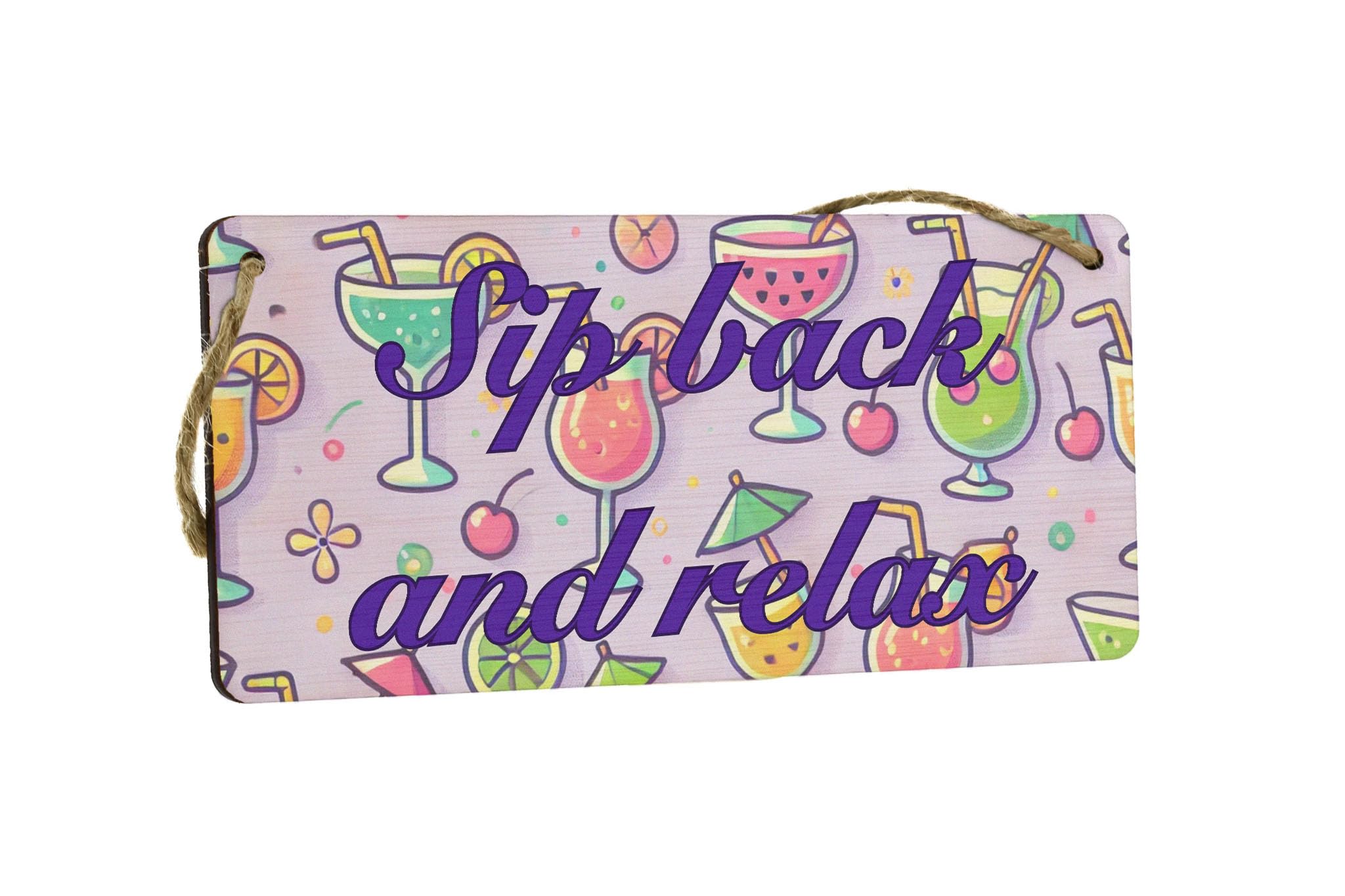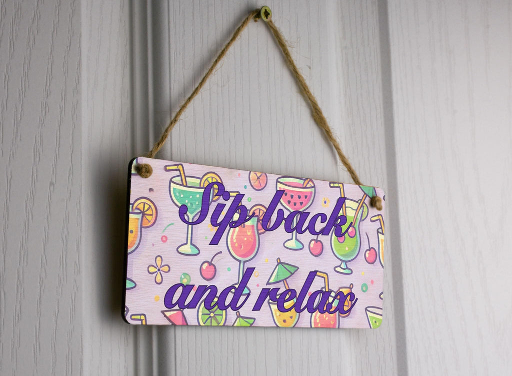 Add a touch of tropical paradise to your home or bar with our Sip Back and Relax Cocktail Themed Hanging Sign. This fun and colourful sign features a pastel purple background with a full colour design showing a playful pattern of cheerful cocktails. The lighthearted quote 'Sip Back and Relax' is displayed in whimsical typography, creating a relaxed and festive atmosphere. Perfect for summer vibes or any time you want to chill and unwind, this UV printed sign is handcrafted from laser cut plywood for a quality finish. The twine included makes it easy to hang as a party decoration or as a cheerful addition to your bar decor. Let the vibrant colours and playful design of this hanging sign bring a touch of fun to any space.