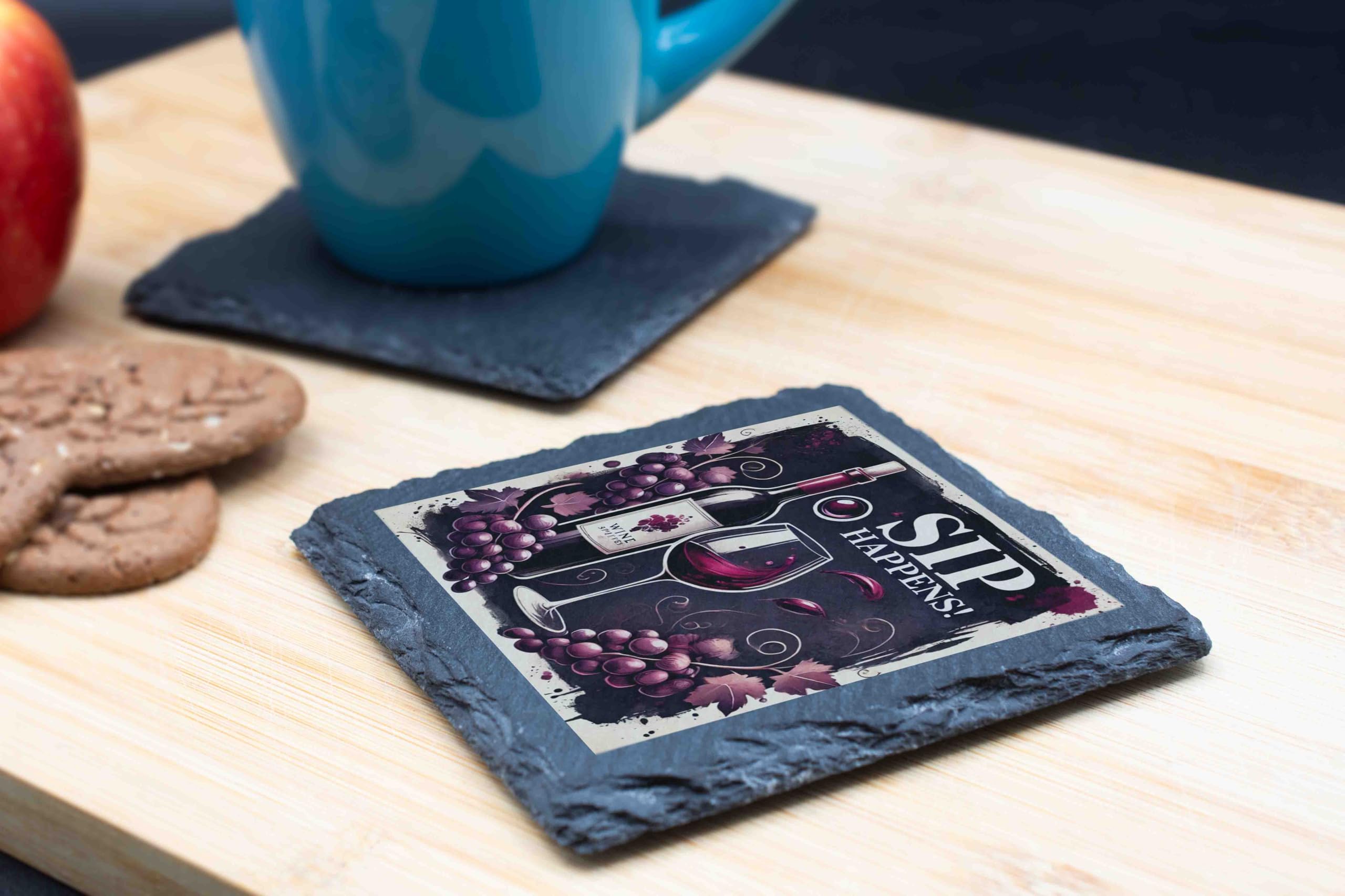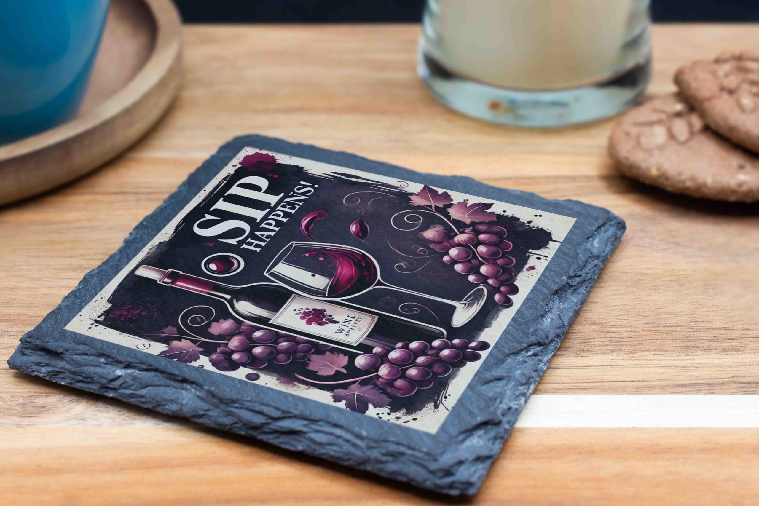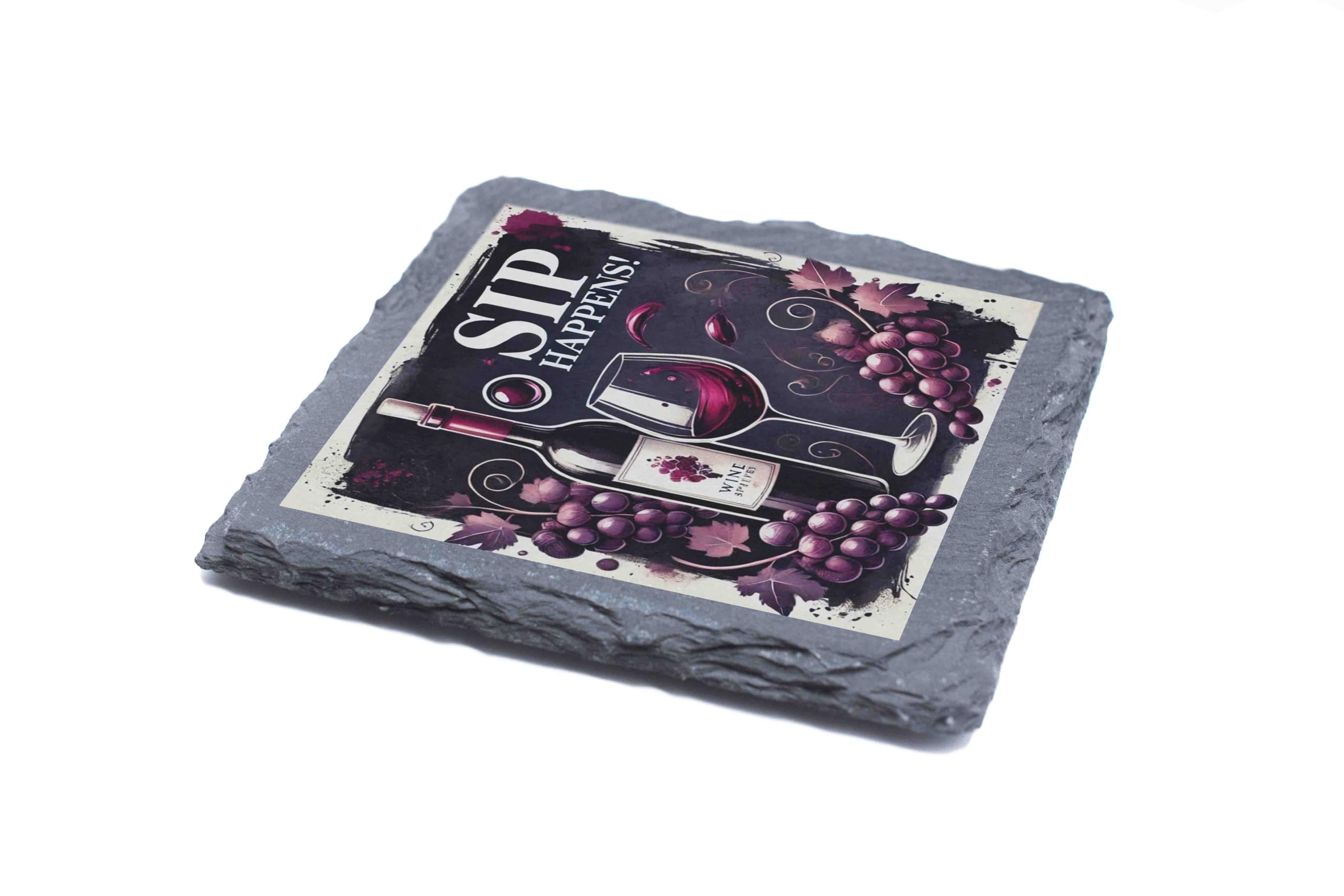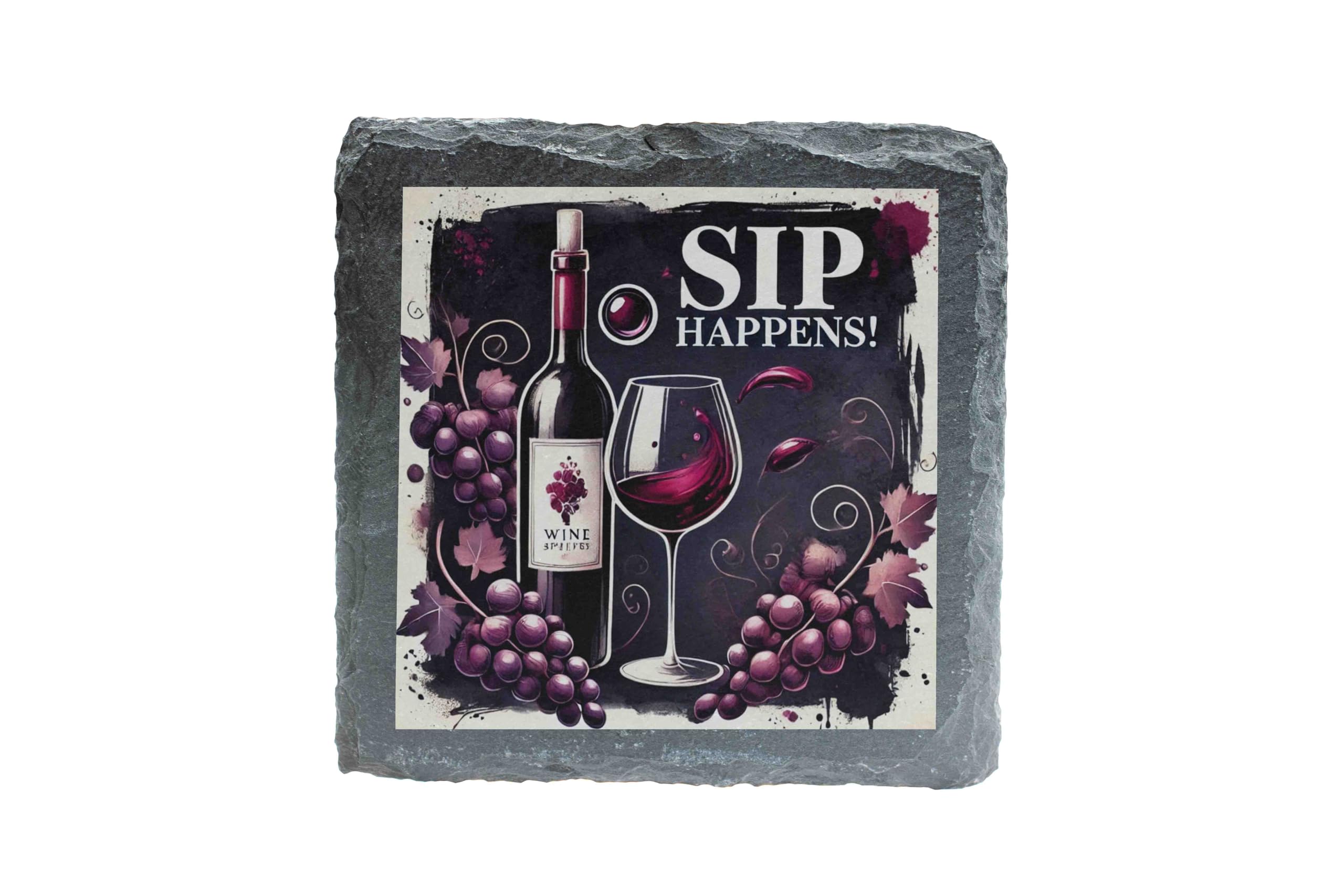 Celebrate life?s spills and thrills with the "Sip Happens!" slate coaster. This witty and stylish accessory is perfect for wine enthusiasts who appreciate a touch of humor. The coaster?s vibrant design, featuring wine bottles, glasses, and plump grapes, adds a splash of personality to any setting. Made from durable, natural slate, it?s not only a decorative piece but also a functional one, protecting your furniture from water damage and scratches. Whether you?re entertaining guests or enjoying a quiet glass of wine, this coaster brings charm and laughter to the table. An ideal gift for birthdays, housewarmings, or any occasion that calls for wine and smiles!