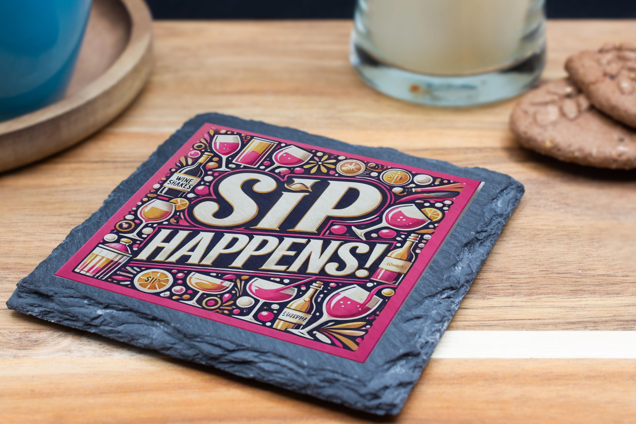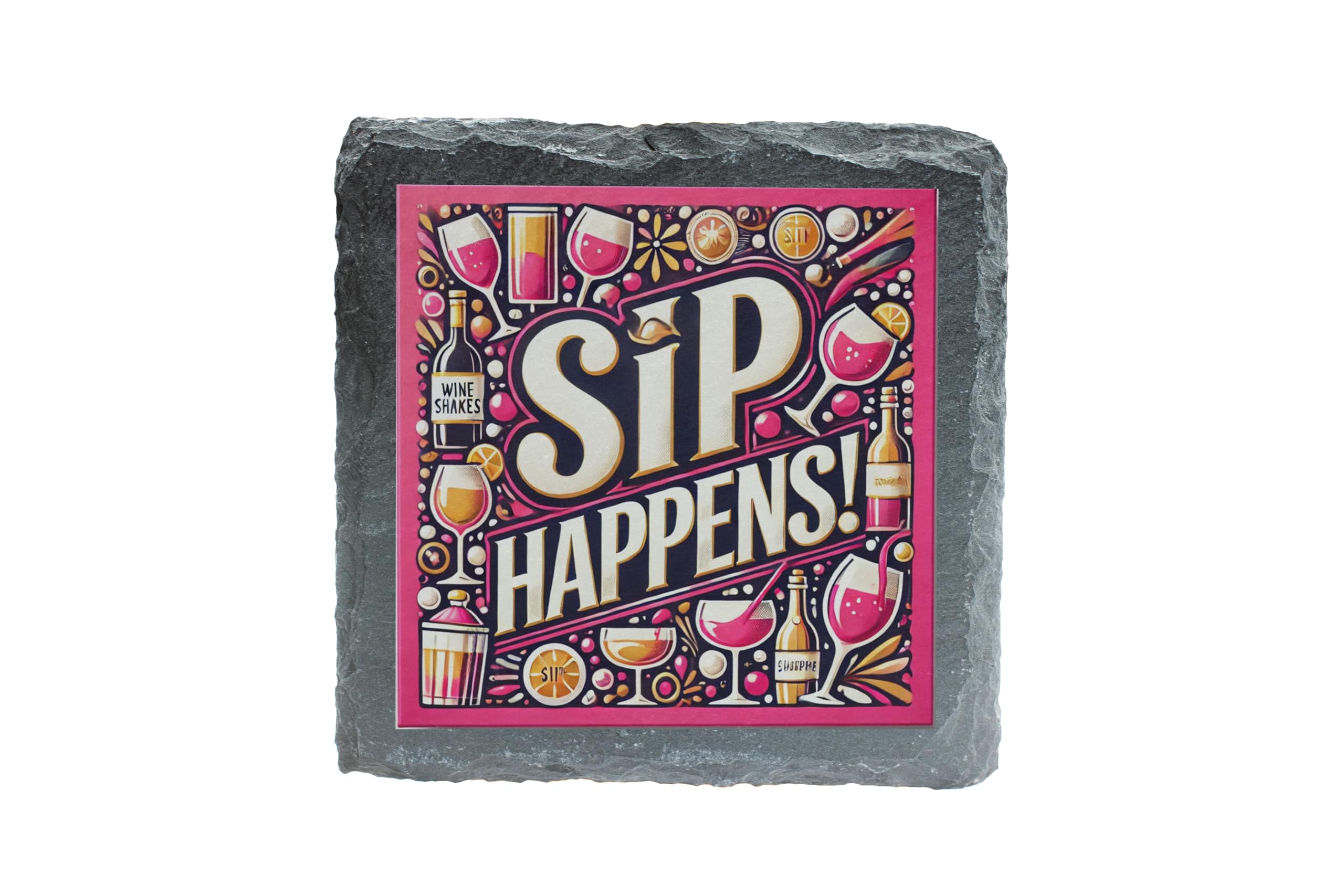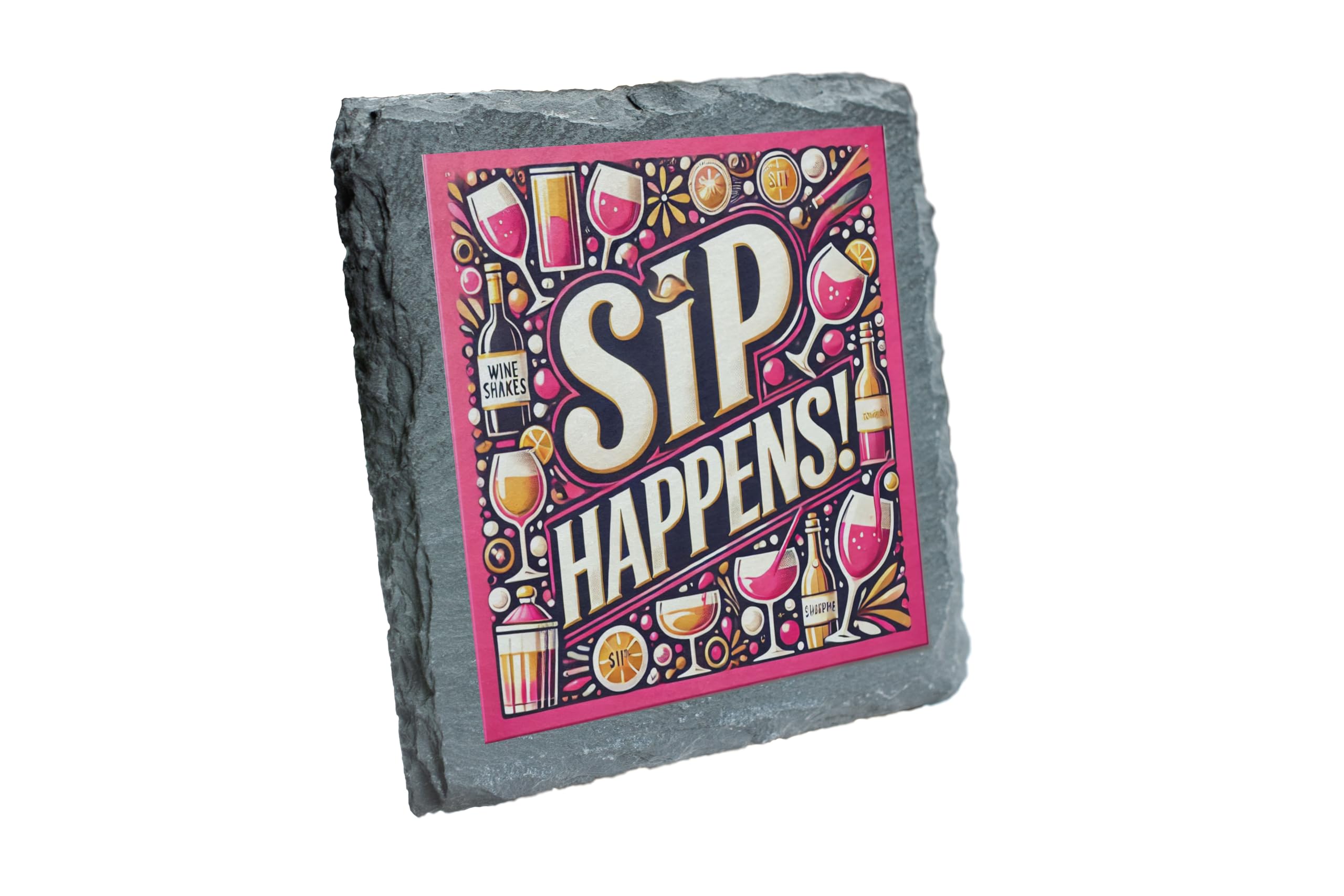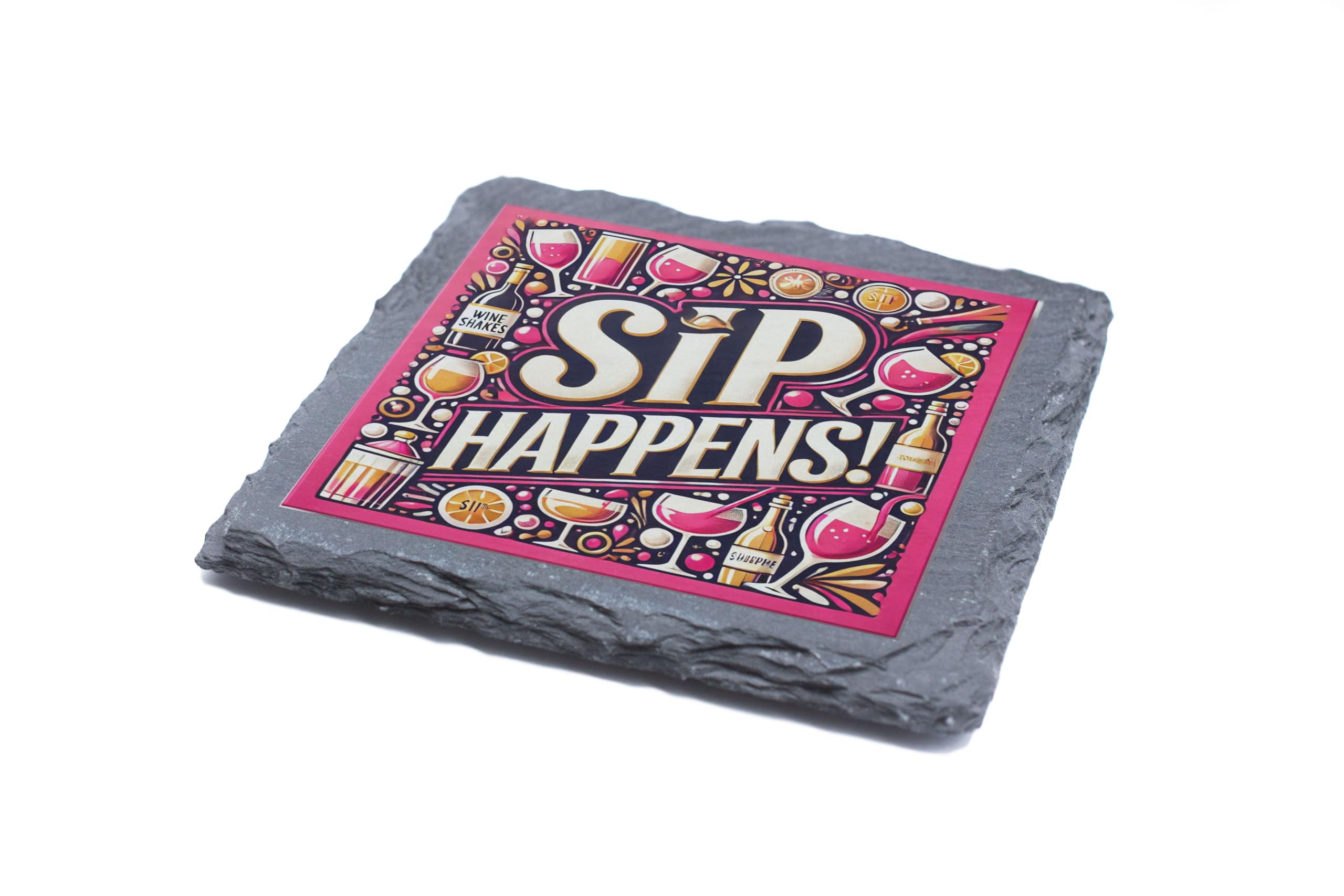 'Sip Happens!' Slate Coaster | Fun and Quirky Wine-Themed Table Accessory (slco-ds24-siphaprg)