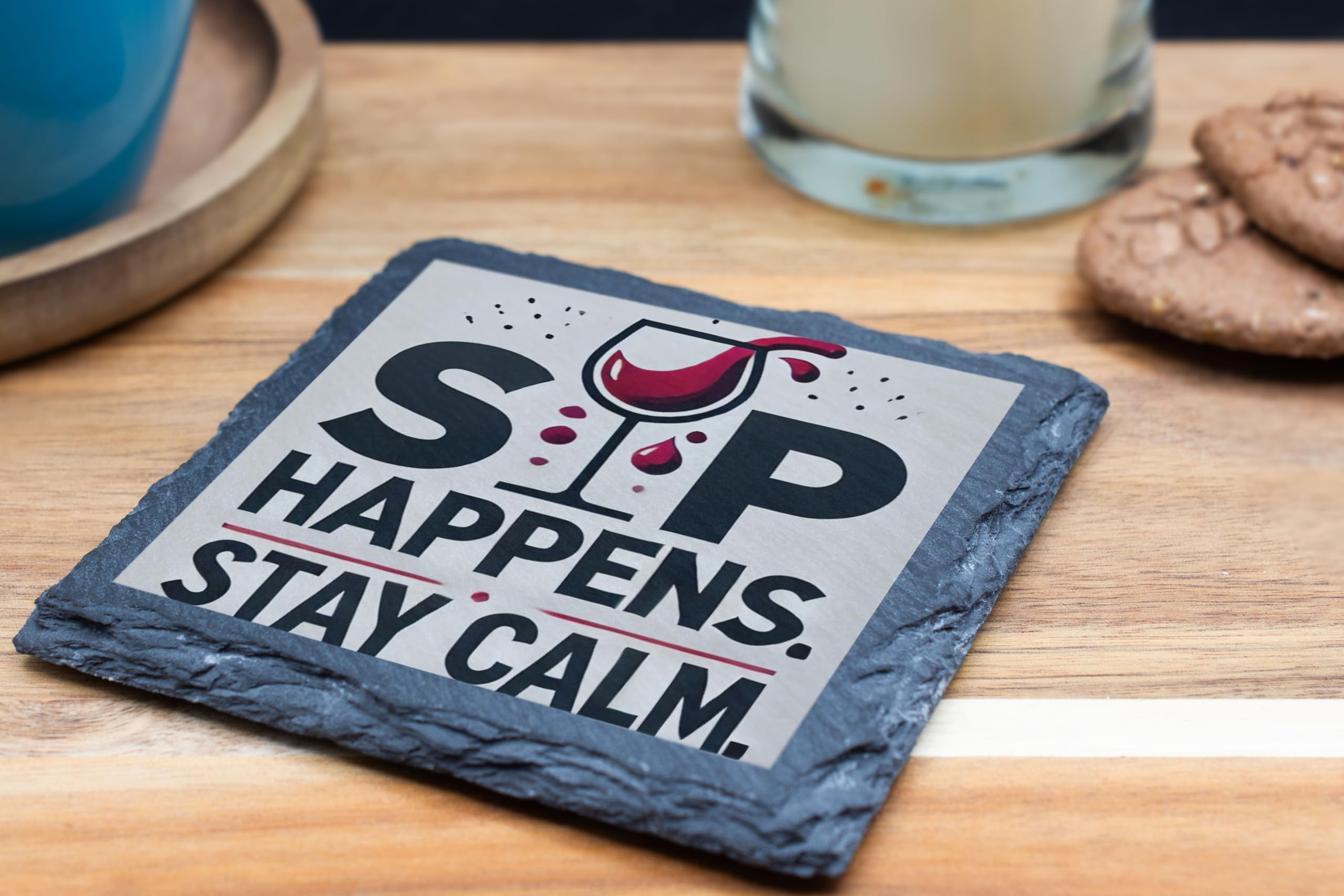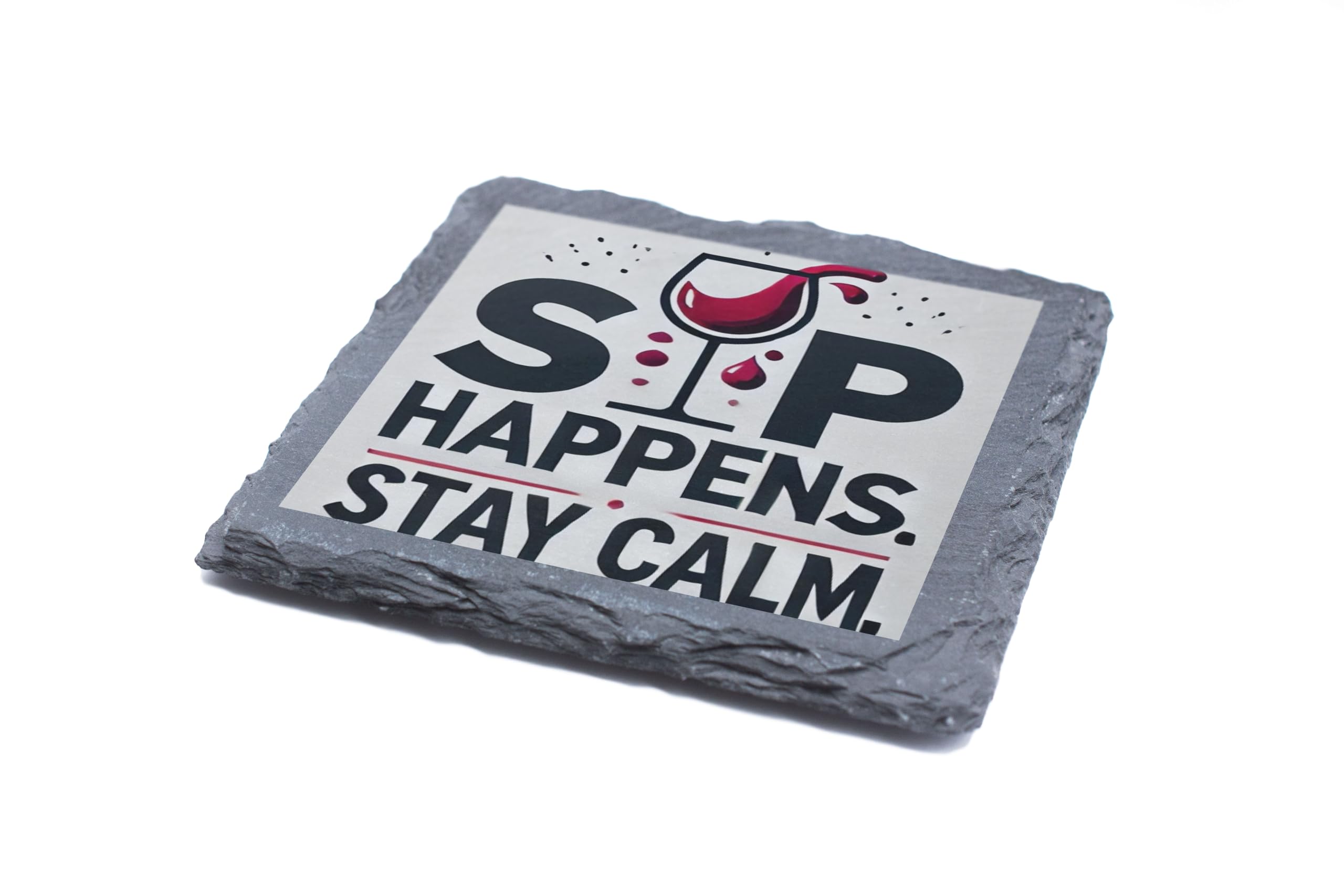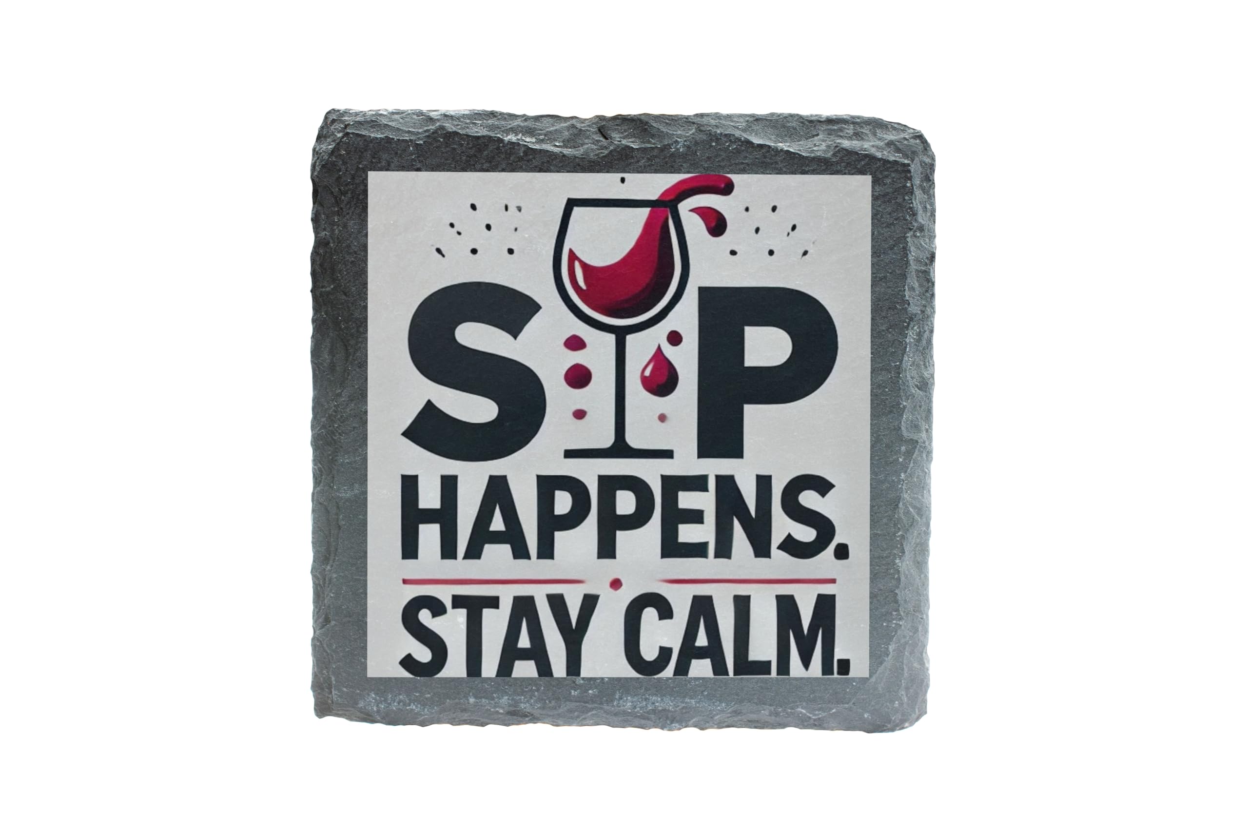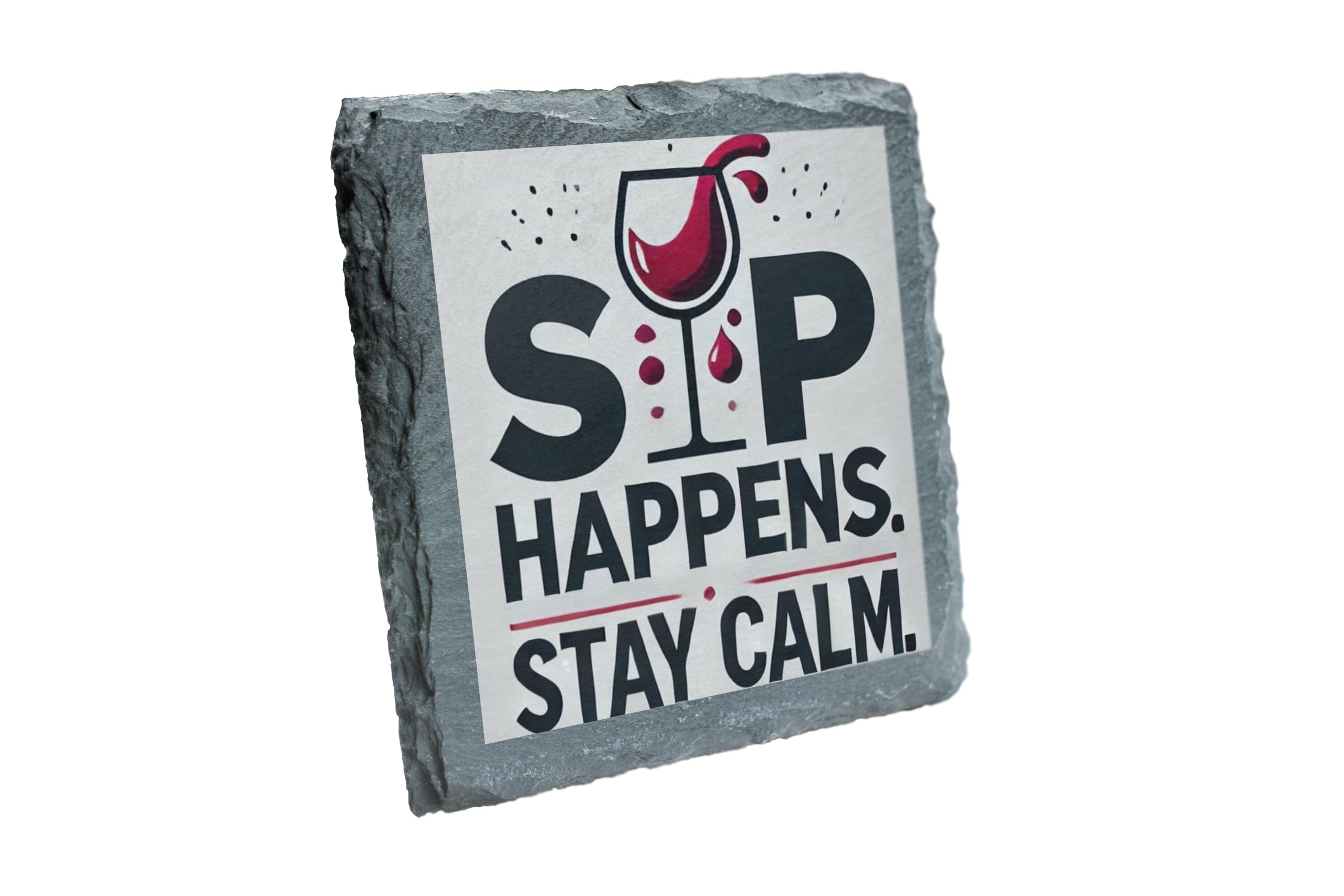Make every sip a stylish statement with the "Sip Happens, Stay Calm" Slate Coaster. This humorous design featuring a spilled wine glass adds a touch of fun and character to any setting. Perfect for protecting your surfaces from water rings and heat, this coaster is as functional as it is decorative. Crafted from high-quality natural slate, the coaster's rustic texture and durability make it a great addition to any home. Whether you're hosting a wine night or simply relaxing, this witty coaster is sure to spark conversations and smiles. Ideal as a gift for wine enthusiasts, party hosts, or anyone who loves a good pun, this coaster is a thoughtful and unique choice for birthdays, holidays, or housewarmings.