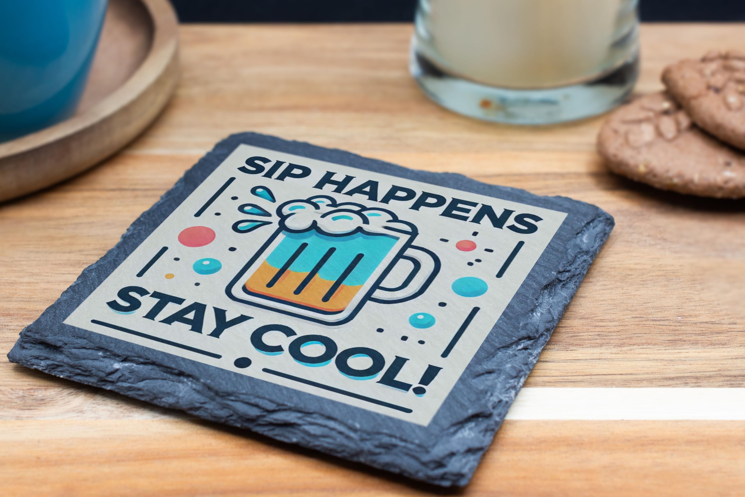 Keep your drinks cool and your vibes cooler with this "Sip Happens, Stay Cool!" slate coaster. Designed for beer lovers who enjoy a good laugh and a cold brew, this coaster combines a fun, eye-catching graphic with practicality. The vibrant beer mug design and quirky slogan make it a standout piece for any gathering or home bar setup. Made from premium-quality natural slate, this coaster not only protects your surfaces from spills and condensation but also adds a touch of charm to your space. Its rustic edges and sturdy construction make it both functional and decorative. Whether you're hosting a party, relaxing with a cold one, or looking for a unique gift for a beer enthusiast, this coaster is the perfect pick. Stay cool, sip on, and let the good times roll!