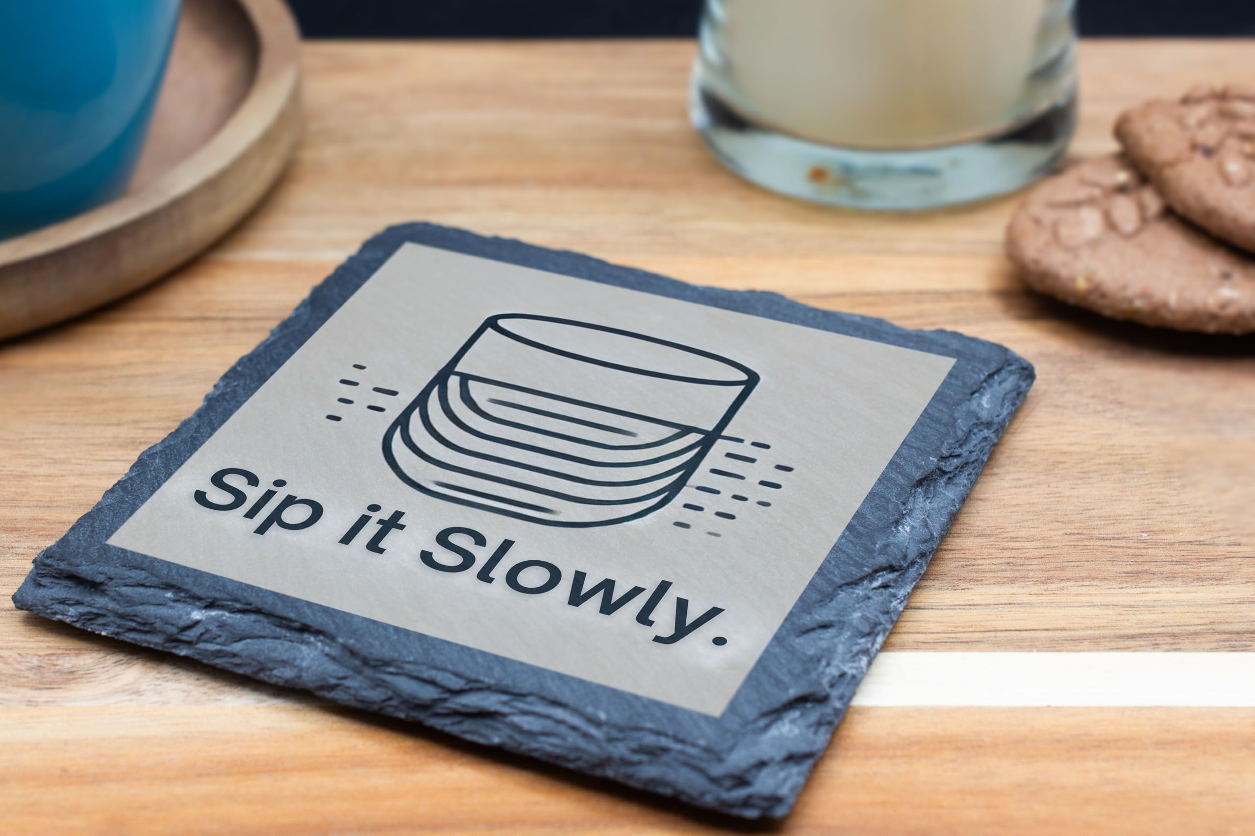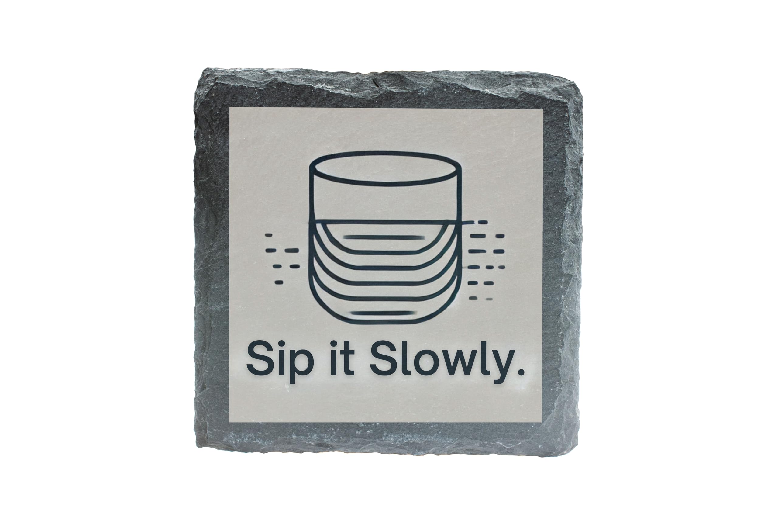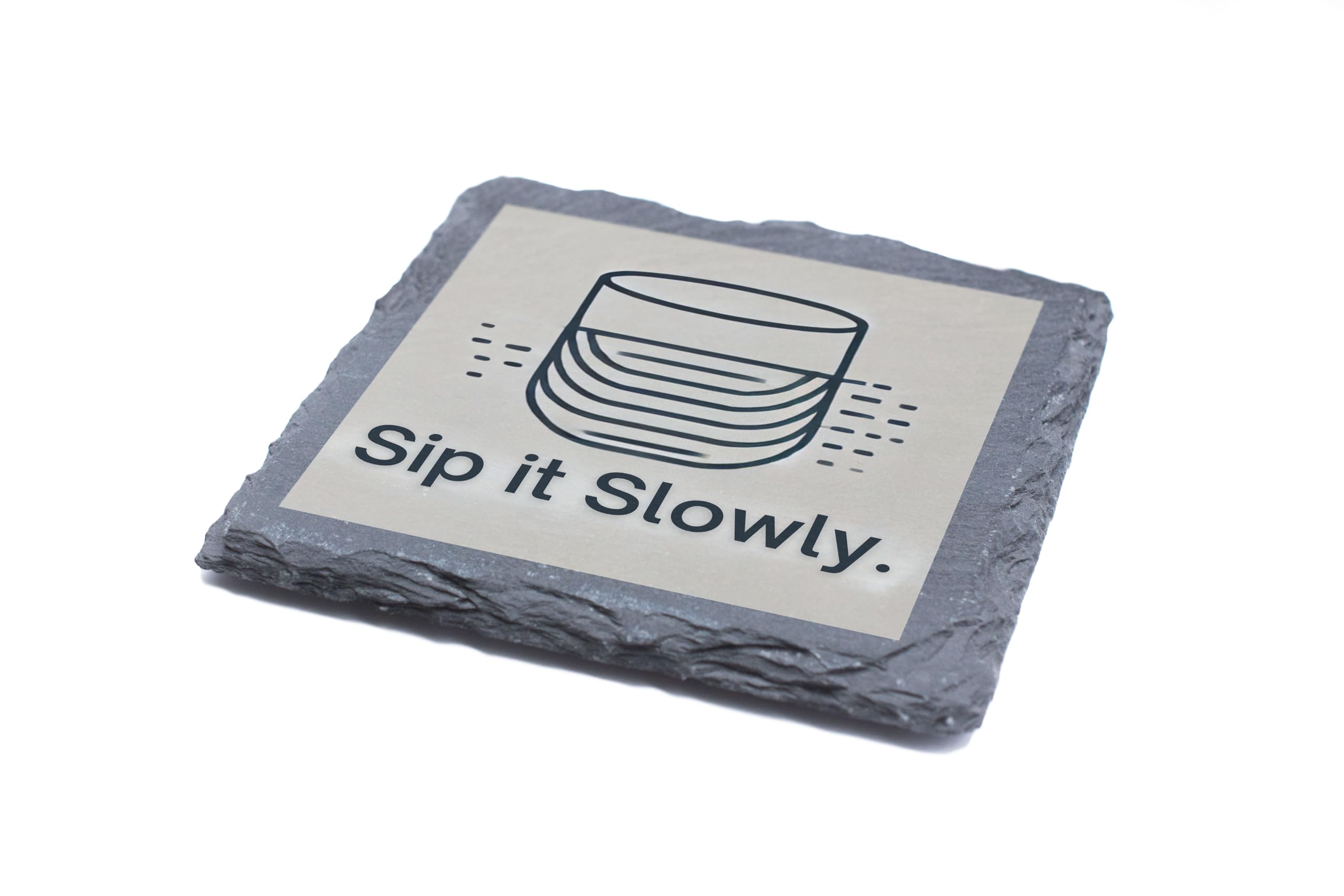 Elevate your drink experience with the "Sip It Slowly" slate coaster, a must-have for those who appreciate both style and mindfulness. Designed with simplicity in mind, this coaster showcases a sleek drink graphic and encourages a slow, savoring approach to your favorite beverages. Crafted from premium slate, this coaster combines durability with a modern aesthetic, protecting your surfaces from spills and condensation. Whether for your home bar, coffee table, or as a unique gift, this coaster is a practical and stylish choice for any occasion. Take your time, enjoy your drink, and let this coaster remind you to "Sip It Slowly."