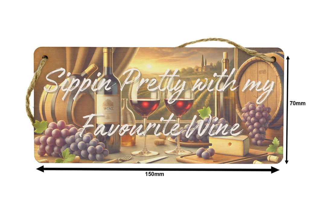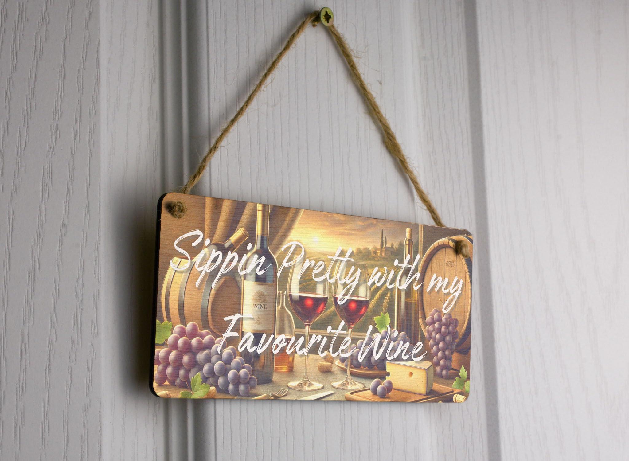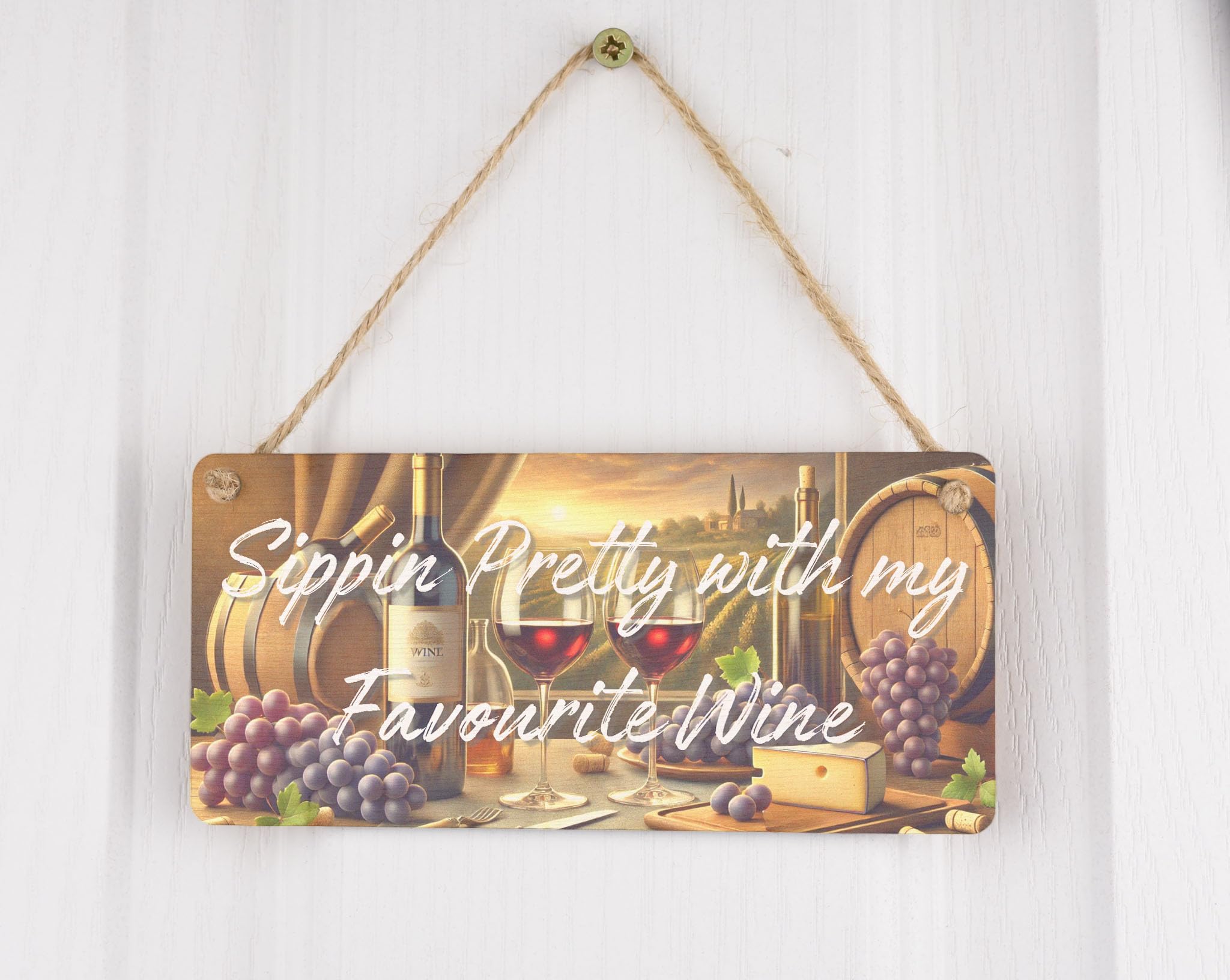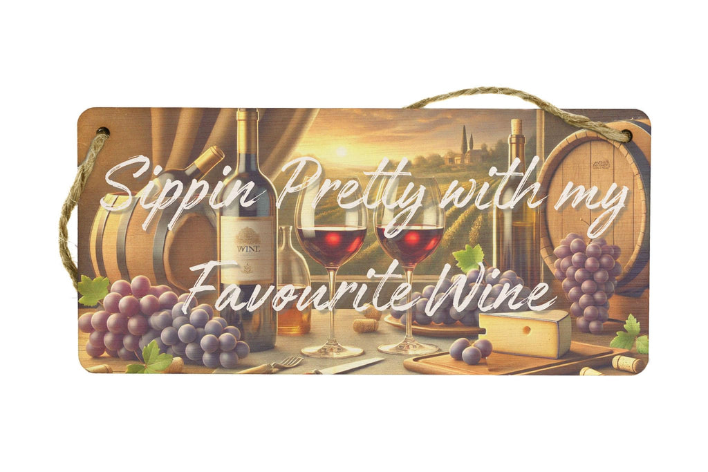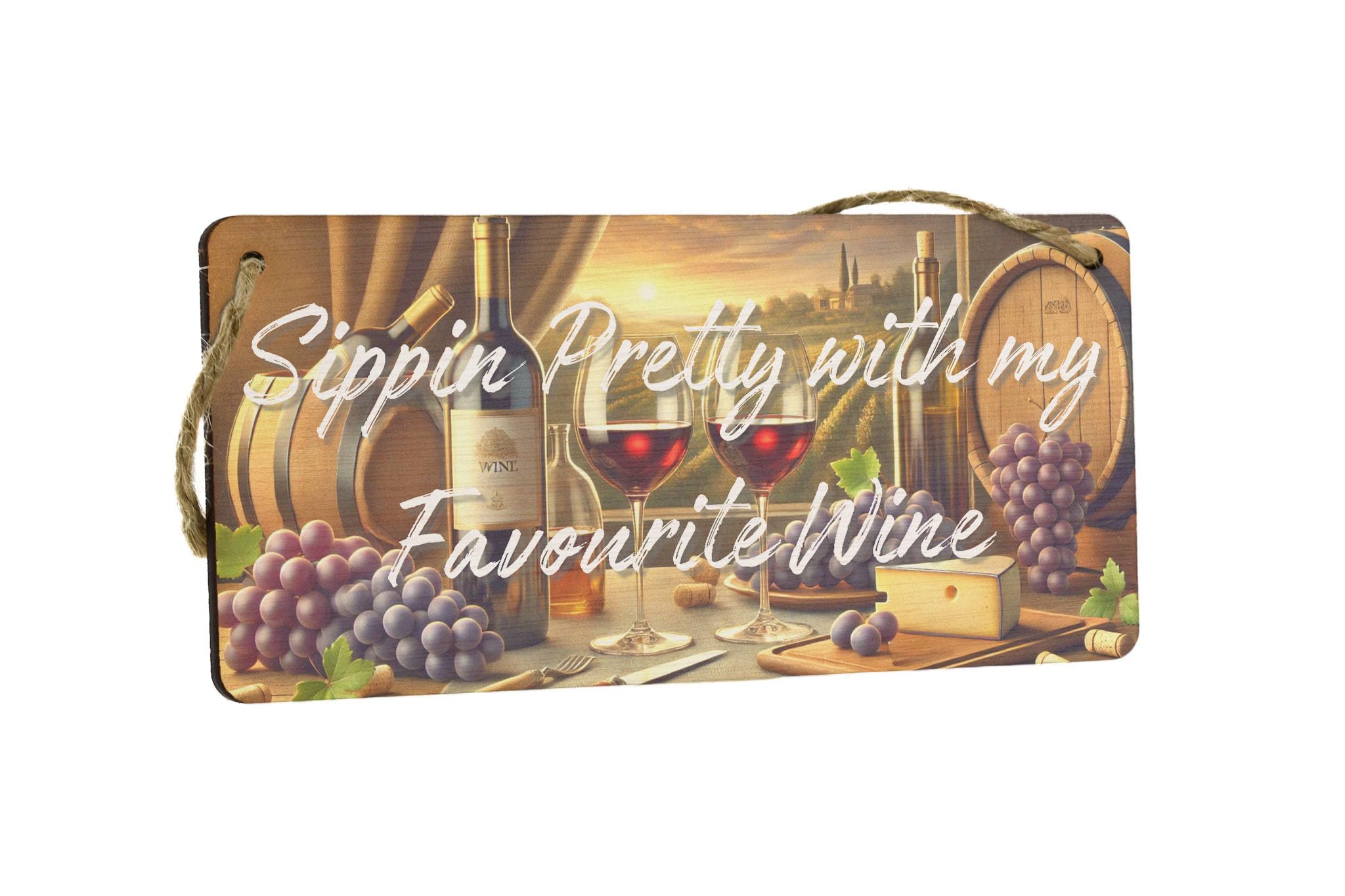 Create a cosy and romantic atmosphere in your home or bar with this charming hanging sign. Made from handcrafted laser cut plywood, this sign features a full colour design showing a romantic wine date scene, perfect for wine lovers and enthusiasts. The sign reads 'Sippin' Pretty with My Favourite Wine' in elegant script, adding a touch of sophistication to any space. The AI generated art is UV printed for durability, ensuring the design won't fade over time. Twine is included for easy hanging, making it a breeze to update your decor and create a peaceful and relaxing ambience. Whether you're enjoying a glass of wine in the comfort of your own home or looking to add a rustic touch to your bar decor, this hanging sign is the perfect addition to any wine-themed setting.