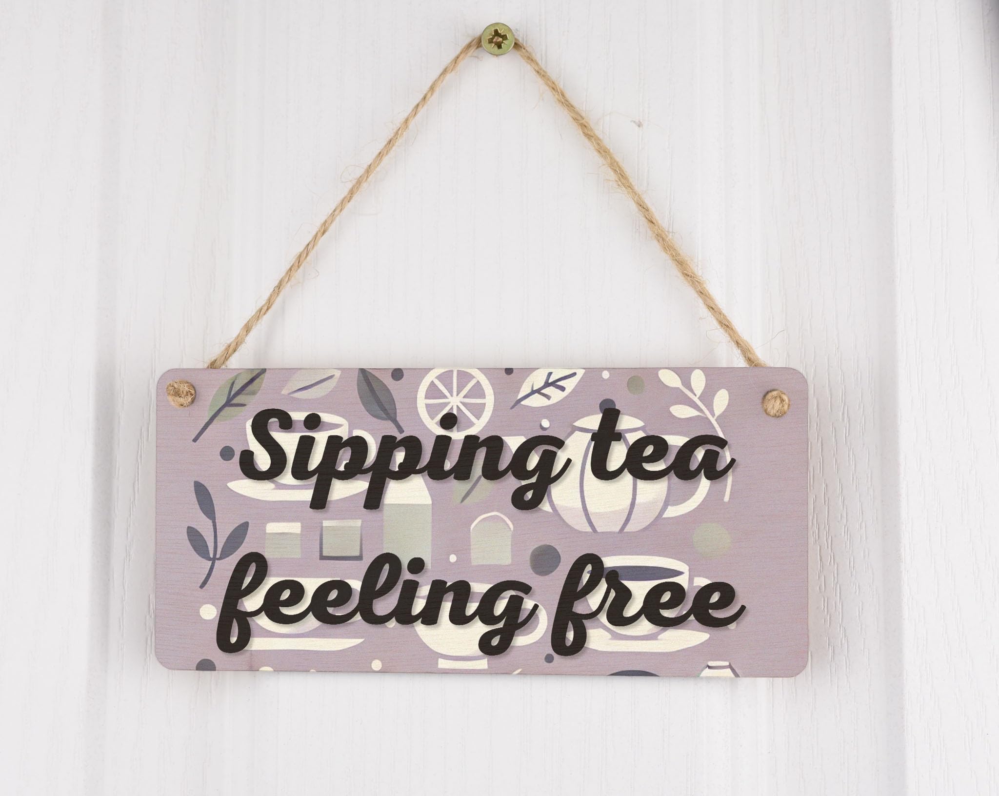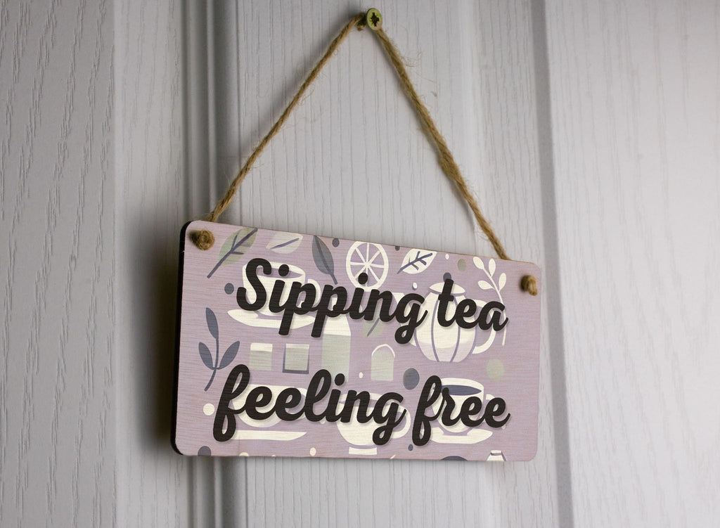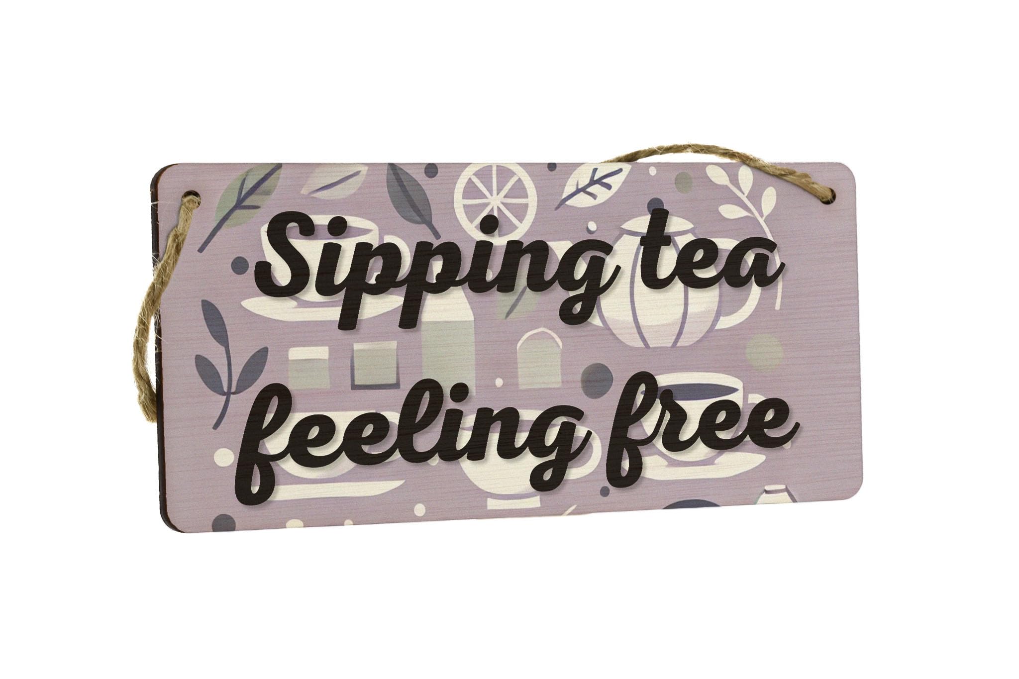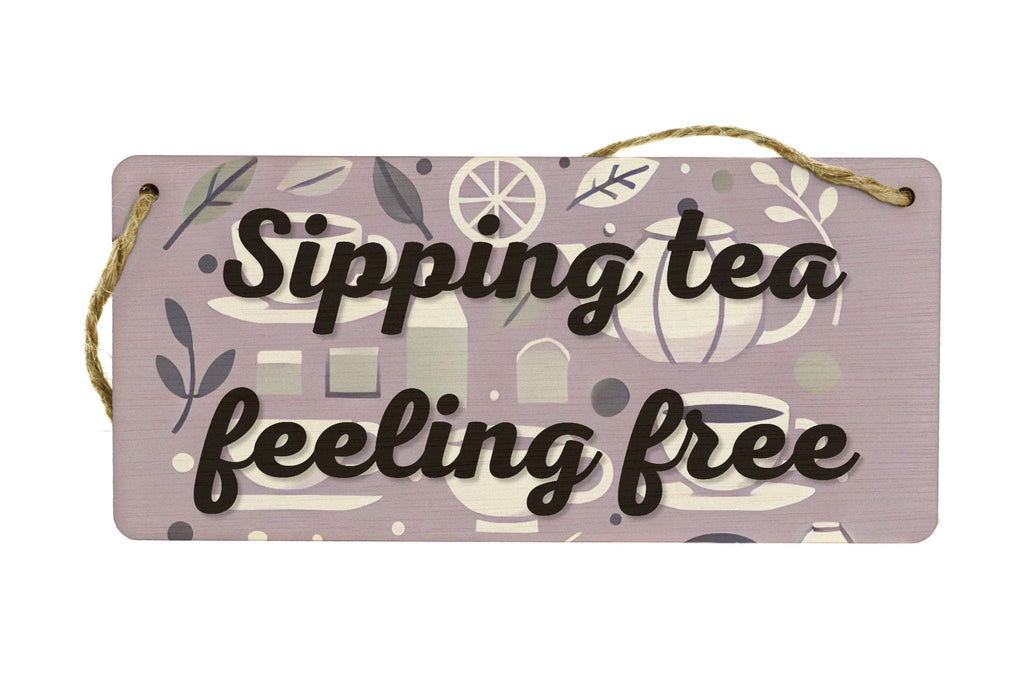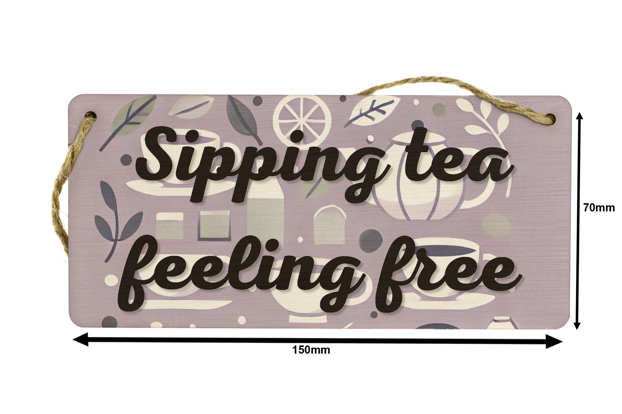 Add a touch of whimsical charm to your home with our 'Sipping Tea Feeling Free' hanging sign. This tea-themed decor piece features a modern design with a minimalist style, making it the perfect addition to any kitchen or living space. The soft pastel colours and elegant design create a calming atmosphere, while the playful typography adds a touch of humour to your decor. The purple background, with a full-colour design showing modern teapots and teacups pattern, adds a pop of colour to your walls. Crafted from quality plywood and UV printed with an AI-generated art, this hanging sign is durable and long-lasting. The twine included makes it easy to hang on your wall, adding a unique and stylish touch to your home. Whether you're a tea lover or simply enjoy a cosy atmosphere, this 'Sipping Tea Feeling Free' hanging sign is sure to bring a sense of relaxation and tranquillity to your space.