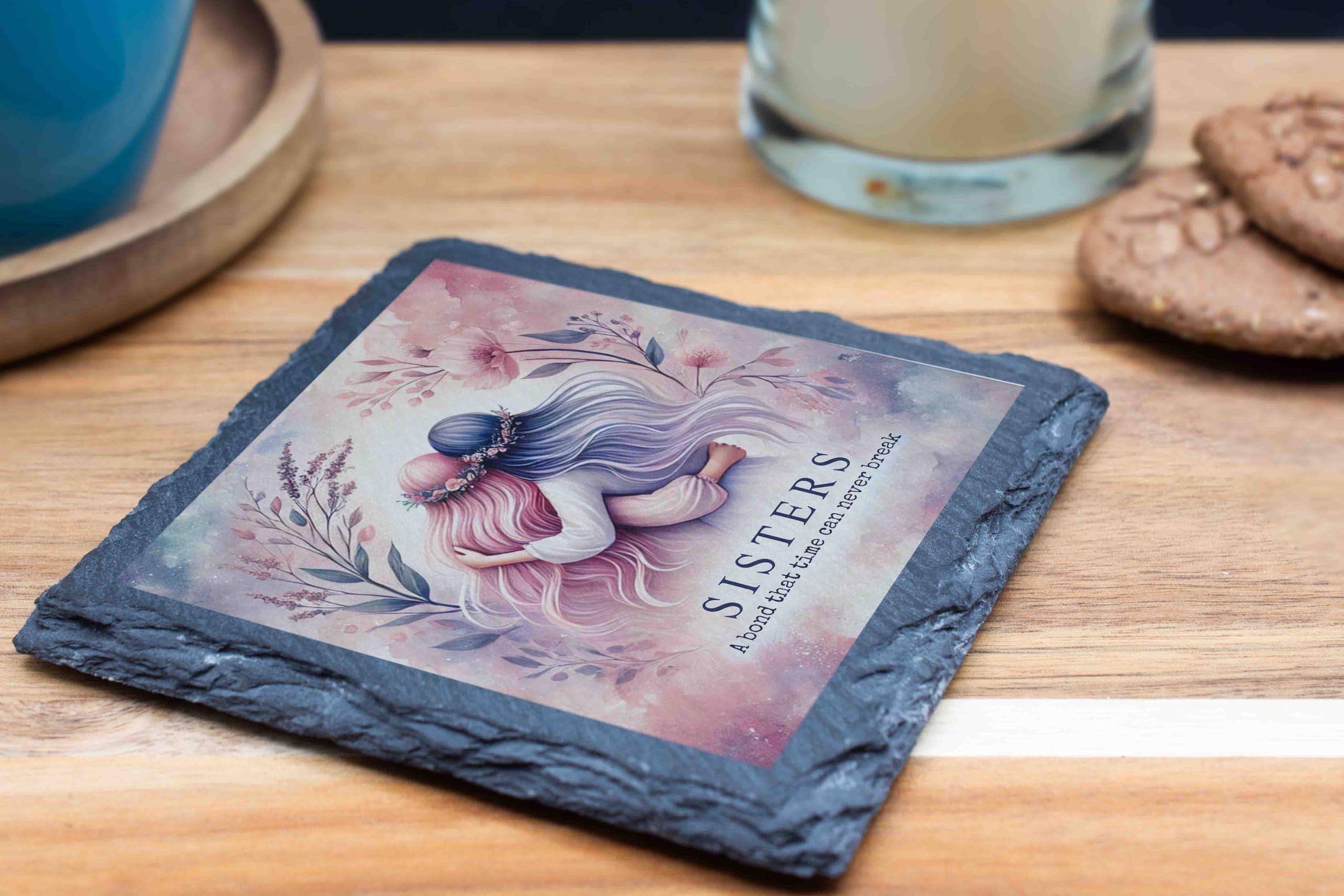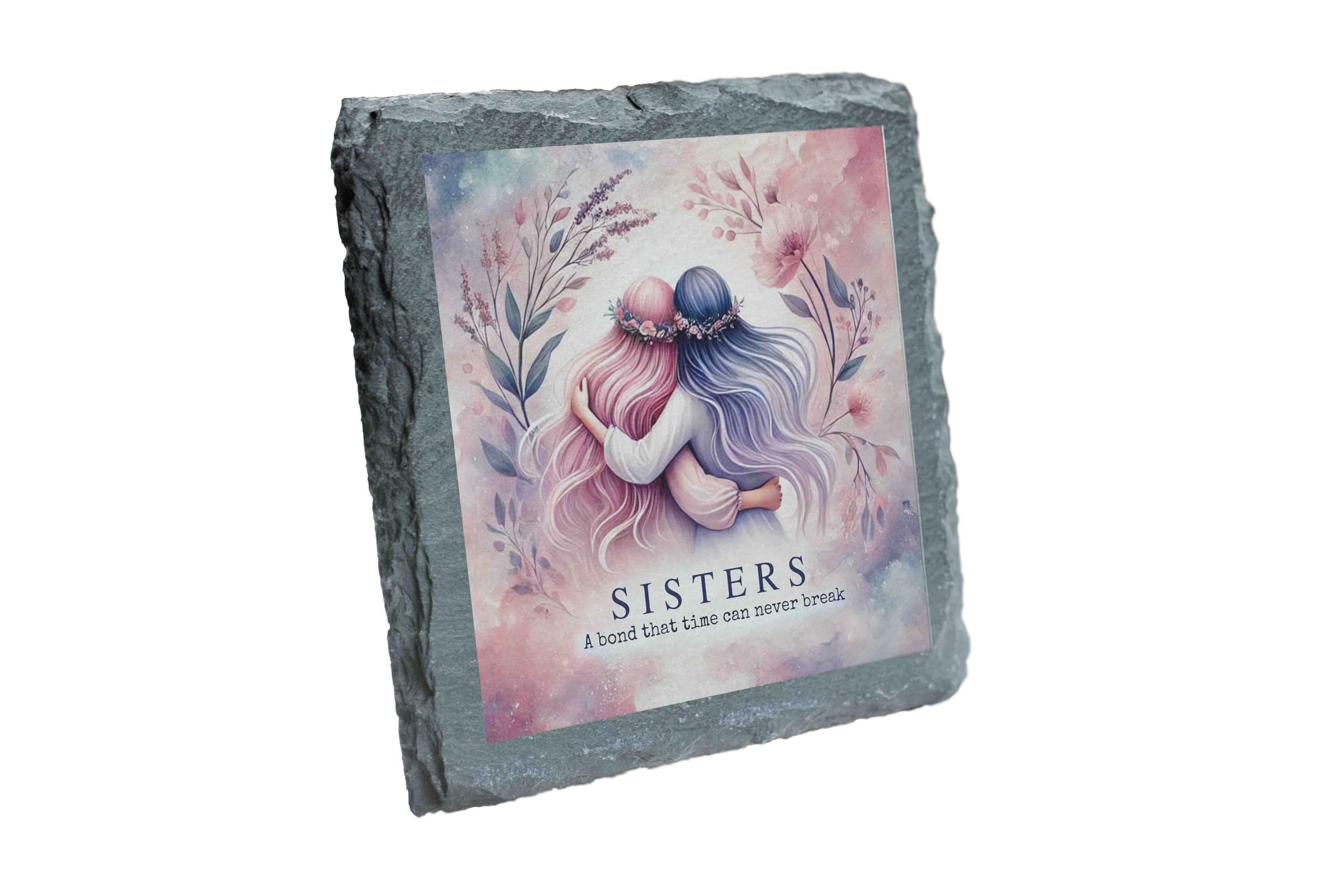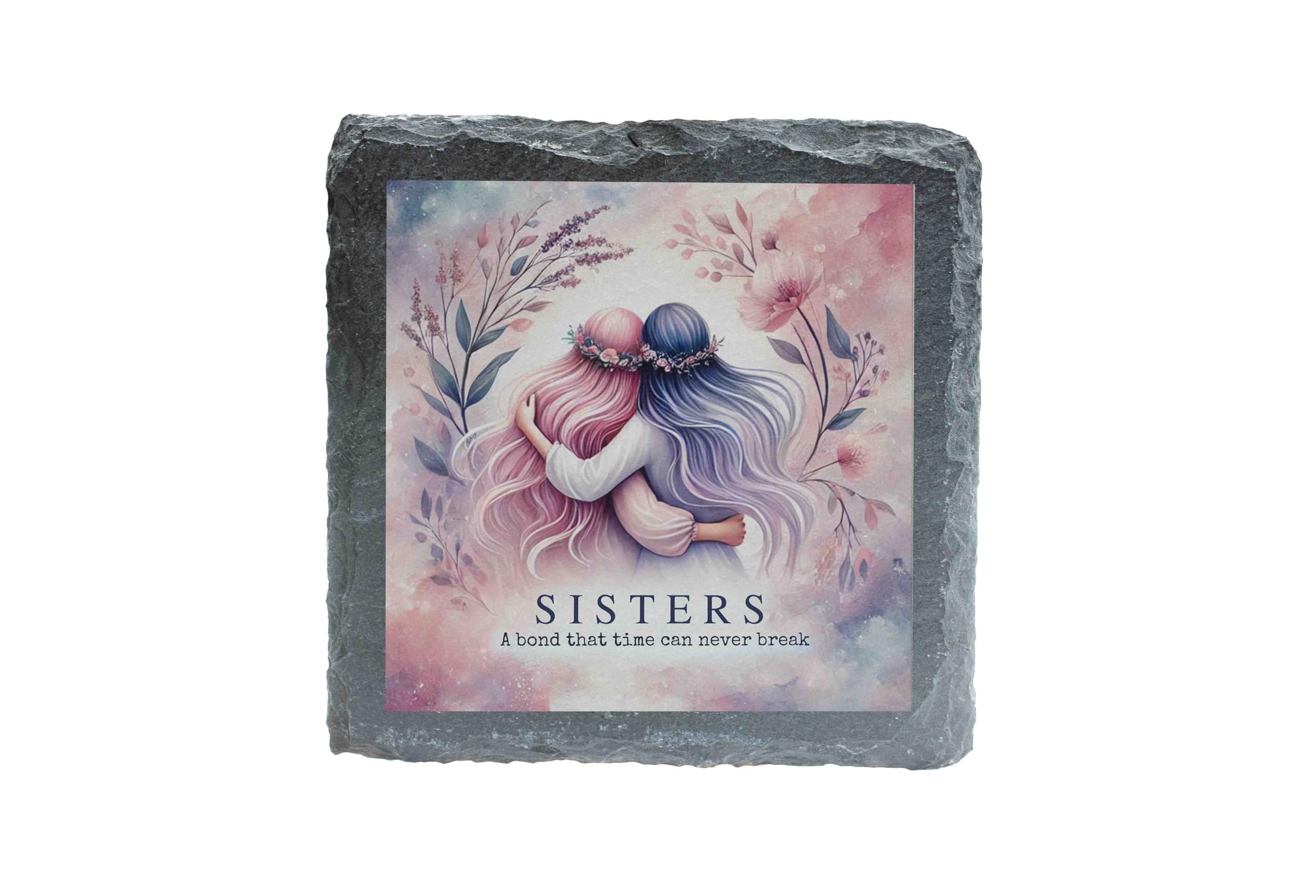 Celebrate the timeless connection between sisters with this beautiful slate coaster. Featuring an elegant design of two sisters in a loving embrace and a meaningful quote, this piece is both functional and sentimental. Crafted from durable natural slate, it adds a touch of rustic elegance to any space. The non-slip backing ensures your furniture is protected, making it perfect for everyday use. Whether you're gifting it to your sister or adding it to your own collection, this coaster is a lovely reminder of the unbreakable bond shared between siblings.