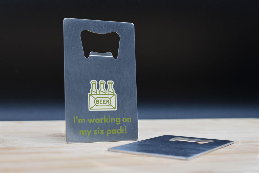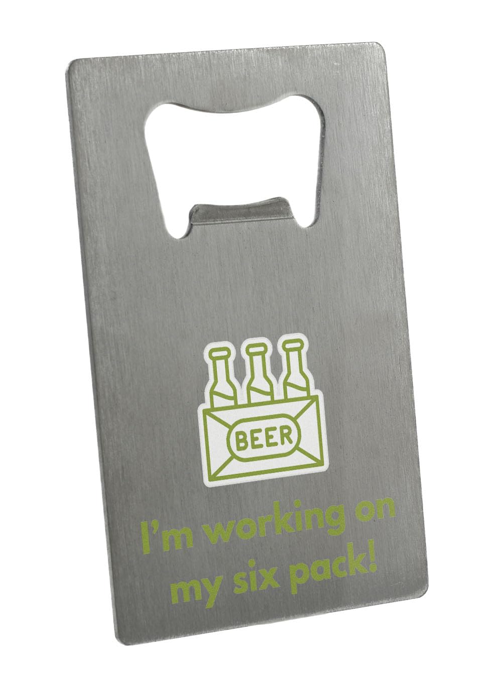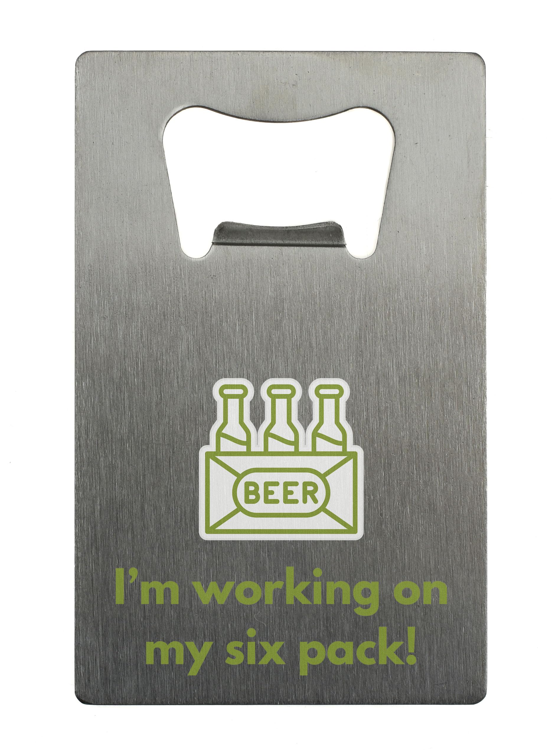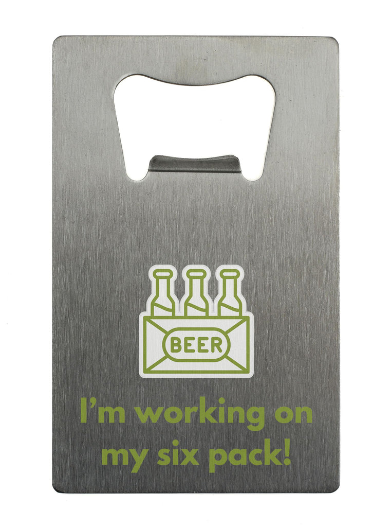 - Stainless steel bottle opener with a UV printed design that reads 'I'm working on my six pack'