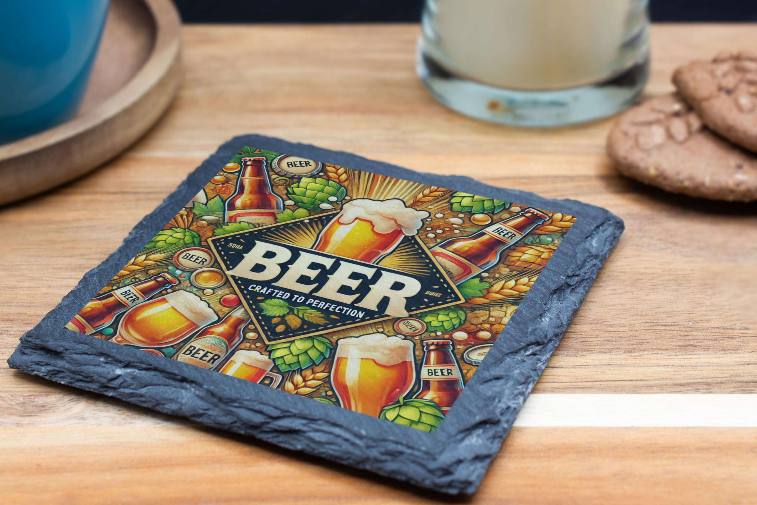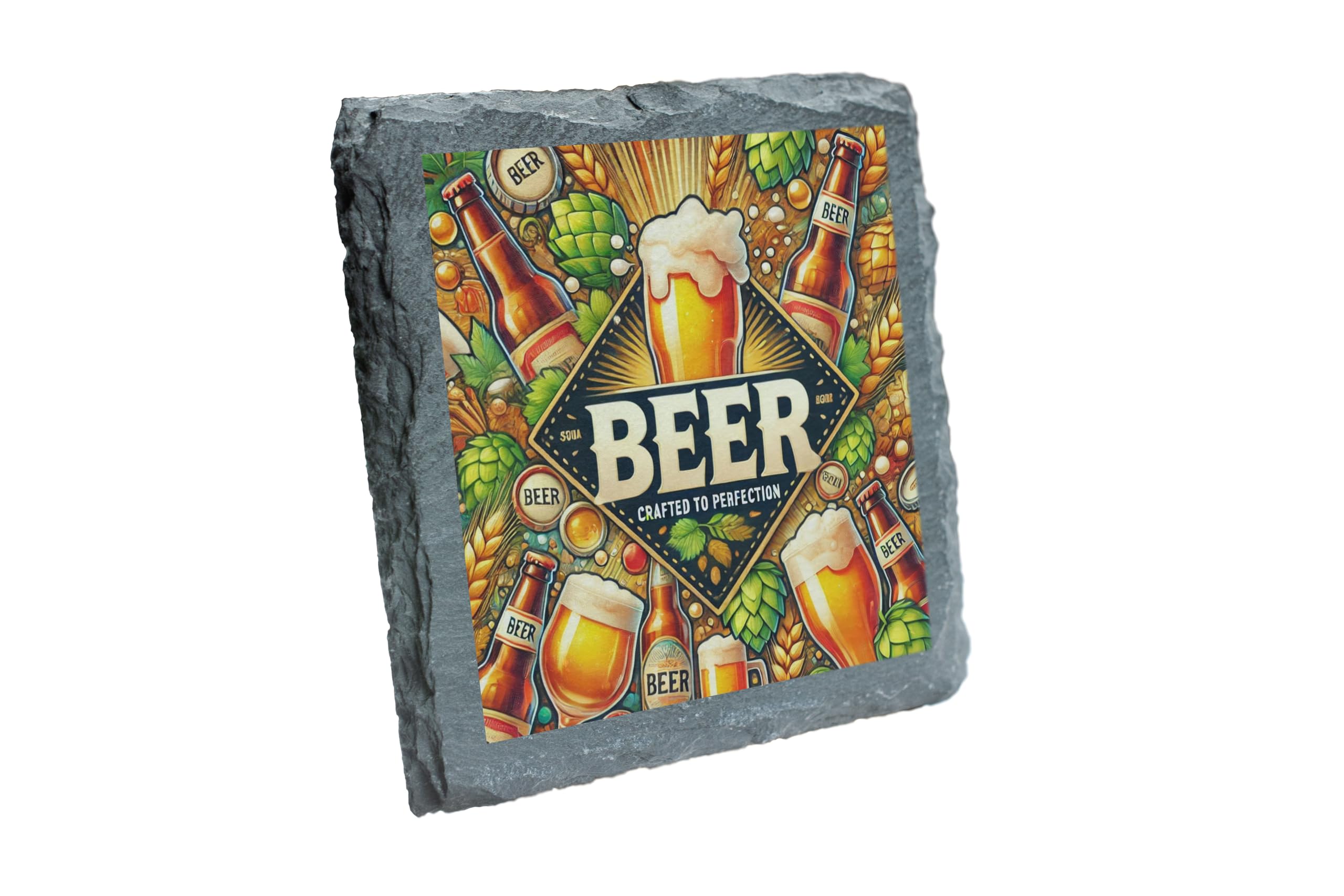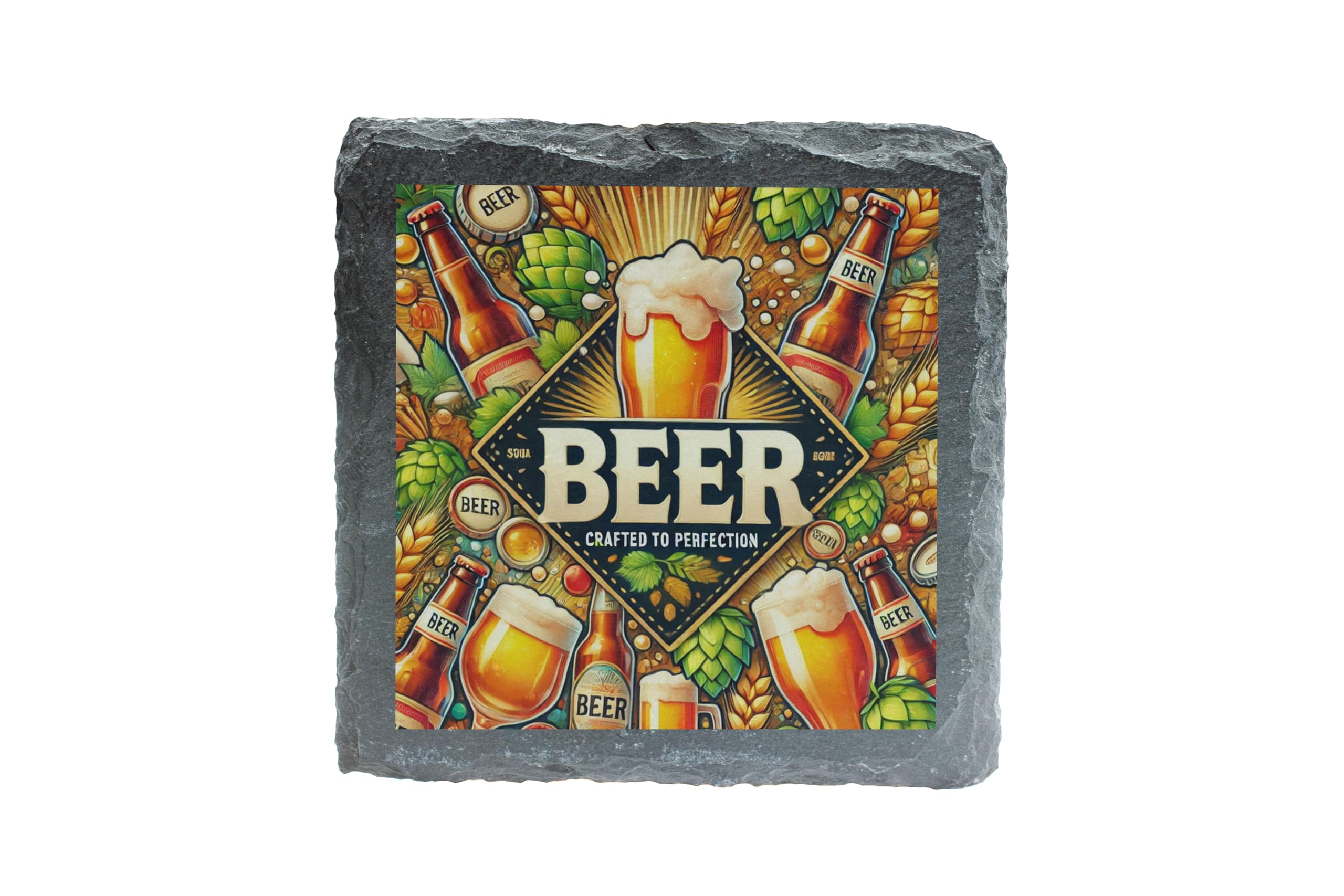 Raise a toast to great taste with this "Beer: Crafted to Perfection" slate coaster. Featuring a vibrant design of beer mugs, hops, and bottles, this coaster is perfect for beer lovers and home brewers alike. Handcrafted from durable natural slate, it combines rustic elegance with practicality, making it an ideal accessory for your home bar or man cave. Whether you're enjoying a cold brew or hosting a beer-tasting party, this coaster adds a decorative yet functional touch to your space. A great gift for anyone who appreciates the art of brewing!