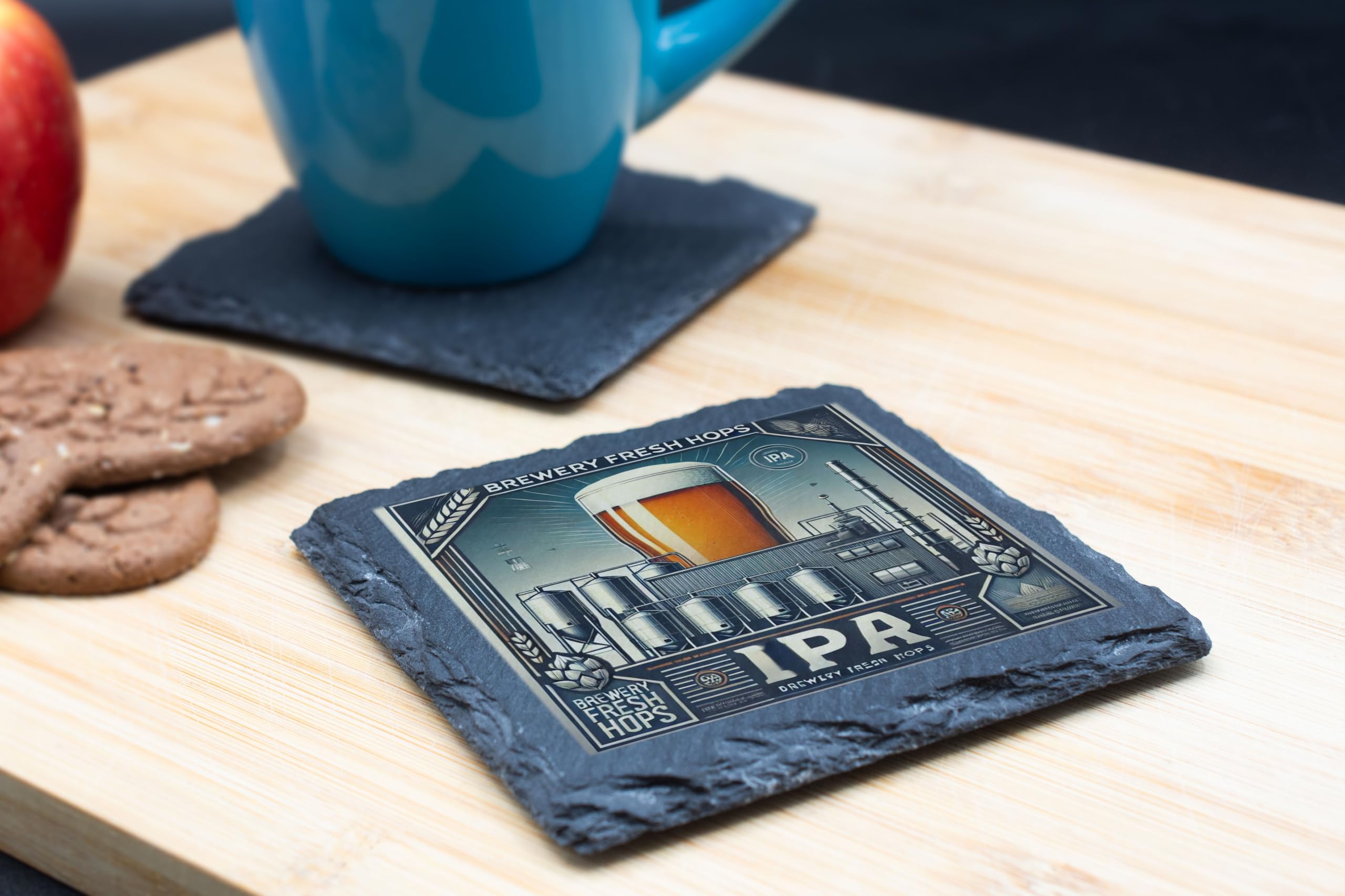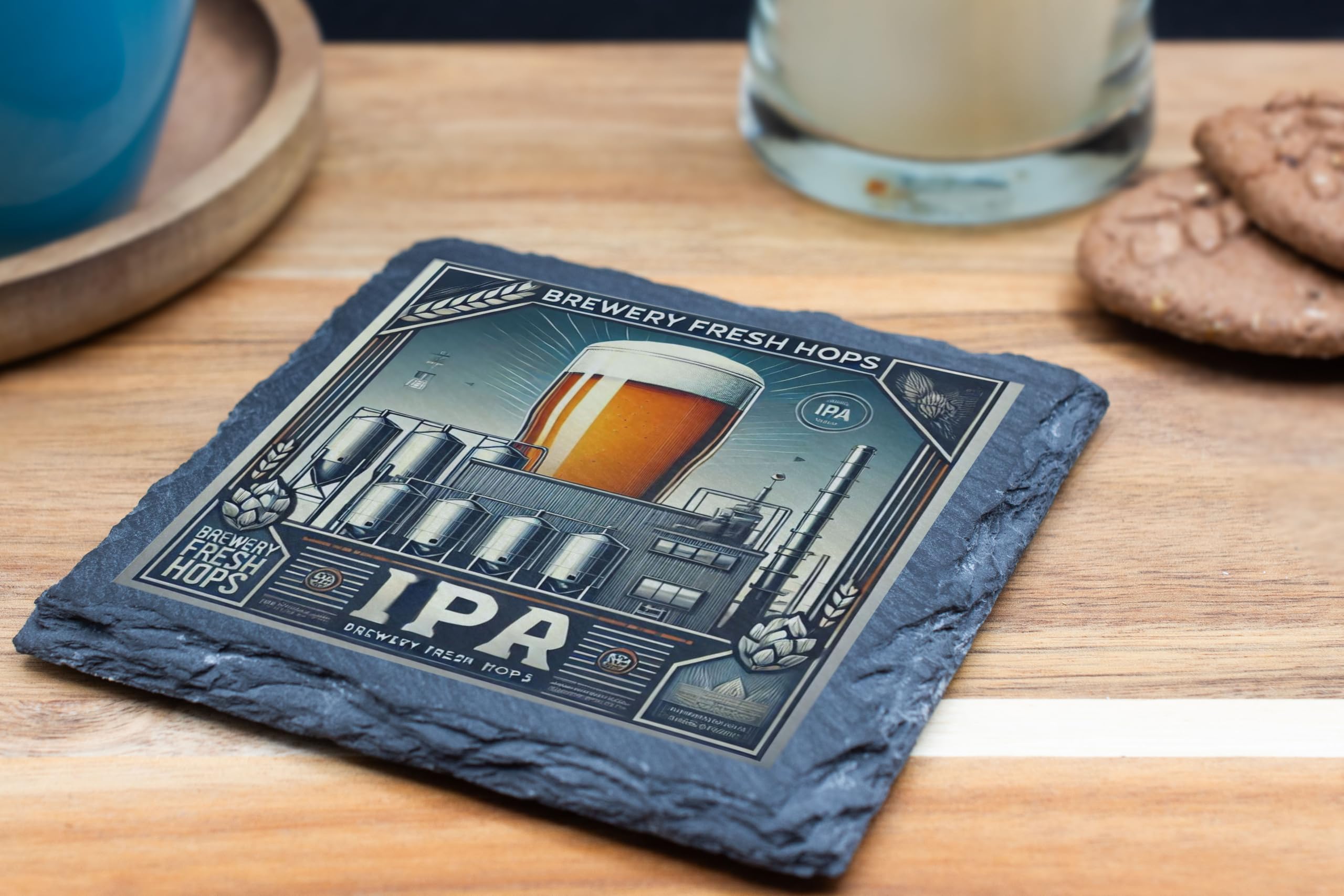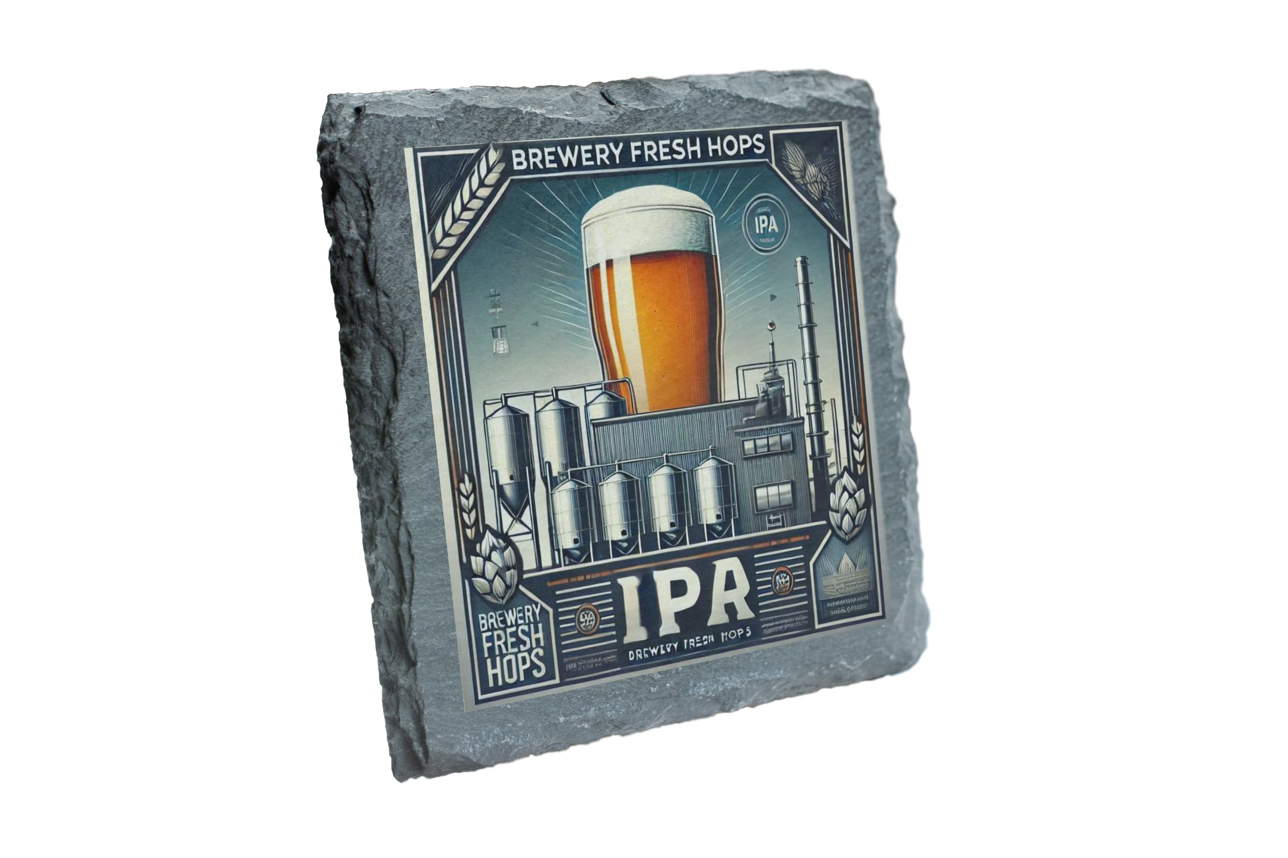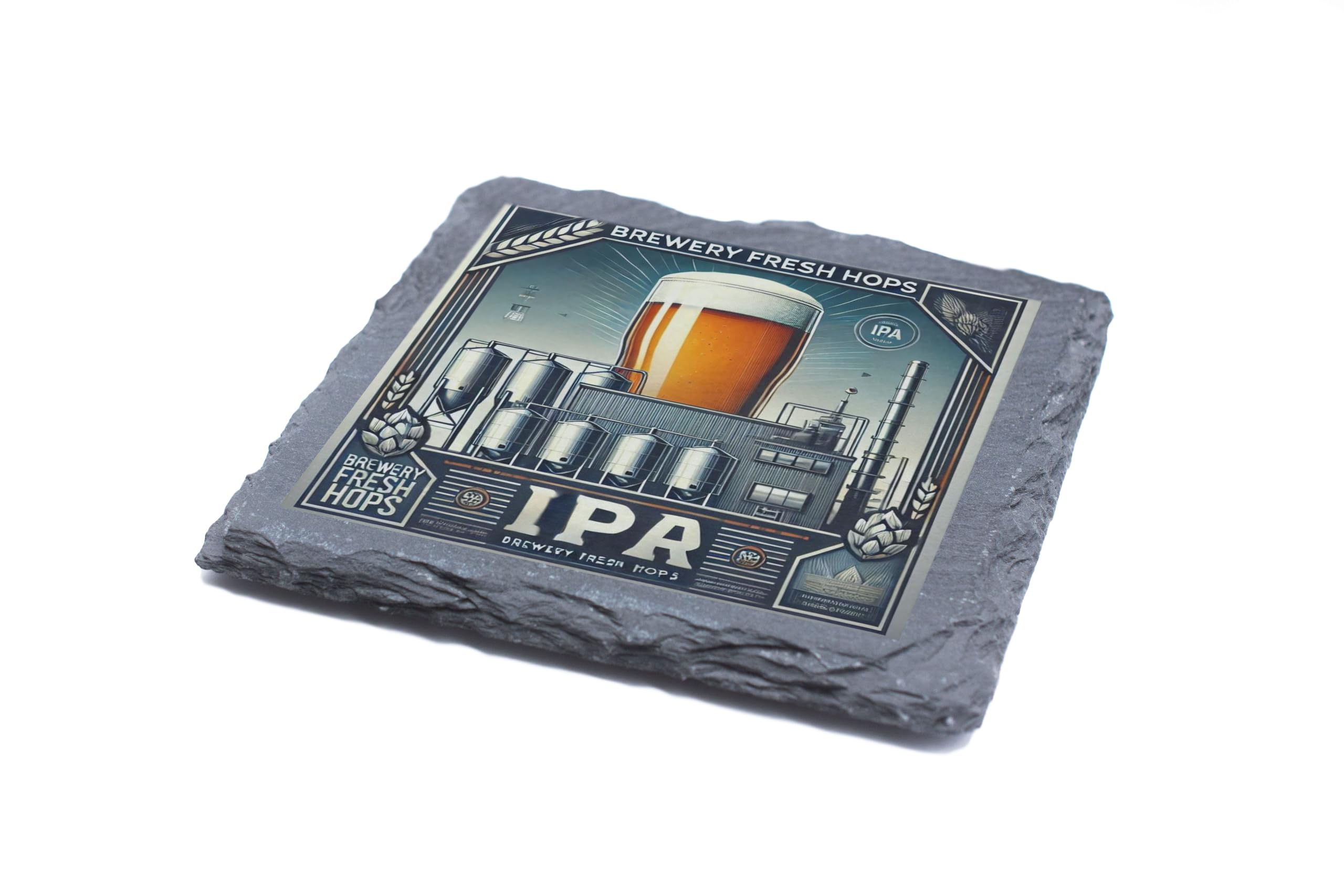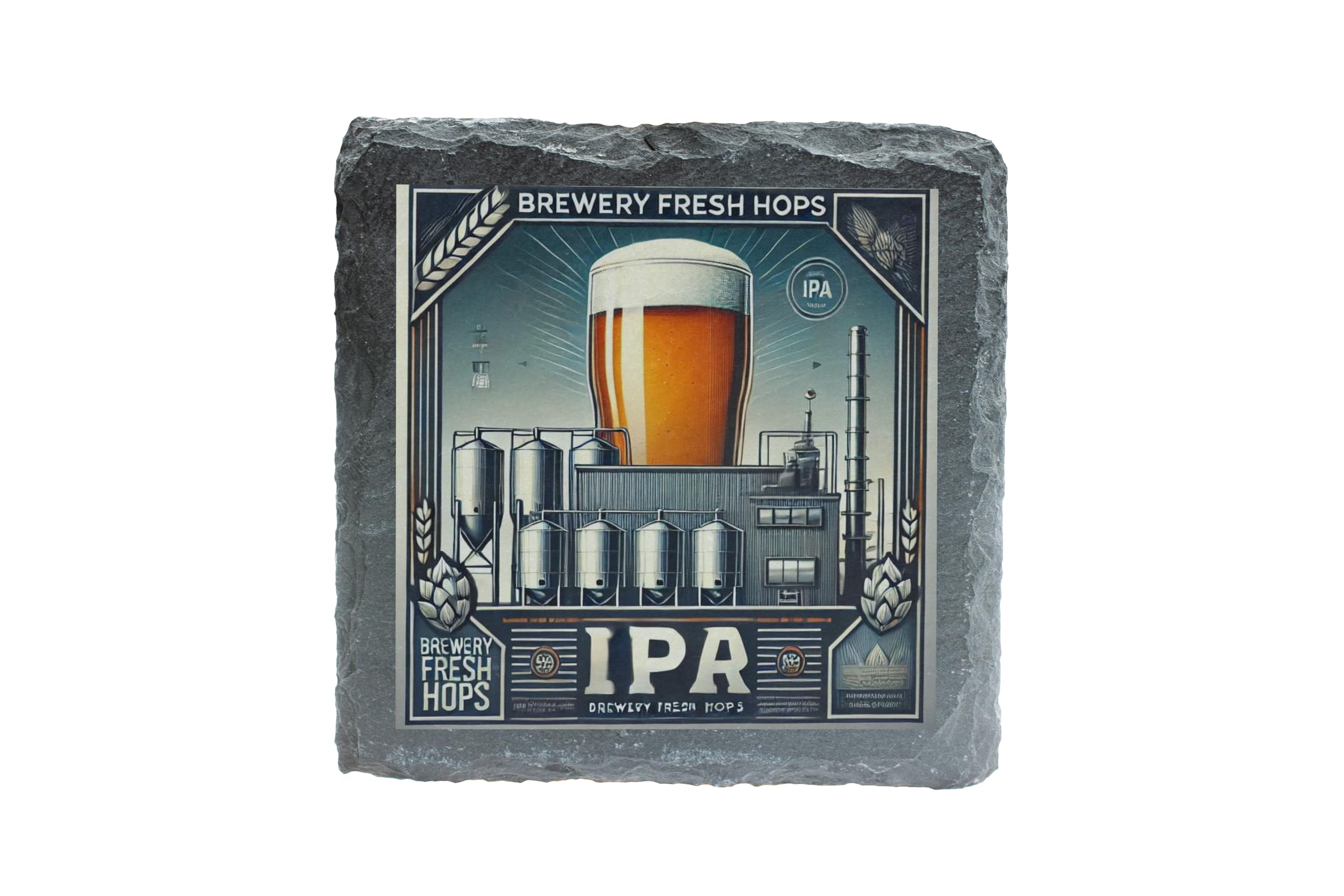 Celebrate the essence of craft brewing with this "Brewery Fresh IPA" slate coaster. Its intricate design showcases a brewery-inspired theme, complete with beer tanks, hops, and a frothy pint of IPA, making it a must-have for beer enthusiasts. Made from natural slate, this coaster combines rustic charm with durability. Whether you're hosting a beer-tasting party, enjoying a casual drink, or decorating your home bar, this coaster will be a standout piece. A perfect gift for craft beer aficionados, homebrewers, or anyone who appreciates the art of brewing.